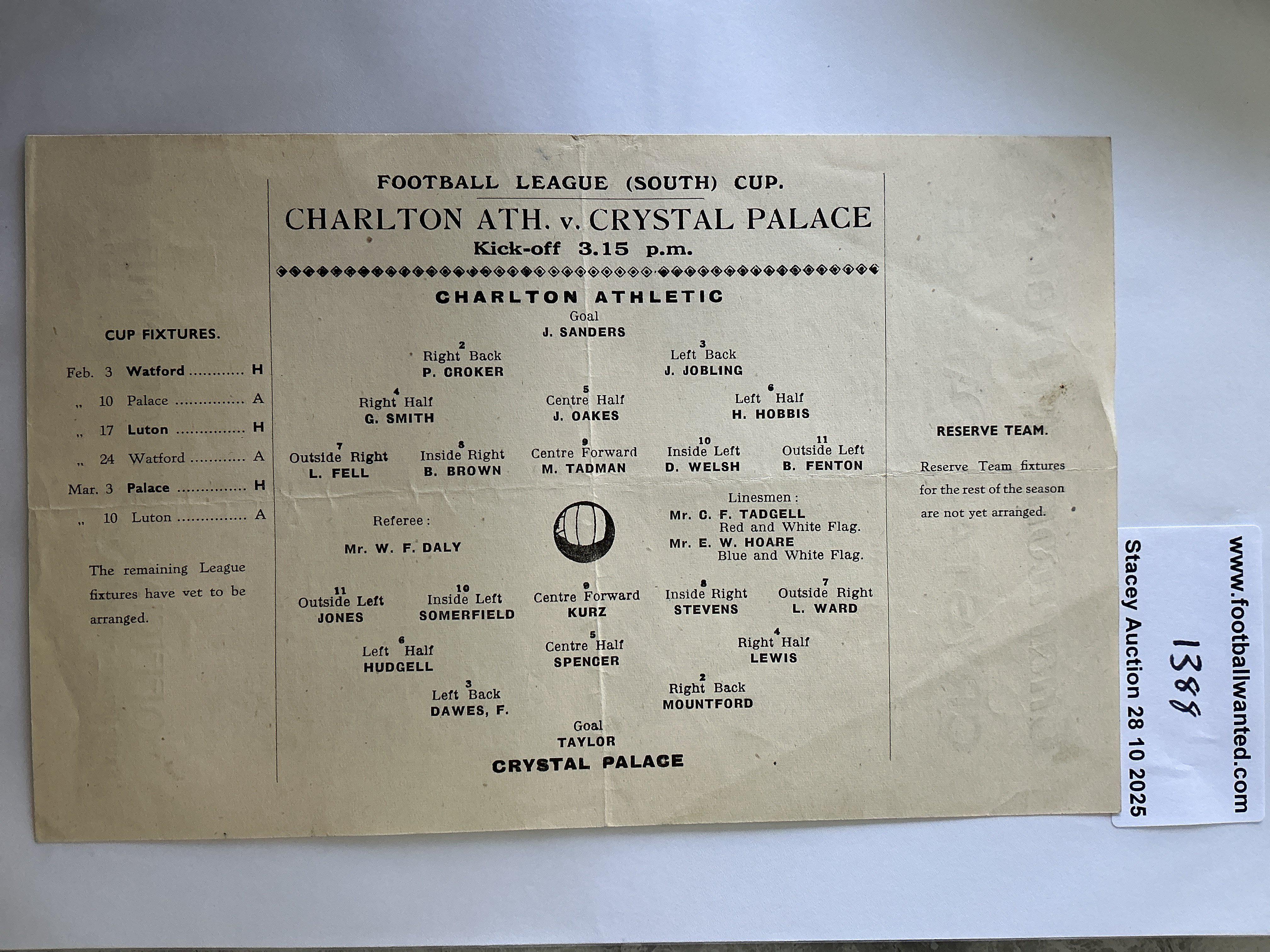 44/45 Charlton v Crystal Palace Football Programme: Good condition single sheet League Cup South programme with no team changes. Fold.