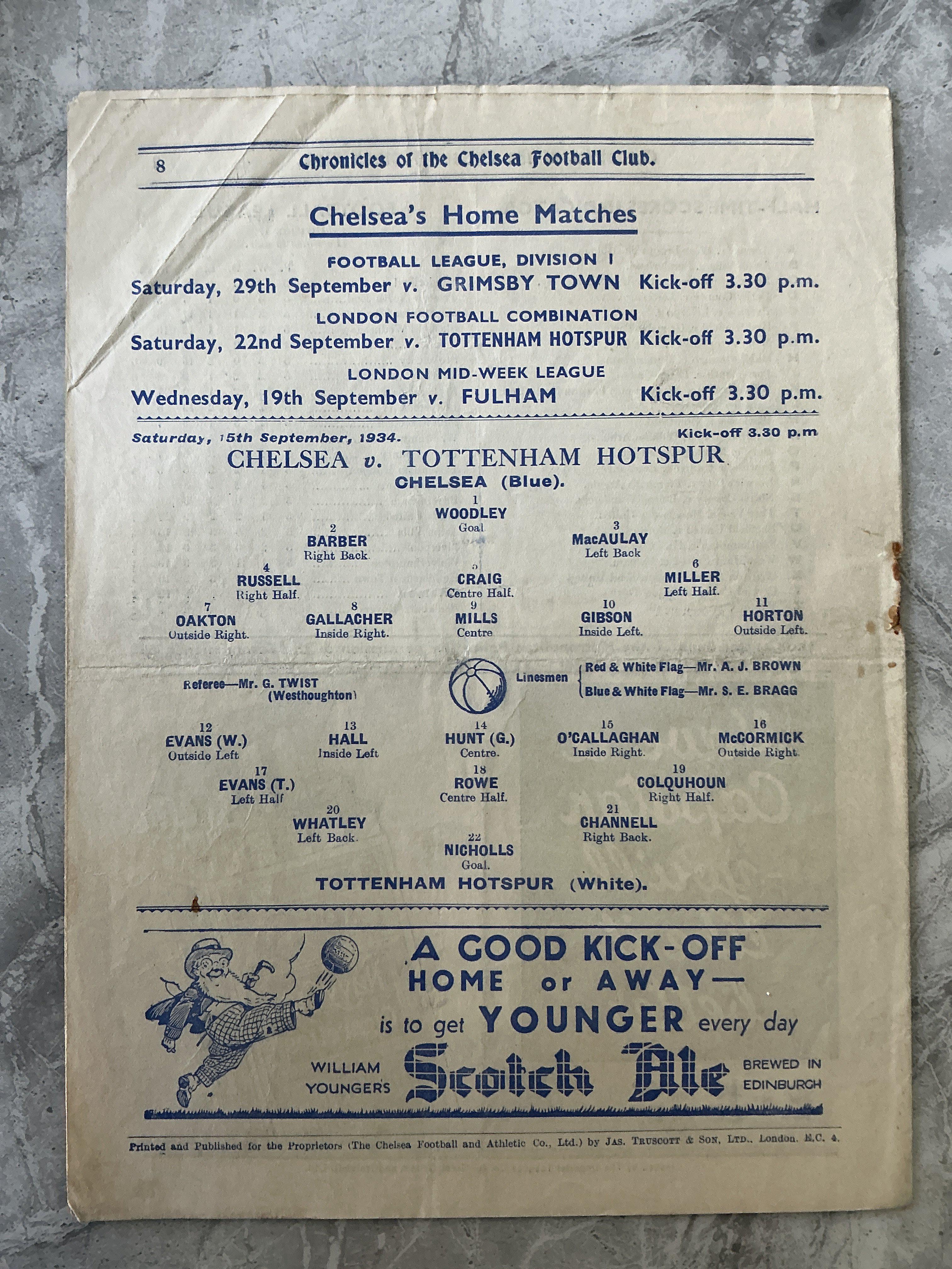 34/35 Chelsea v Tottenham Football Programme: Fair condition 8 page League programme with no team changes. Staple rotted away leaving hole.
