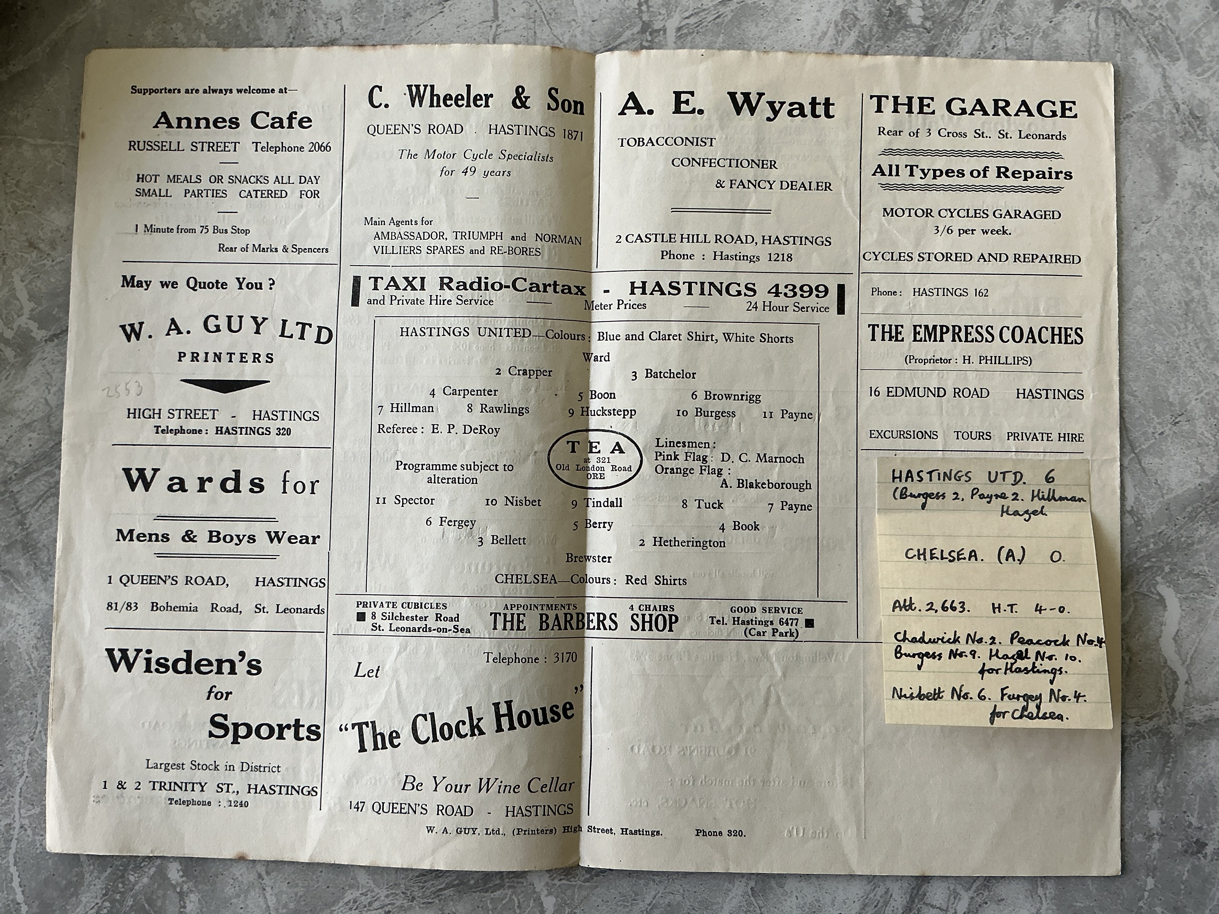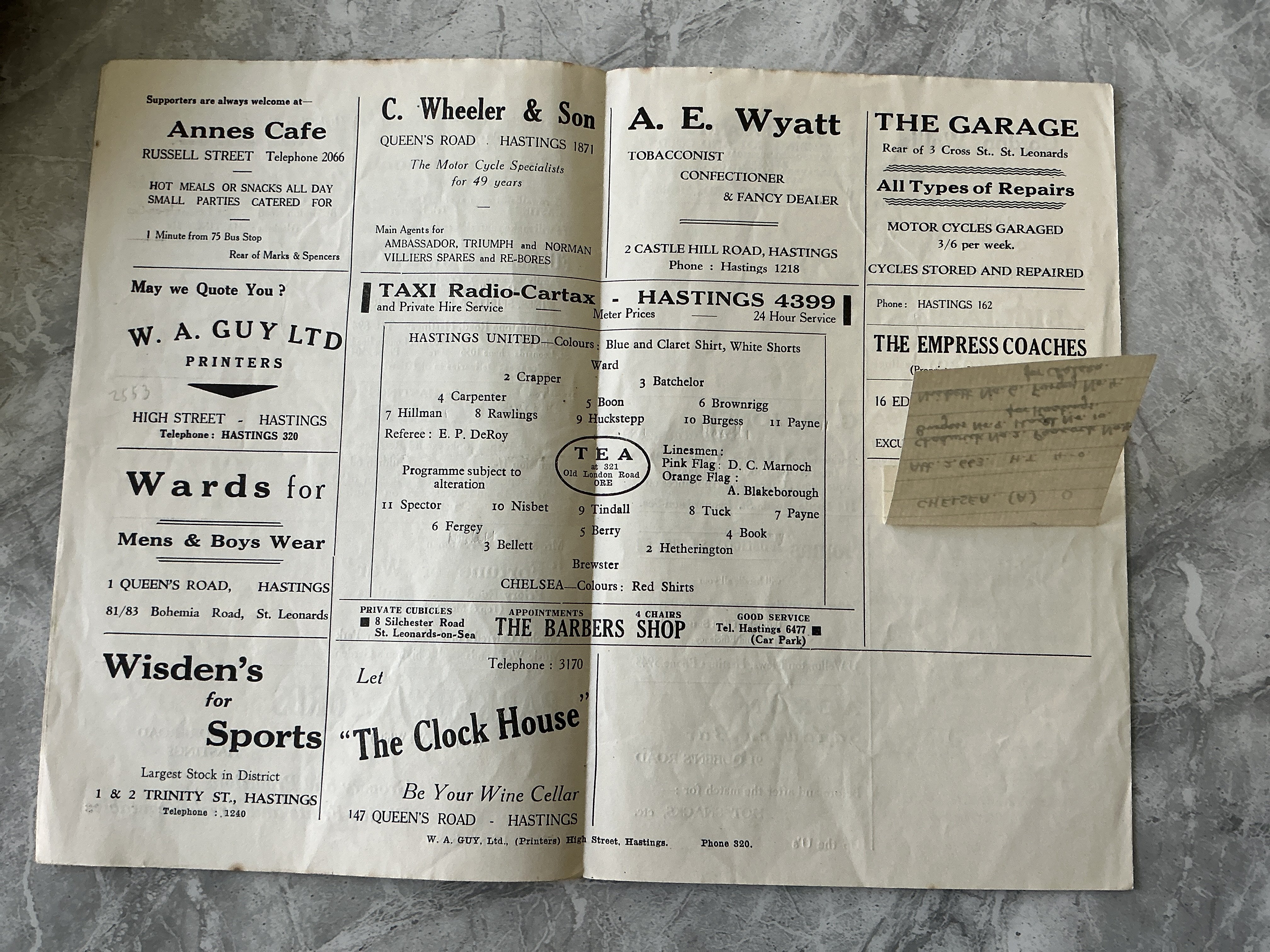 54/55 Hastings United v Chelsea Football Programme: Very good condition 8 page Metropolitan League programme with no team changes. Hand written match report lightly attached inside. Famous season for Chelsea.