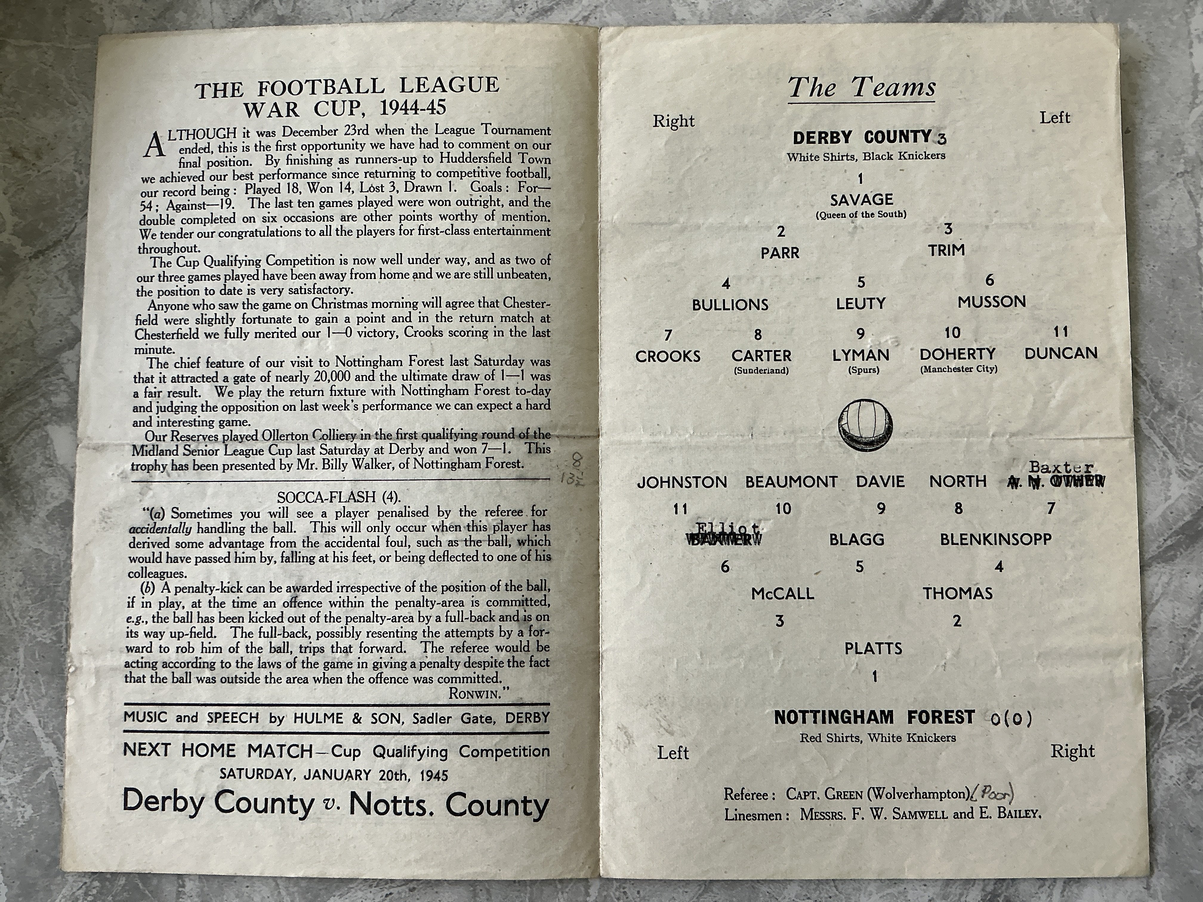44/45 Derby County v Notts Forest Football Programme: Good condition War Cup programme with team changes. Score in pencil to cover.