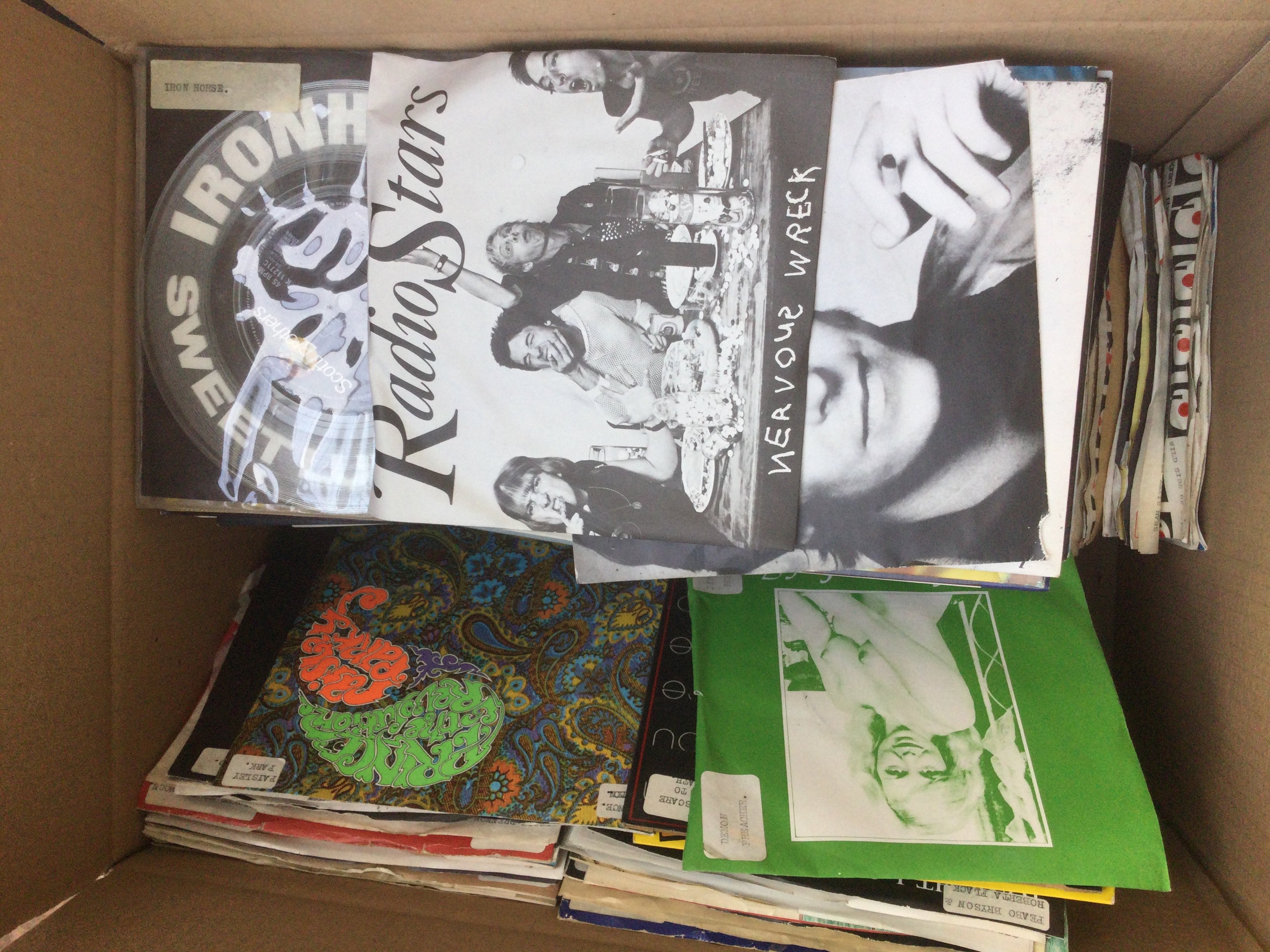 A box of 7" singles by various artists including Kate Bush, The Jam, Bauhaus, PiL and many more.