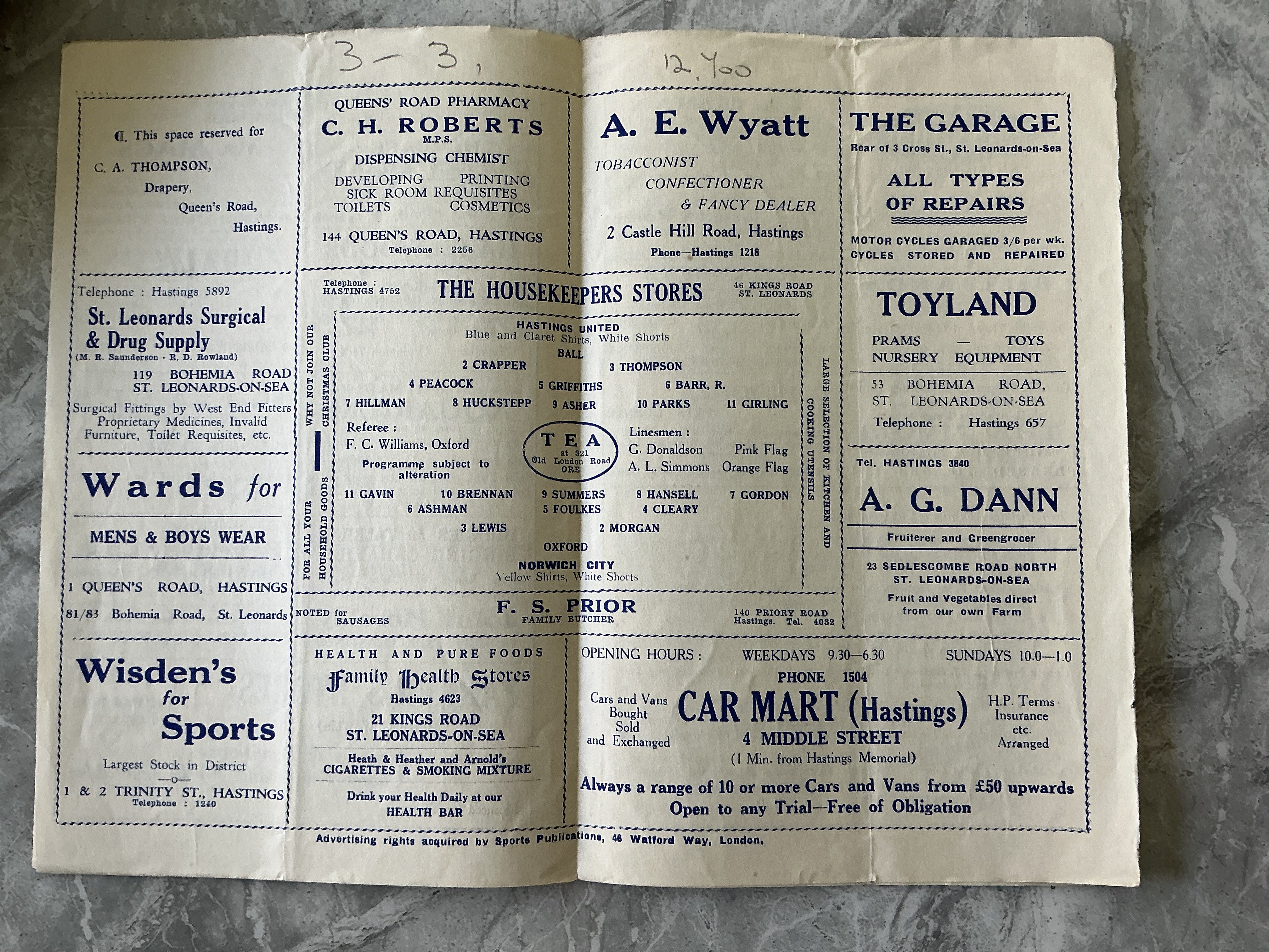 52/53 Hastings United v Norwich City Football Programme: Excellent condition FA Cup programme with no team changes. Lightest fold.