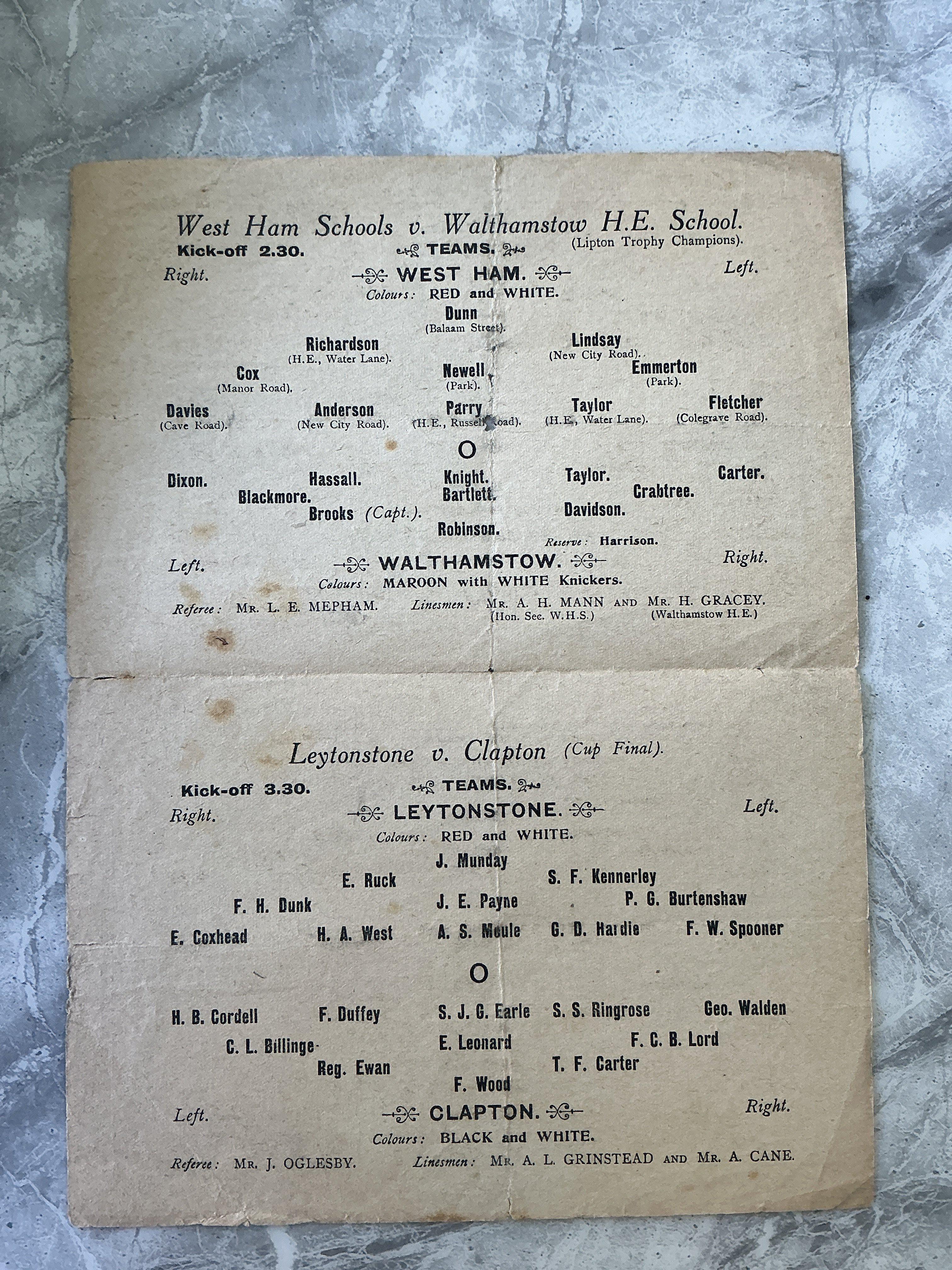 1918 - 1919 West Ham Charity Cup Final Football Programme: Leytonstone v Clapton final with programme doubling up as West Ham v Walthamstow Schools. Fair condition with no team changes. Wear to folding and a couple of small tears.