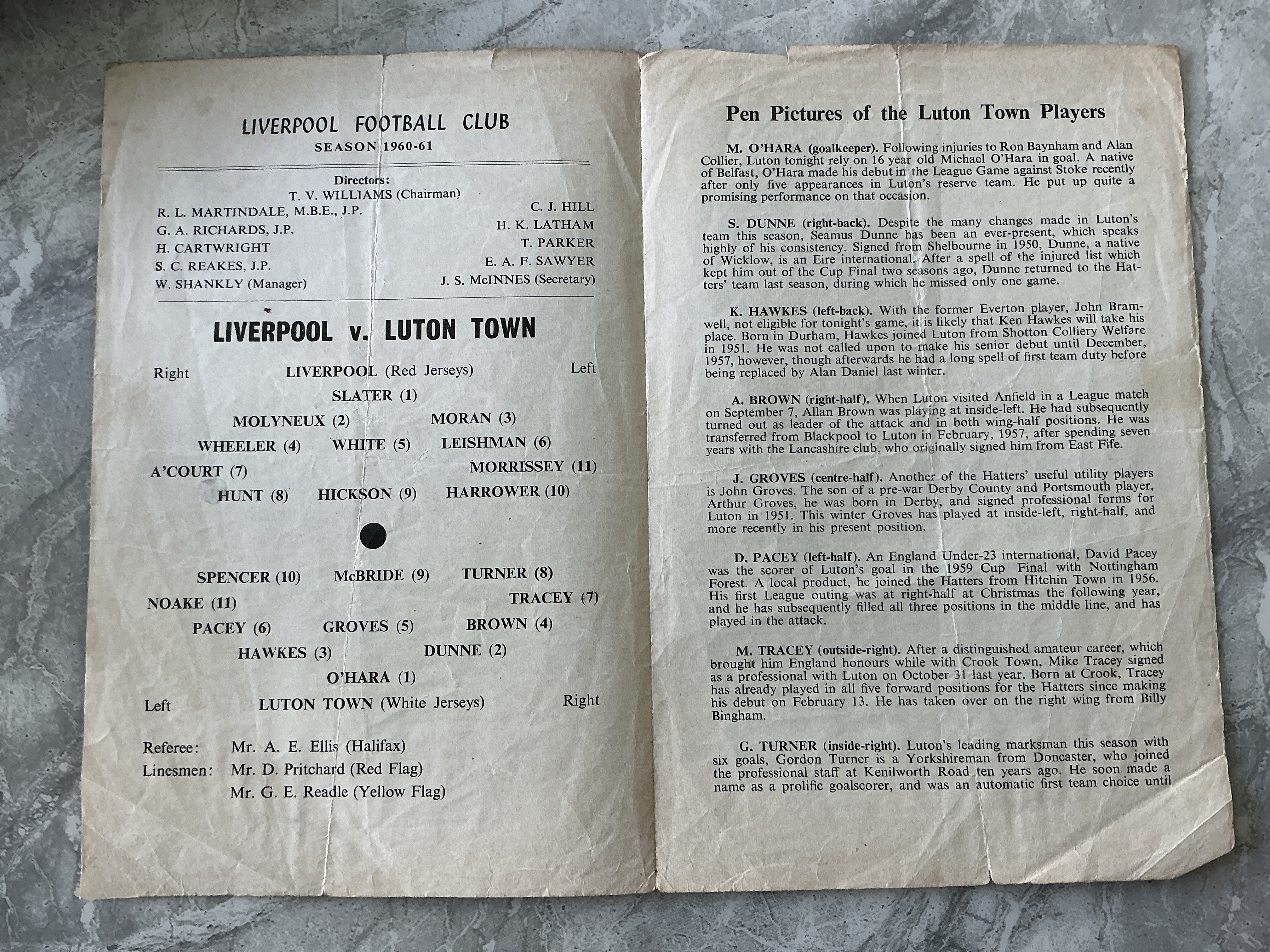 60/61 Liverpool v Luton League Cup Football Programme: Fair/good condition 1st division programme with no team changes. Folding. Token intact. First ever match for Liverpool in the League Cup a competition they have won more than any other team.