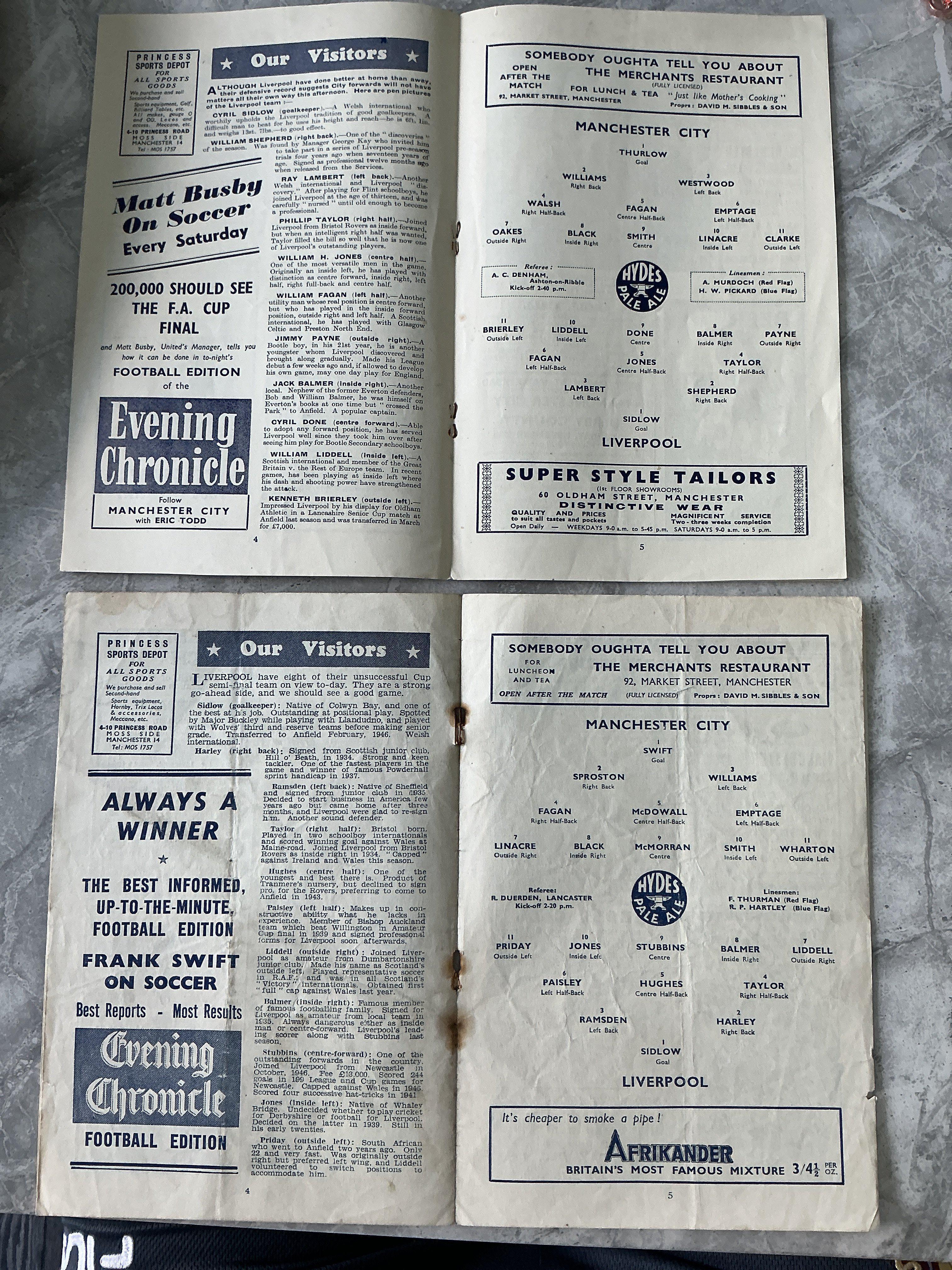1940s Manchester City v Liverpool Football Programmes: 47/48 has rusty staples that have rotted away and a split spine. 48/49 is excellent with no team changes. (2)