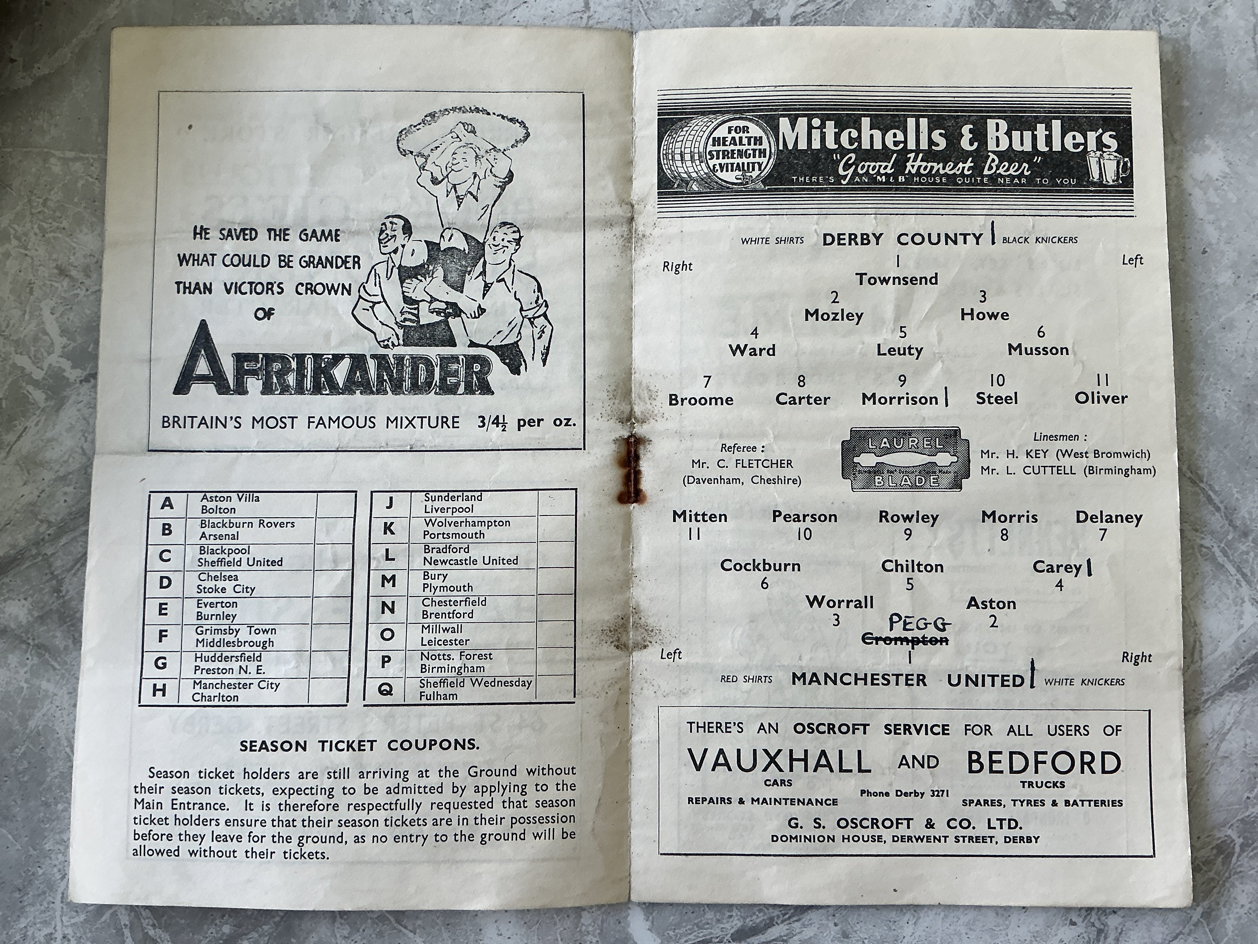 47/48 Derby County v Manchester United Football Programme: Good condition 1st division programme with one team change. Rusty staples holding firm.