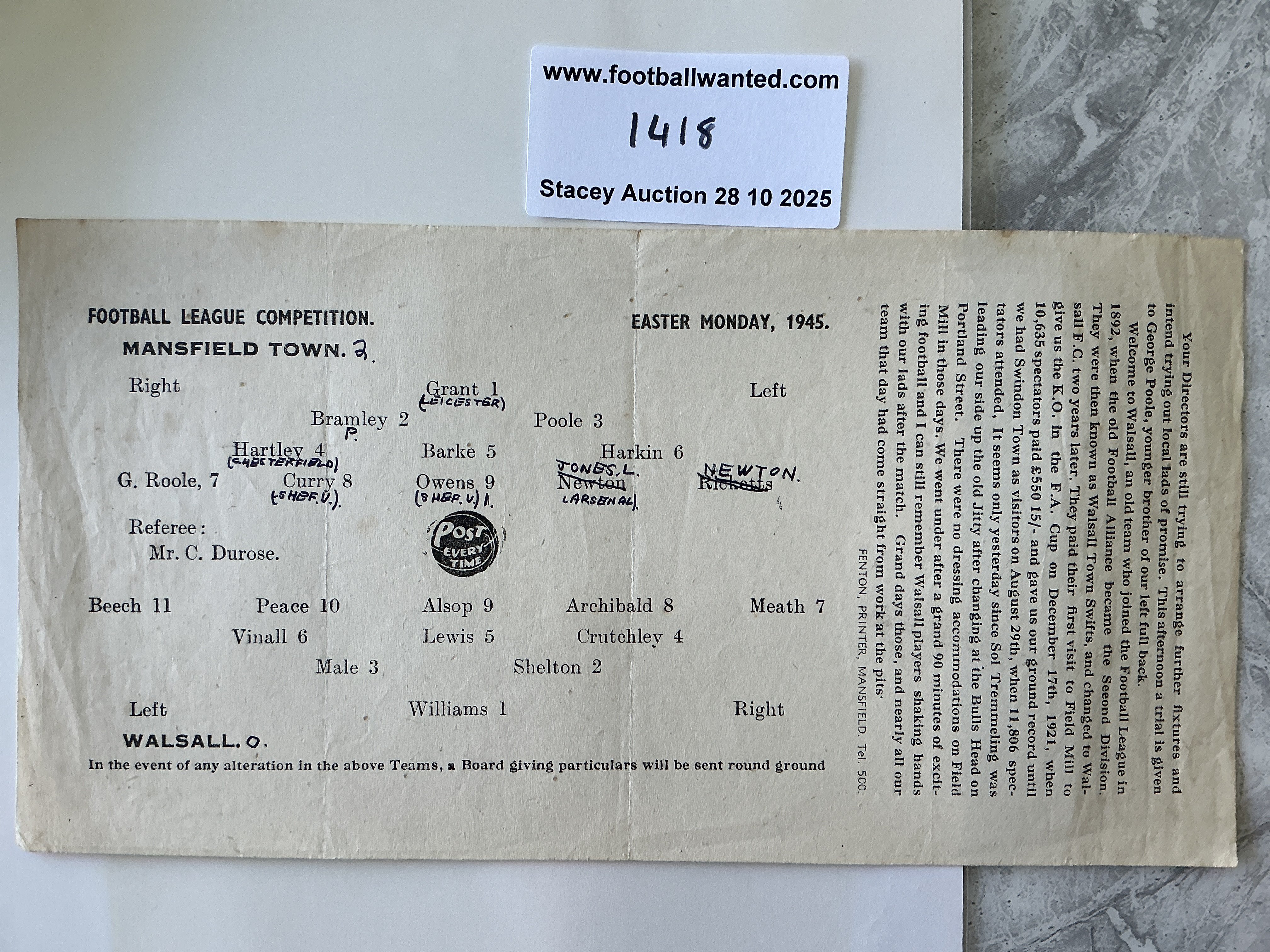 44/45 Mansfield Town v Walsall Football Programme: Very good condition League programme with team changes. Single sheet with blank rear. Fold.