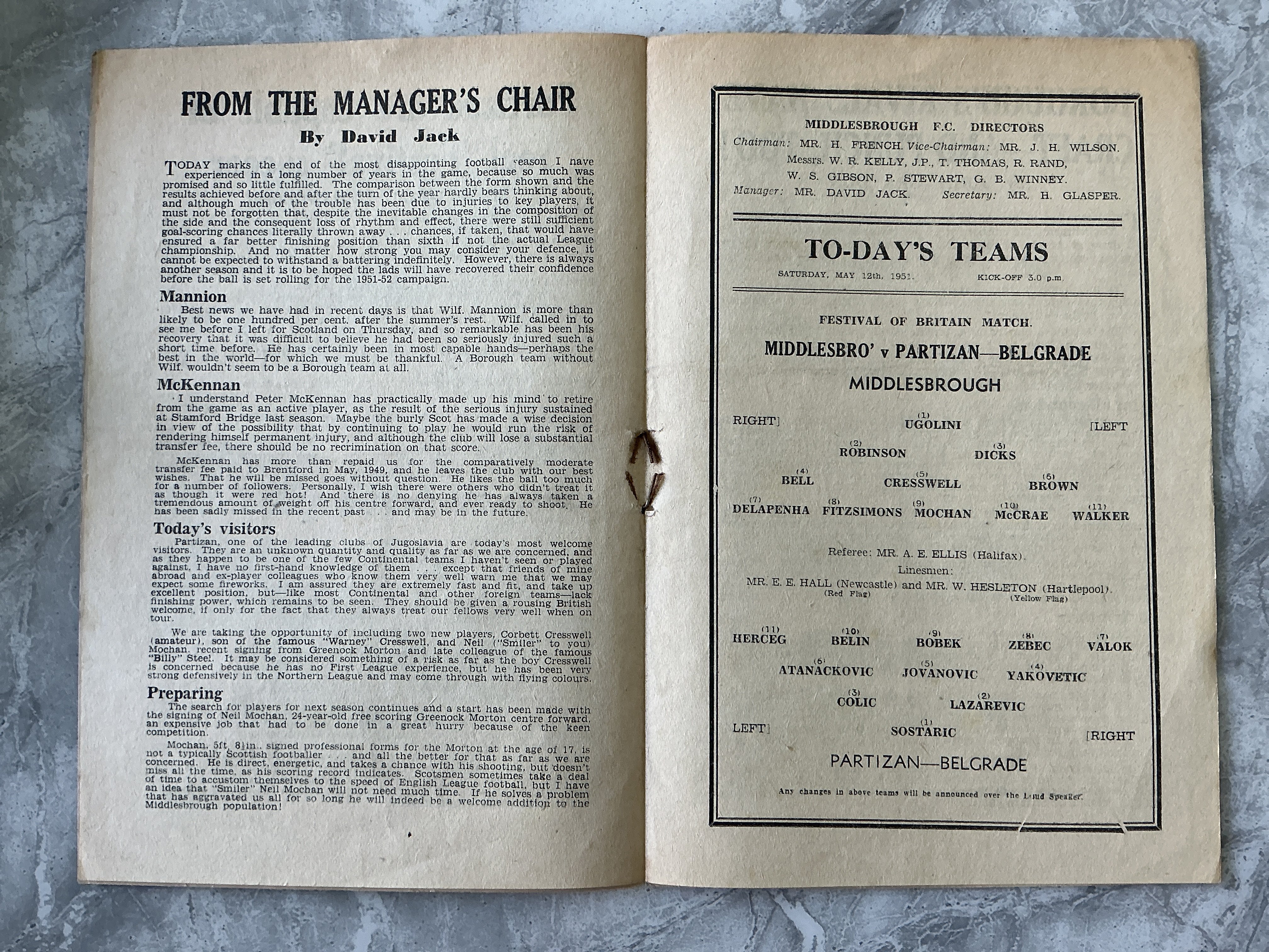 50/51 Middlesbrough Festival Of Britain Football Programme: Very good condition programme v Partizan Belgrade with no team changes. Rusty staples holding firm.