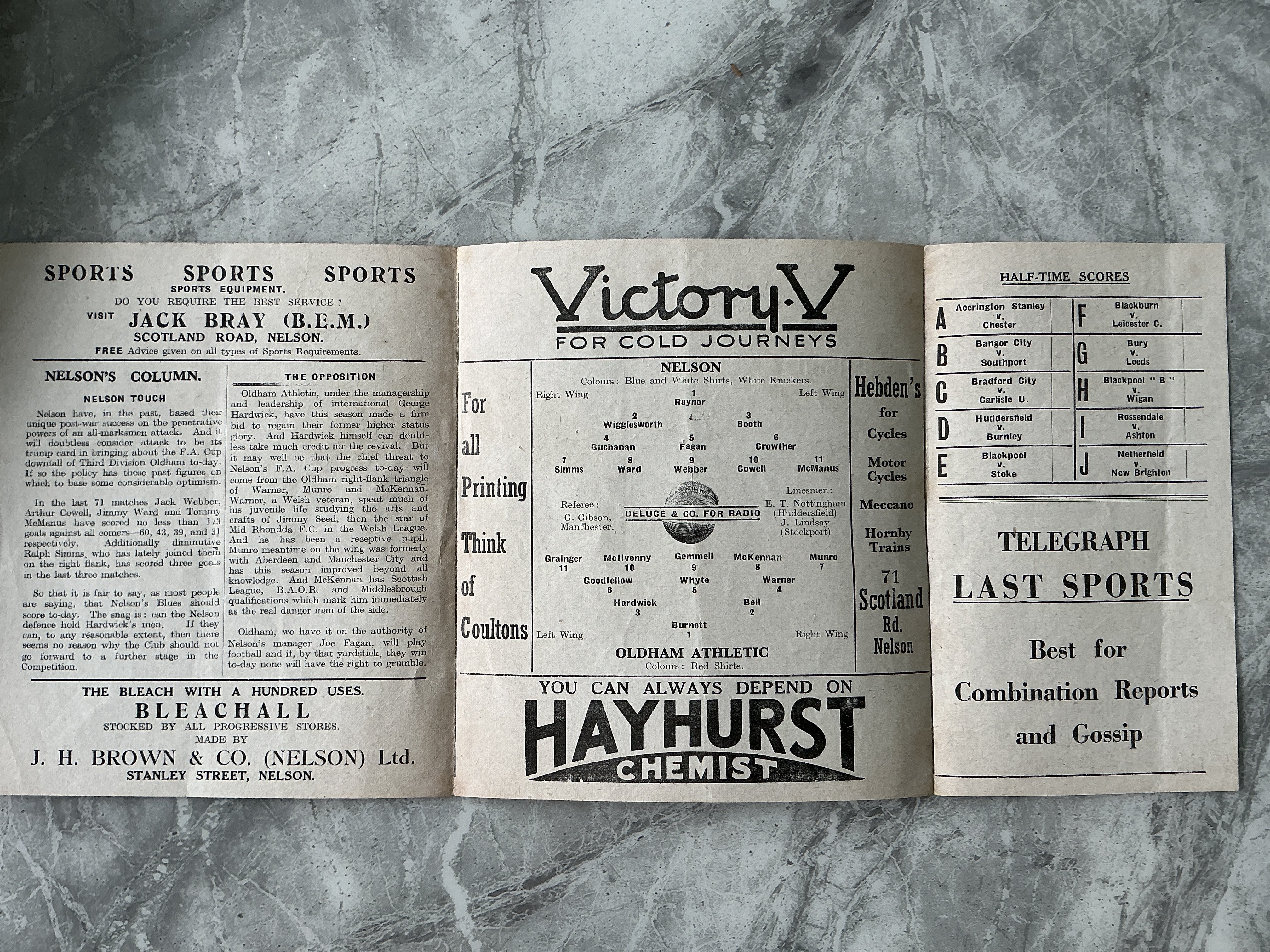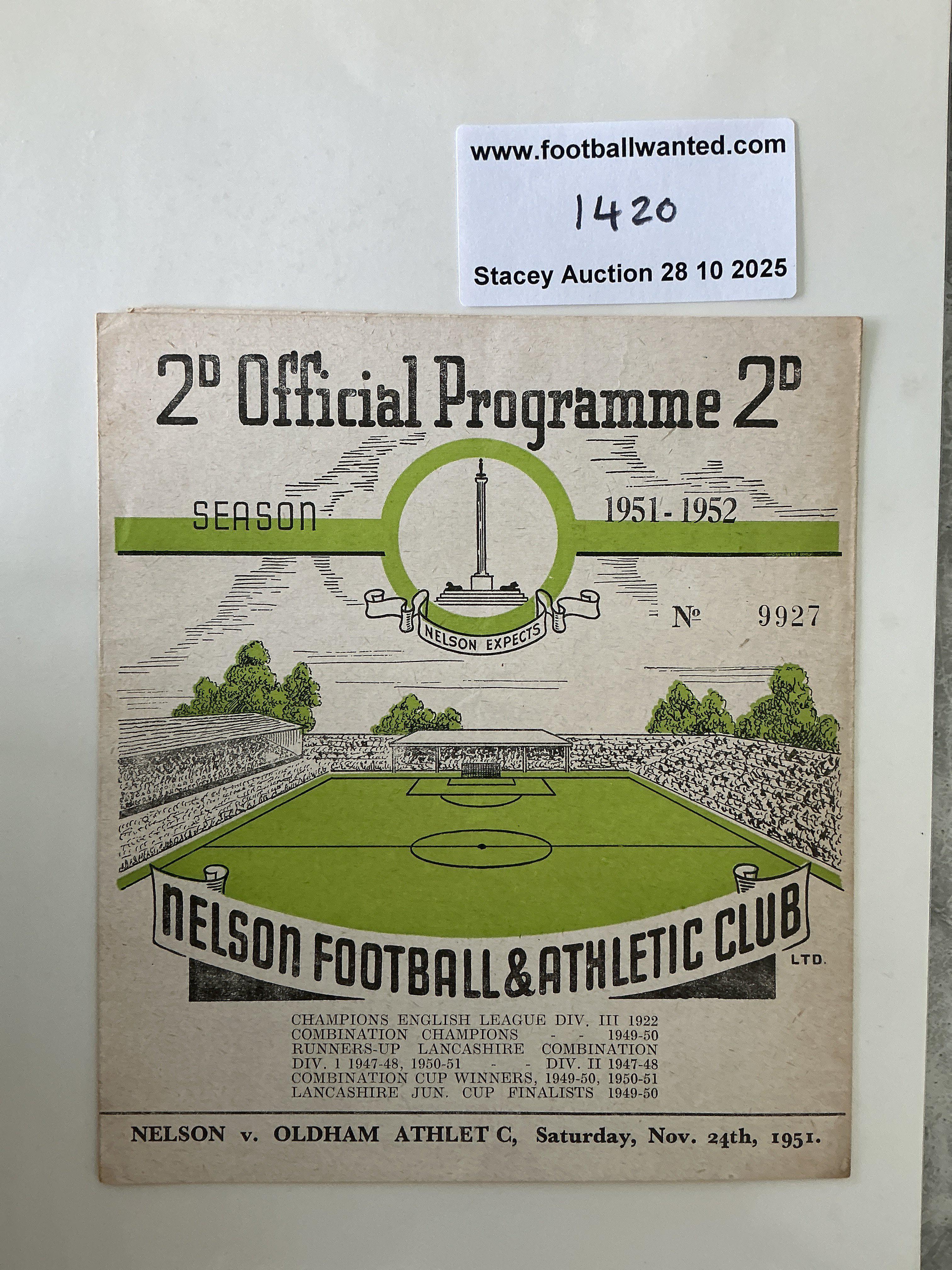 51/52 Nelson v Oldham FA Cup Football Programme: Very good condition gatefold programme with no team changes.