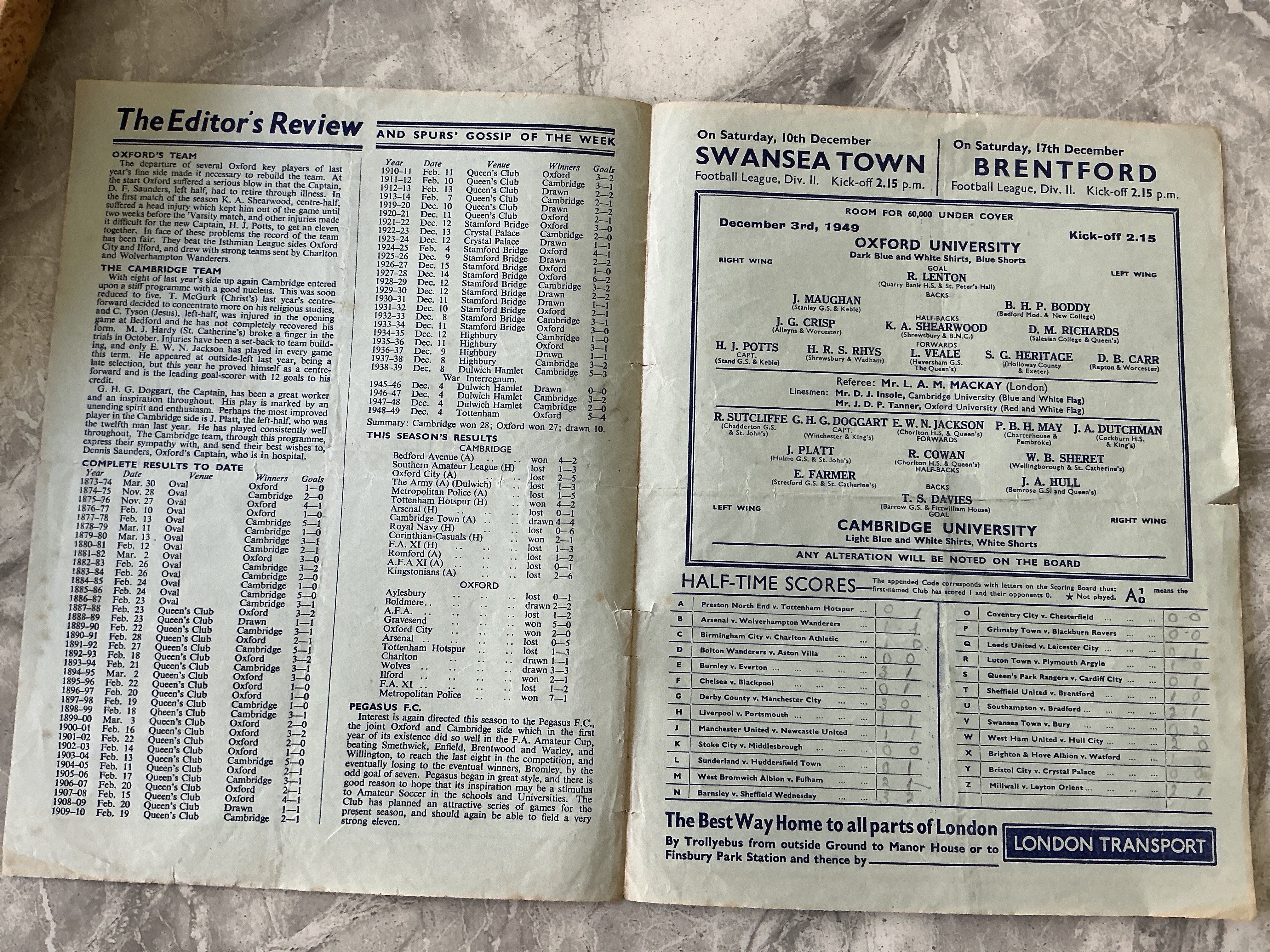49/50 Oxford v Cambridge At Tottenham Football Programme: Good condition university match programme with no team changes. Tiny tear to border and pencilled half times filled in.