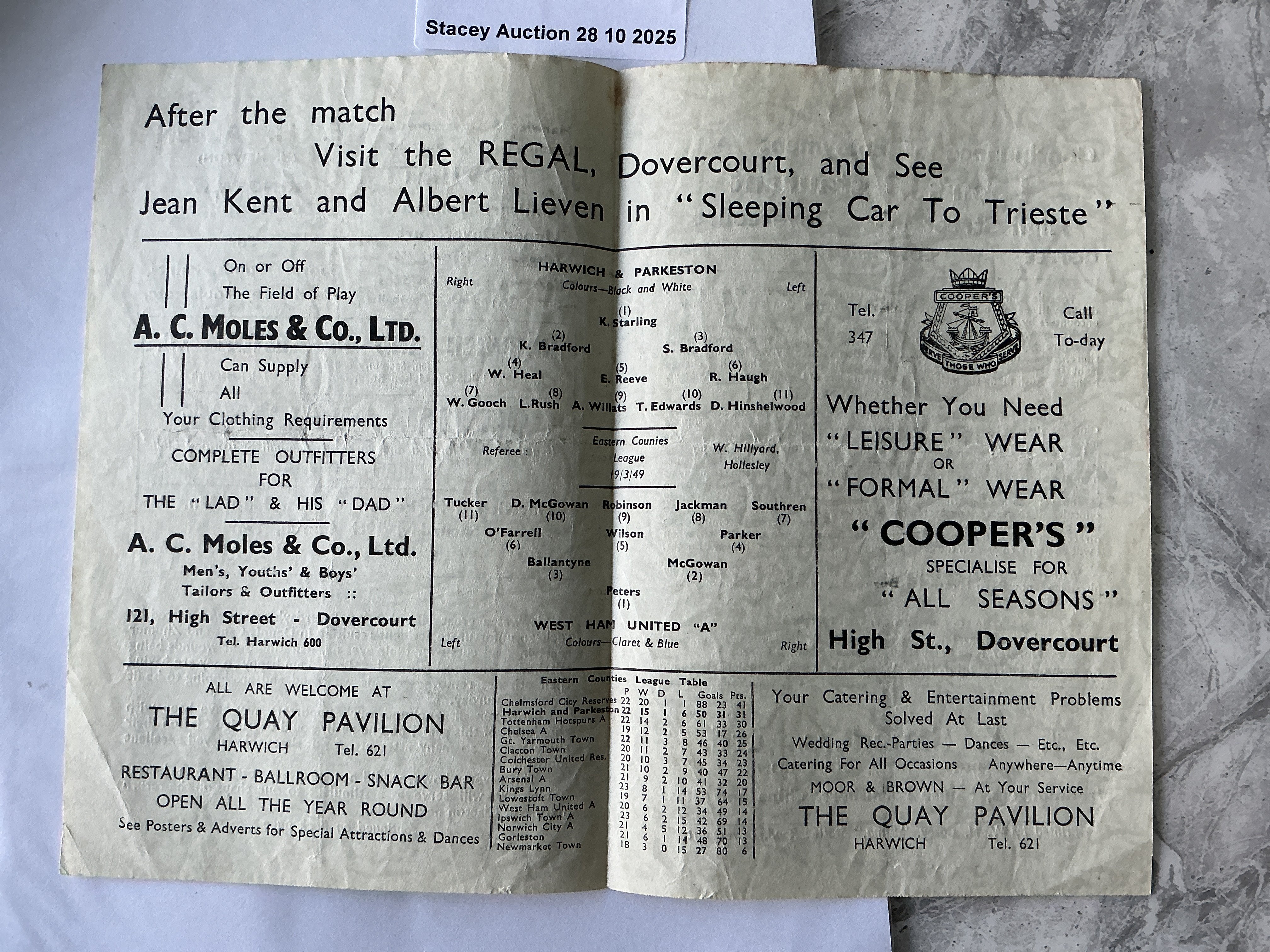 48/49 Harwich + Parkeston v West Ham A Football Programme: Very good condition Eastern Counties League programme with no team changes. Dated 19 3 1949.