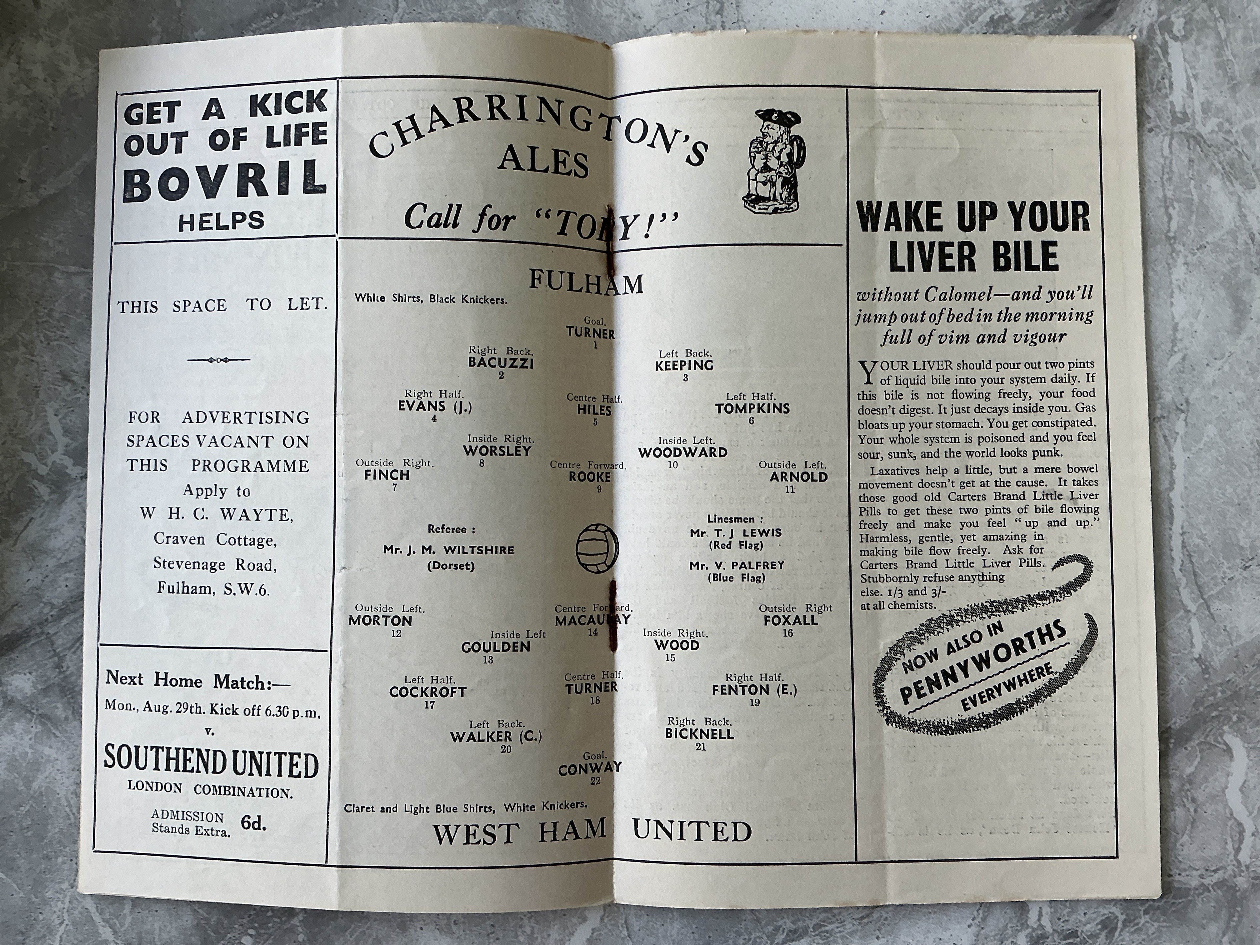 38/39 Fulham v West Ham Football Programme: Very good condition 2nd Division match with no team changes. Rusty staples holding firm.