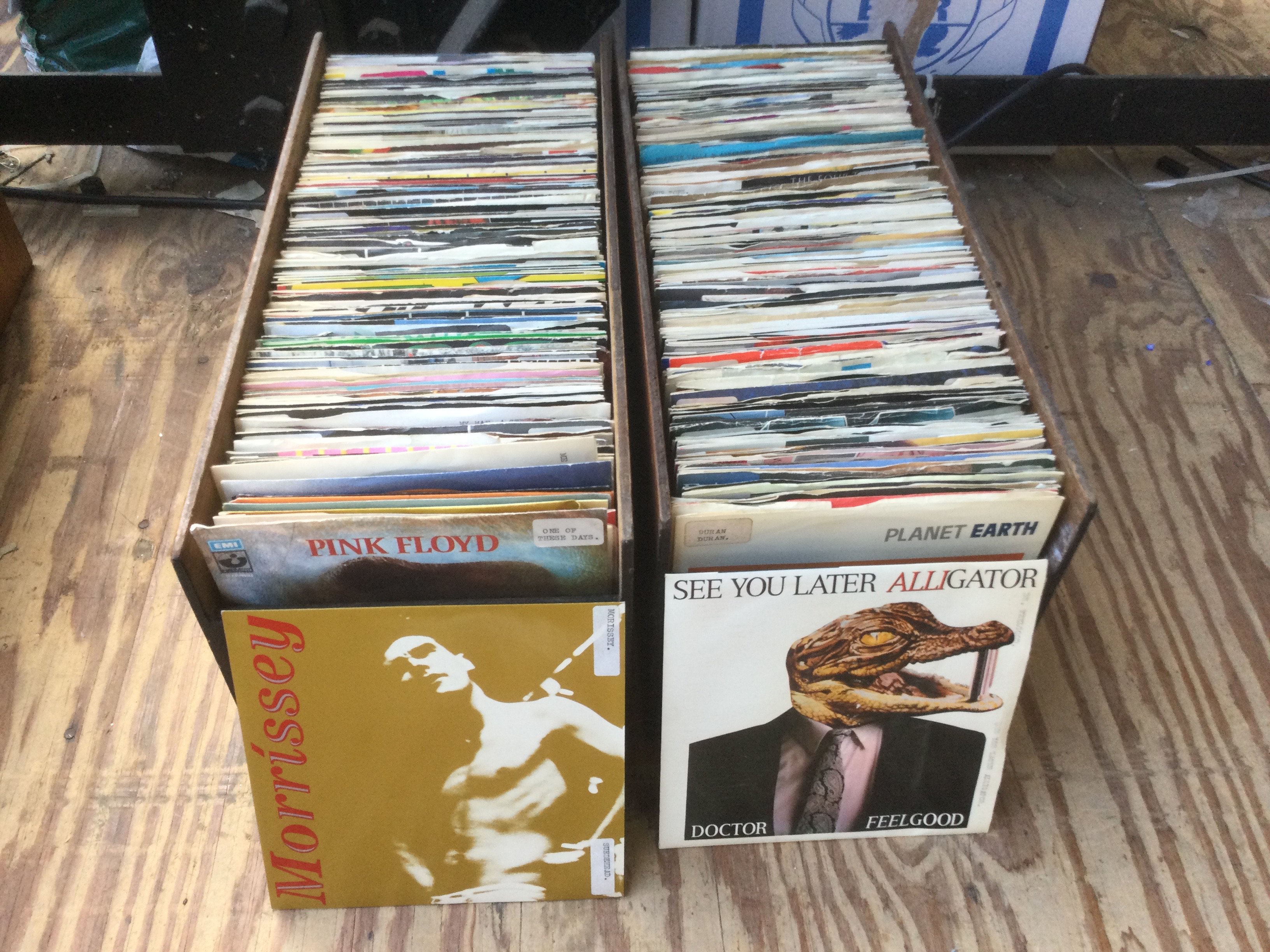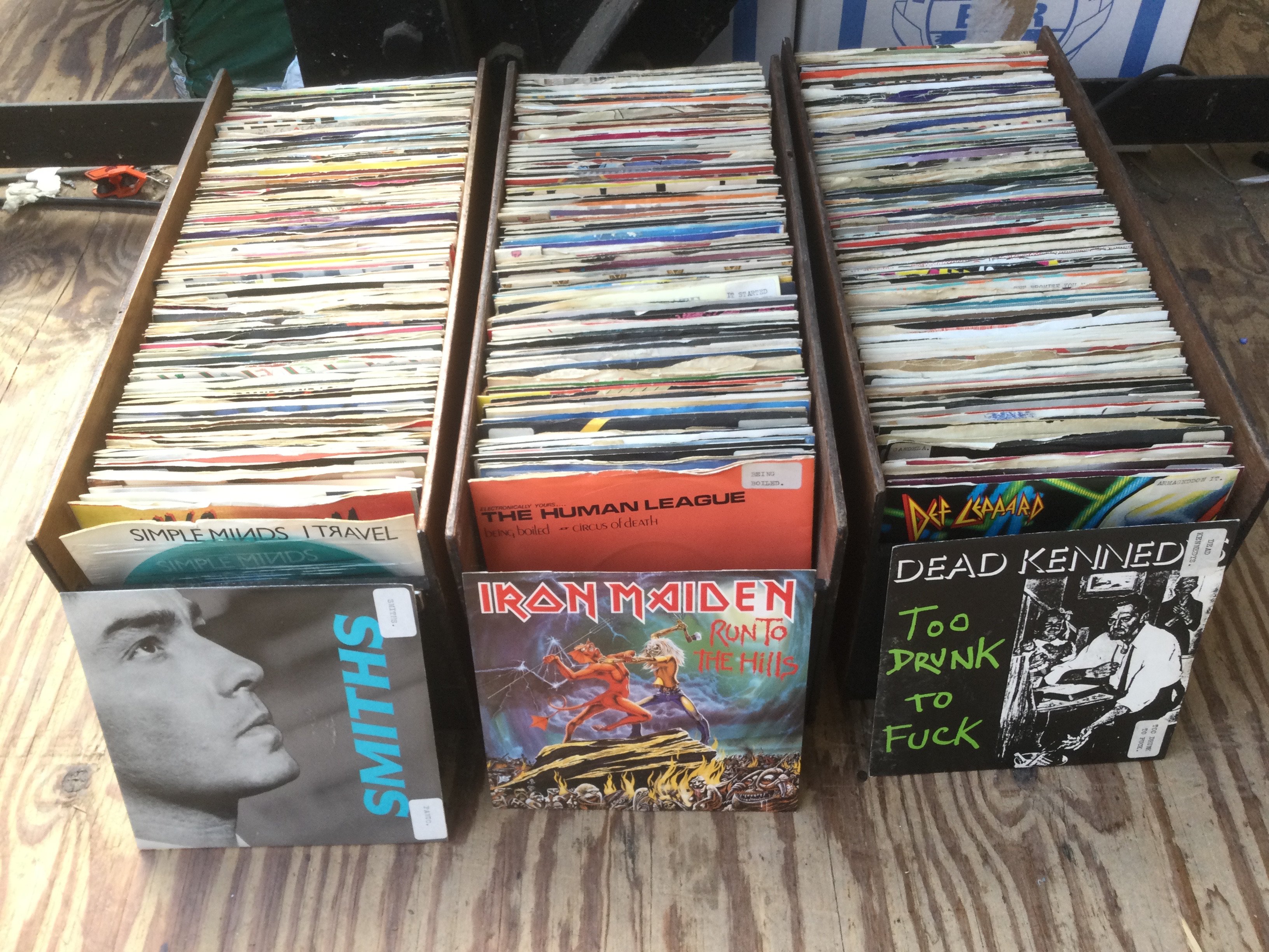 Eight small boxes of 7" singles including some promos and picture discs. Various artists including The Smiths, Kraftwerk, Dead Kennedys and many more.