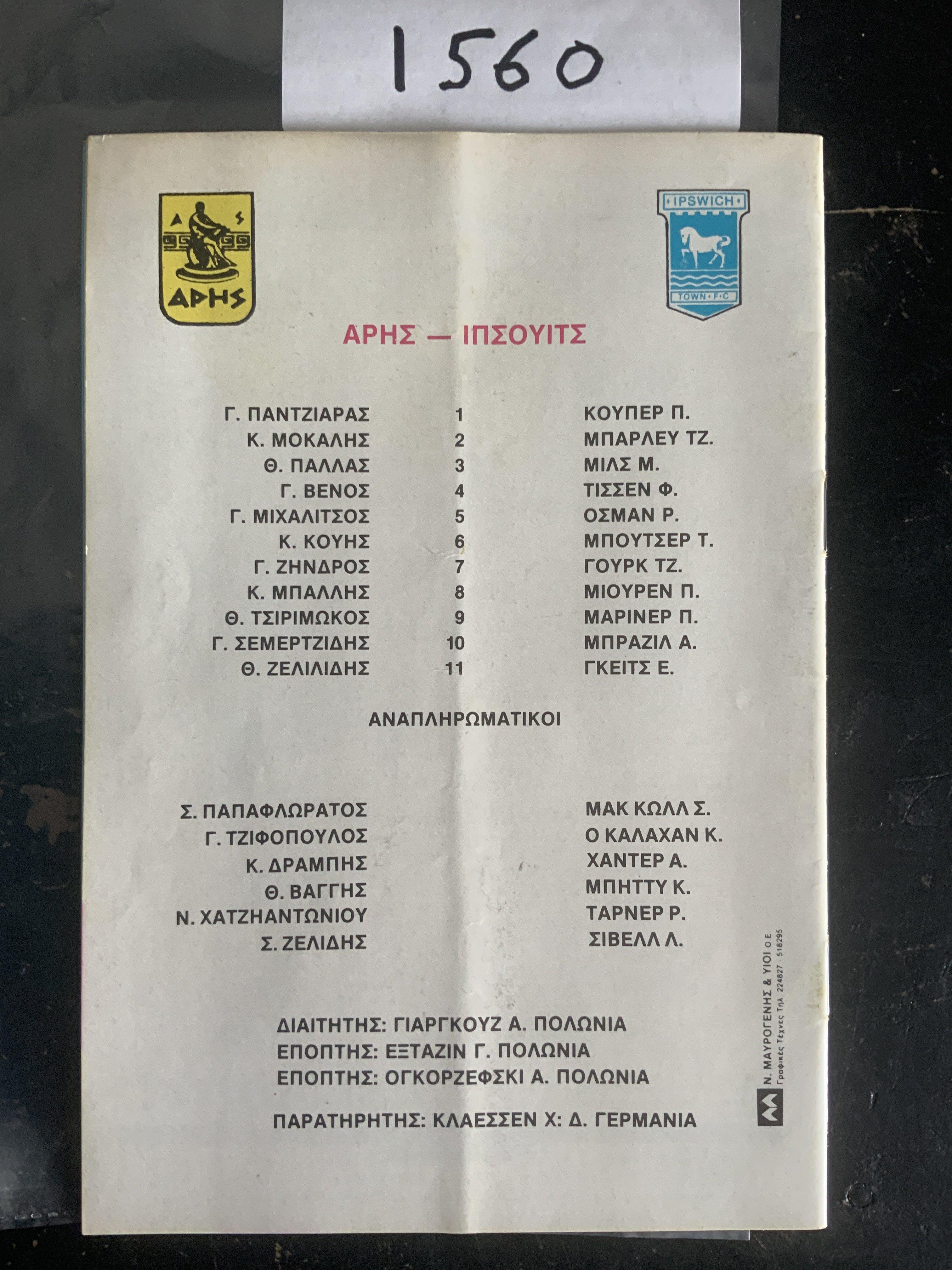 80/81 Aris Solonika v Ipswich Town Football Programme: UEFA Cup programme is very good with no writing. Light fold.