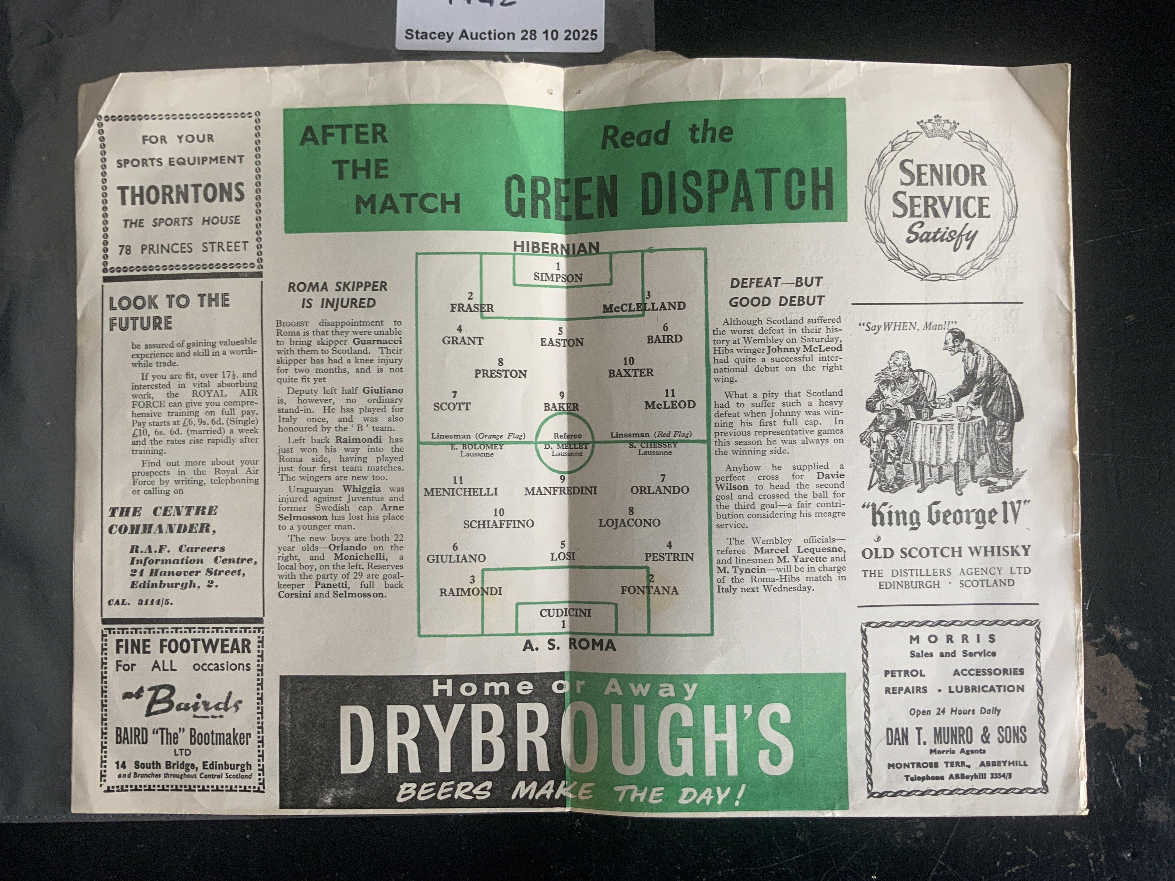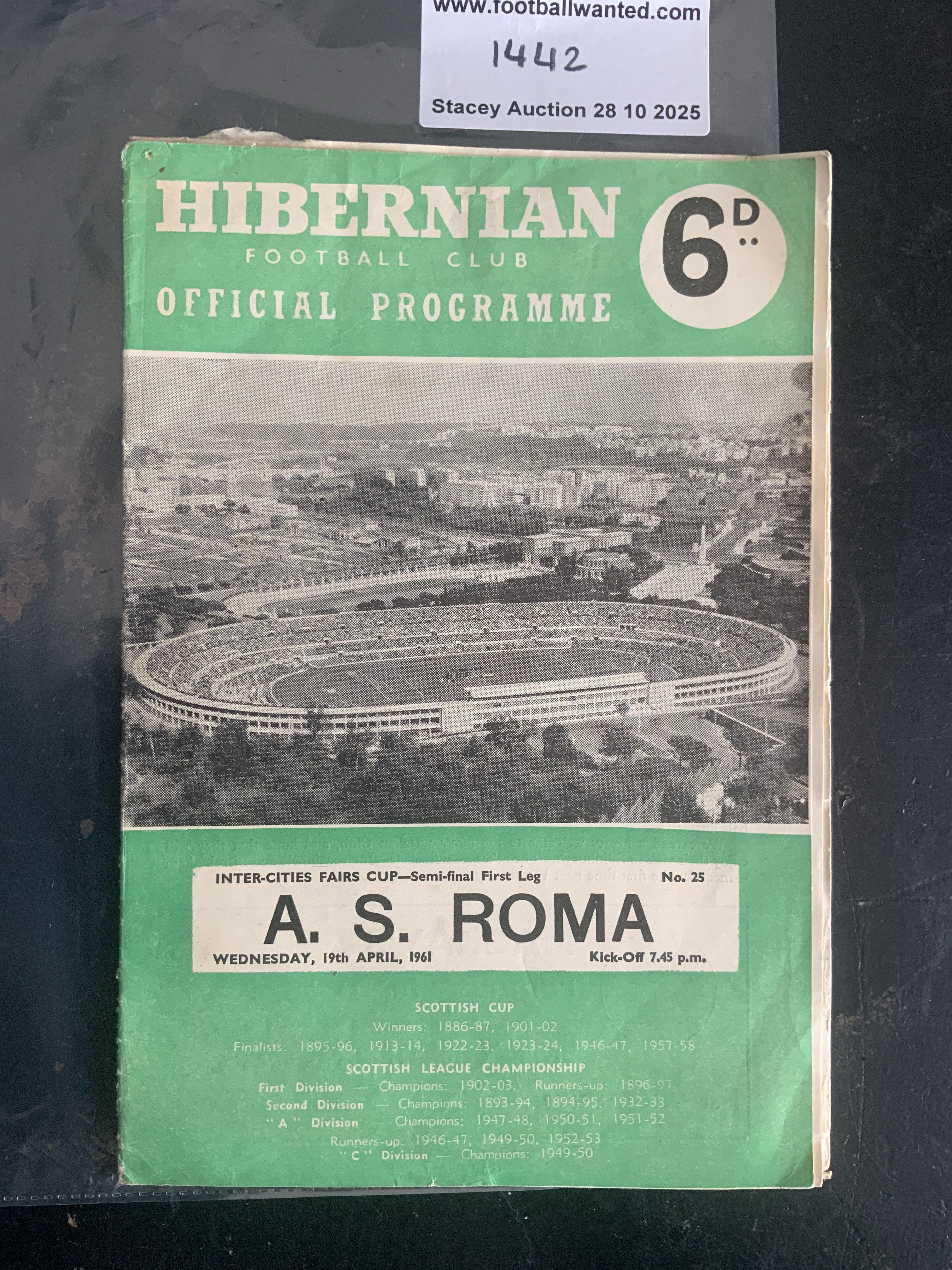 60/61 Hibernian v Roma Fairs Cup Football Programme: Very good condition with no team changes.