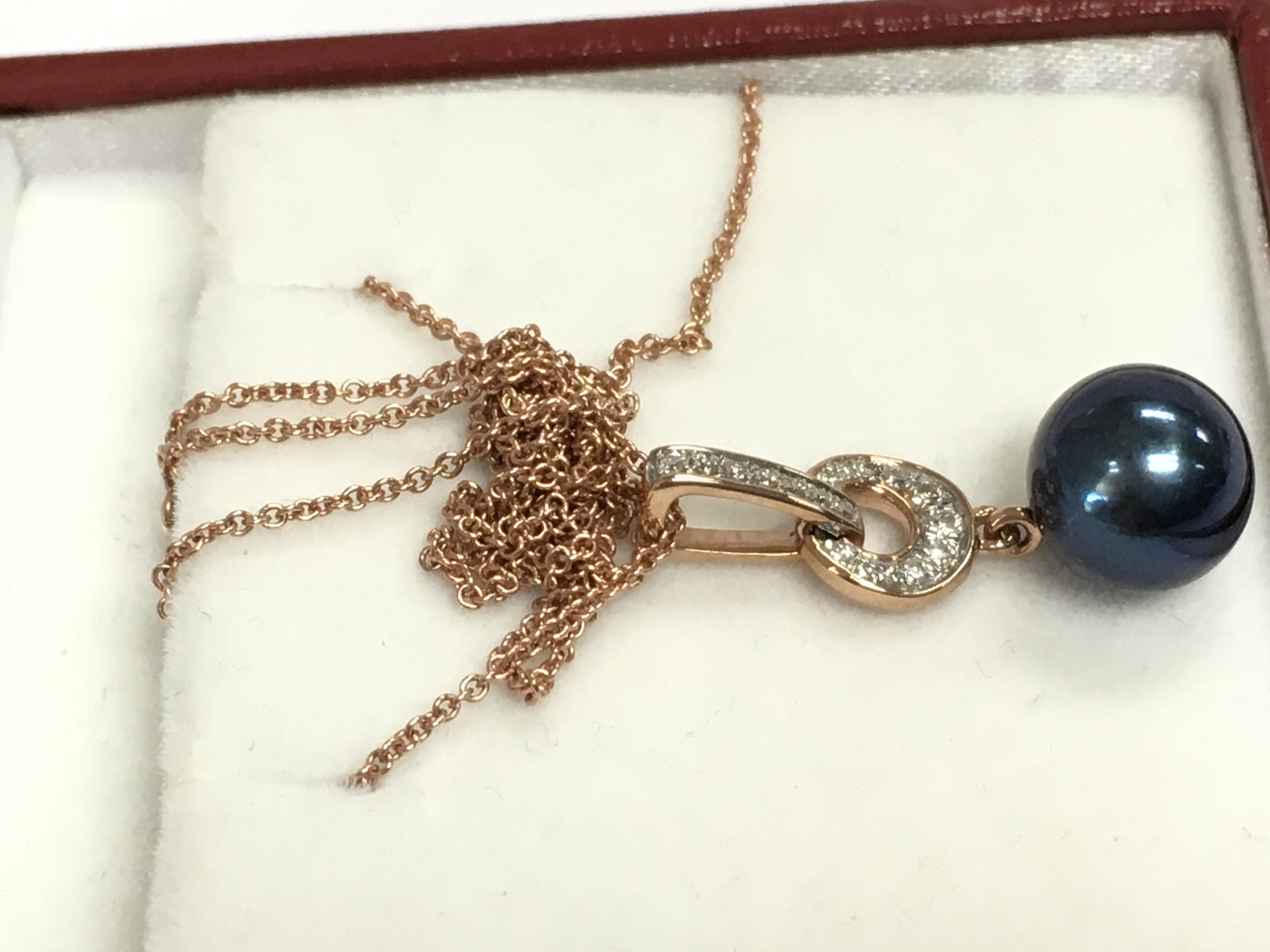 9ct rose gold dark pearl drop bale necklace with diamond set bale, diamond 0.13ct Approx.