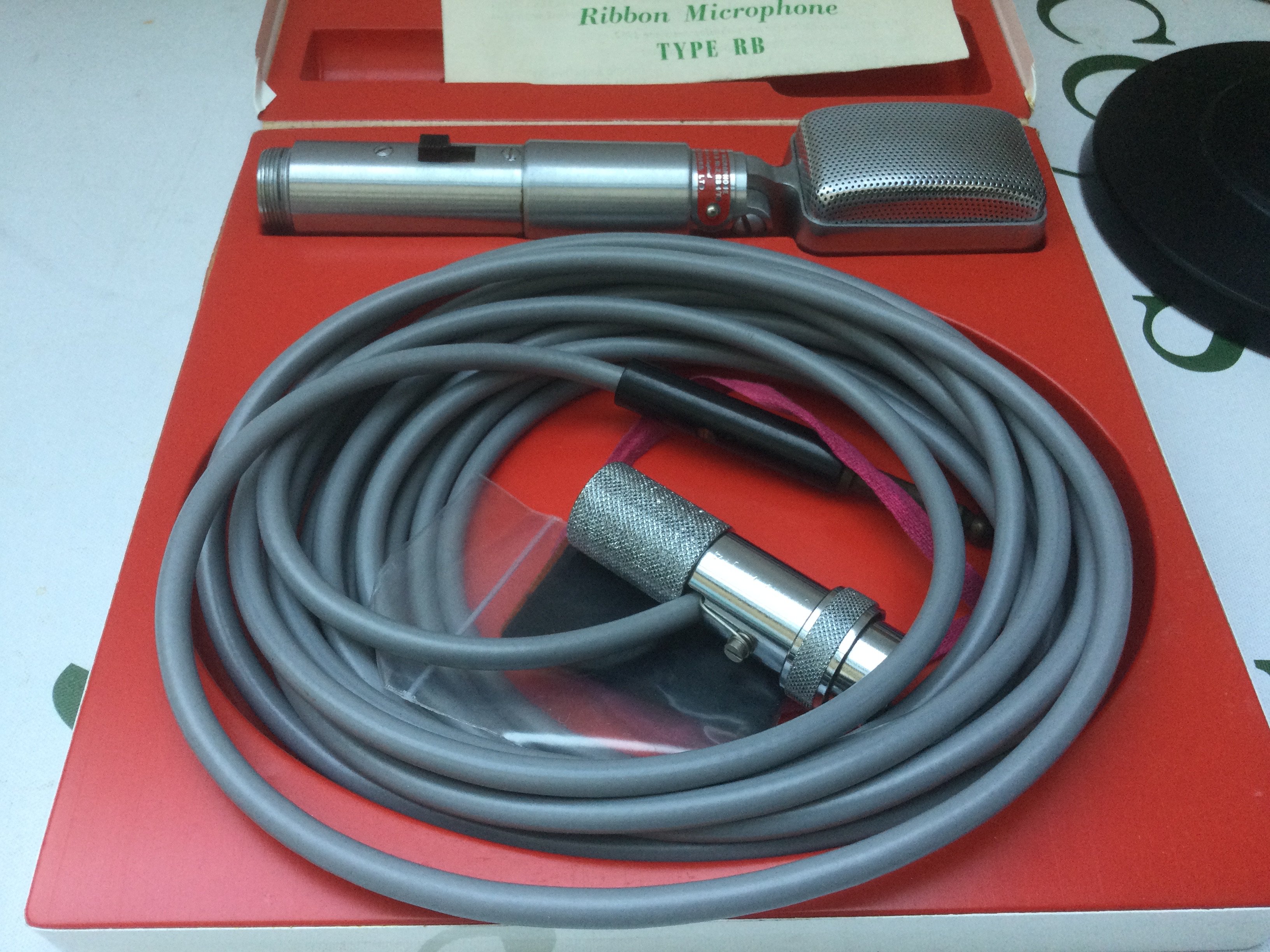 A boxed Reslosound RBH/TS ribbon microphone and stand, also boxed. Comes with instructions and lead.
