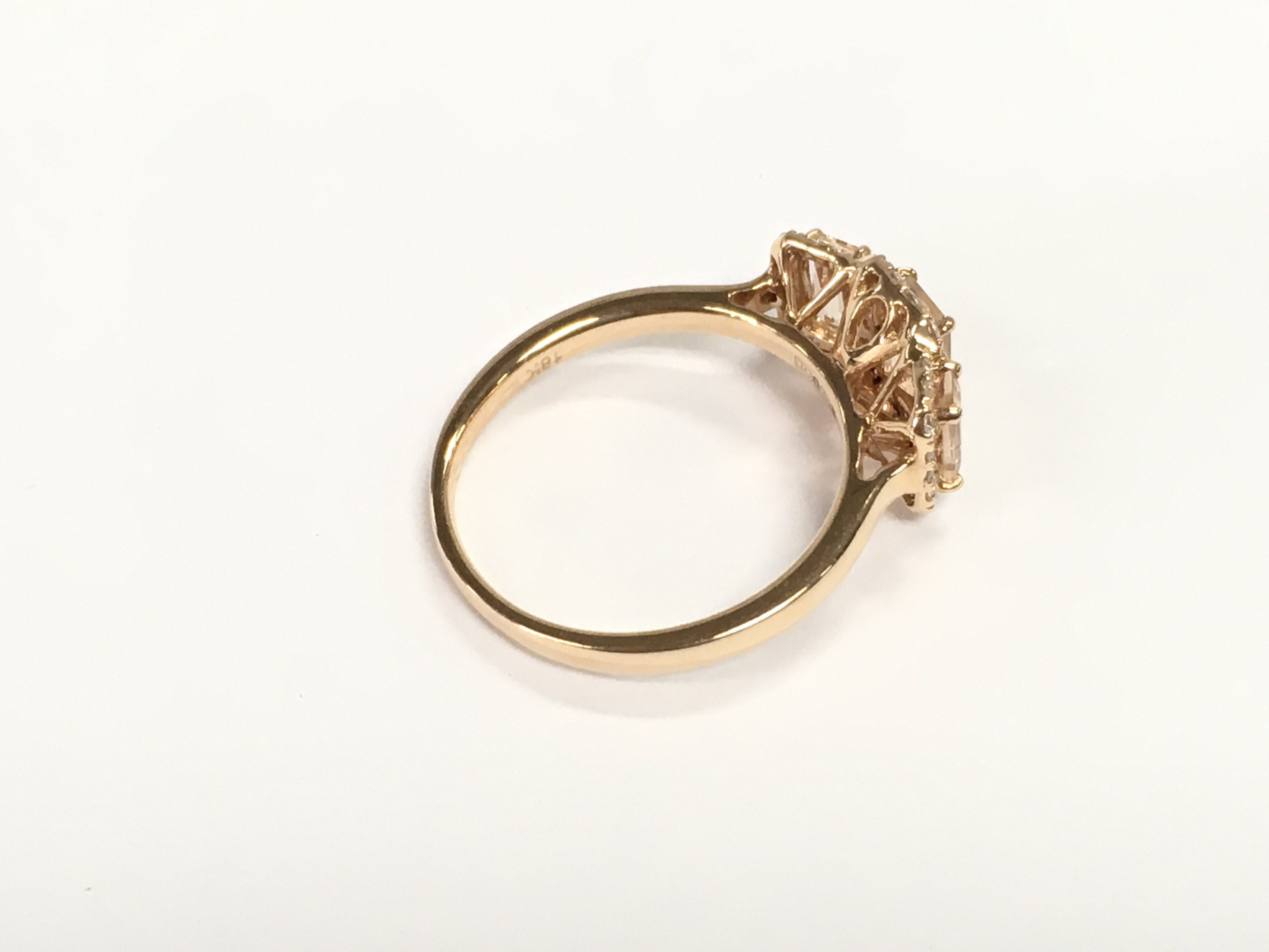18ct rose gold ring set with three morganites each surrounded by diamonds. Morganites 1.17ct diamonds 0.32ct. Size O 1/2 approximately.