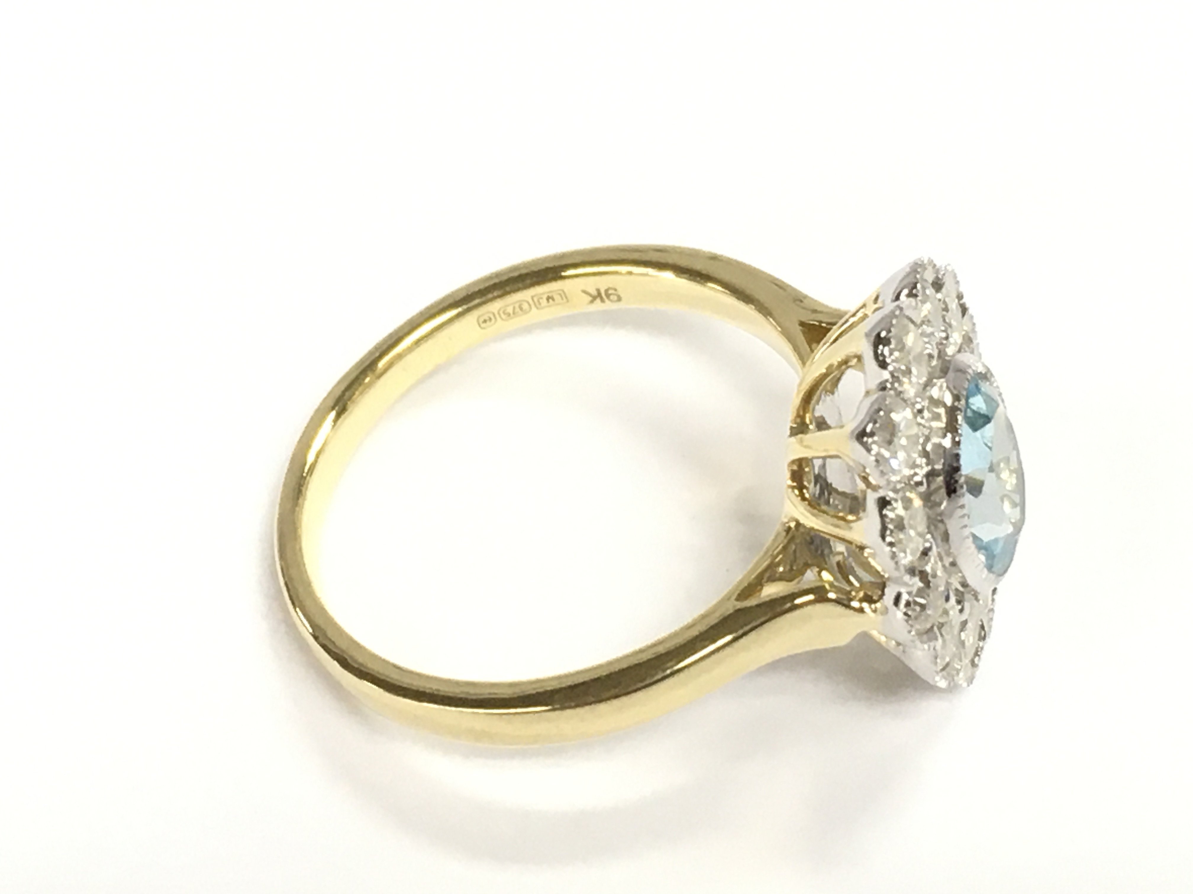 9ct yellow and white gold oval Swiss blue topaz and diamonds daisy cluster ring with scalloped finish. Topaz 1.40ct and diamonds 0.98ct size P.