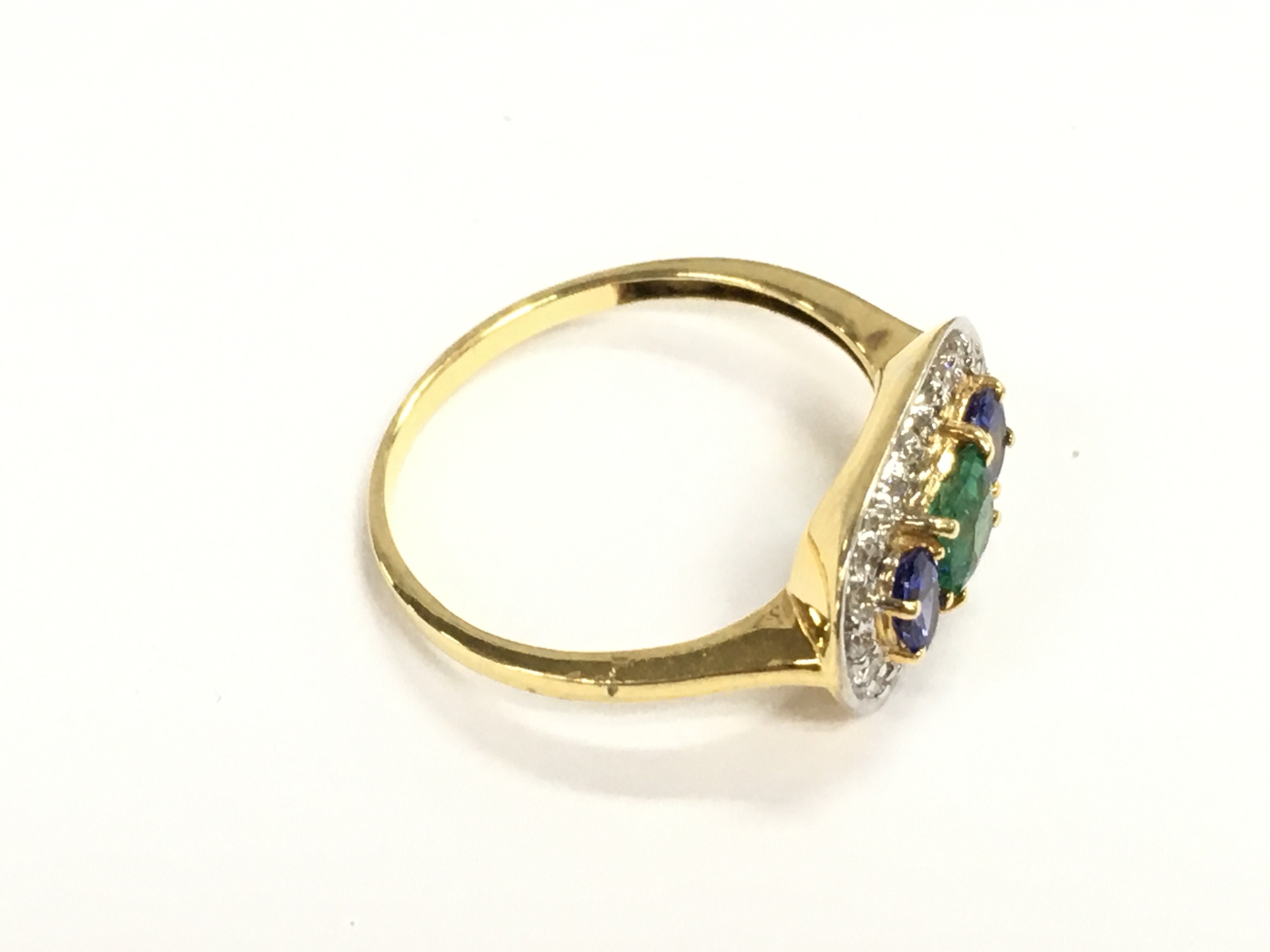14ct yellow gold deco inspired ring set with a square cushion cut emerald and oval tanzanite surrounded by diamonds. Size P