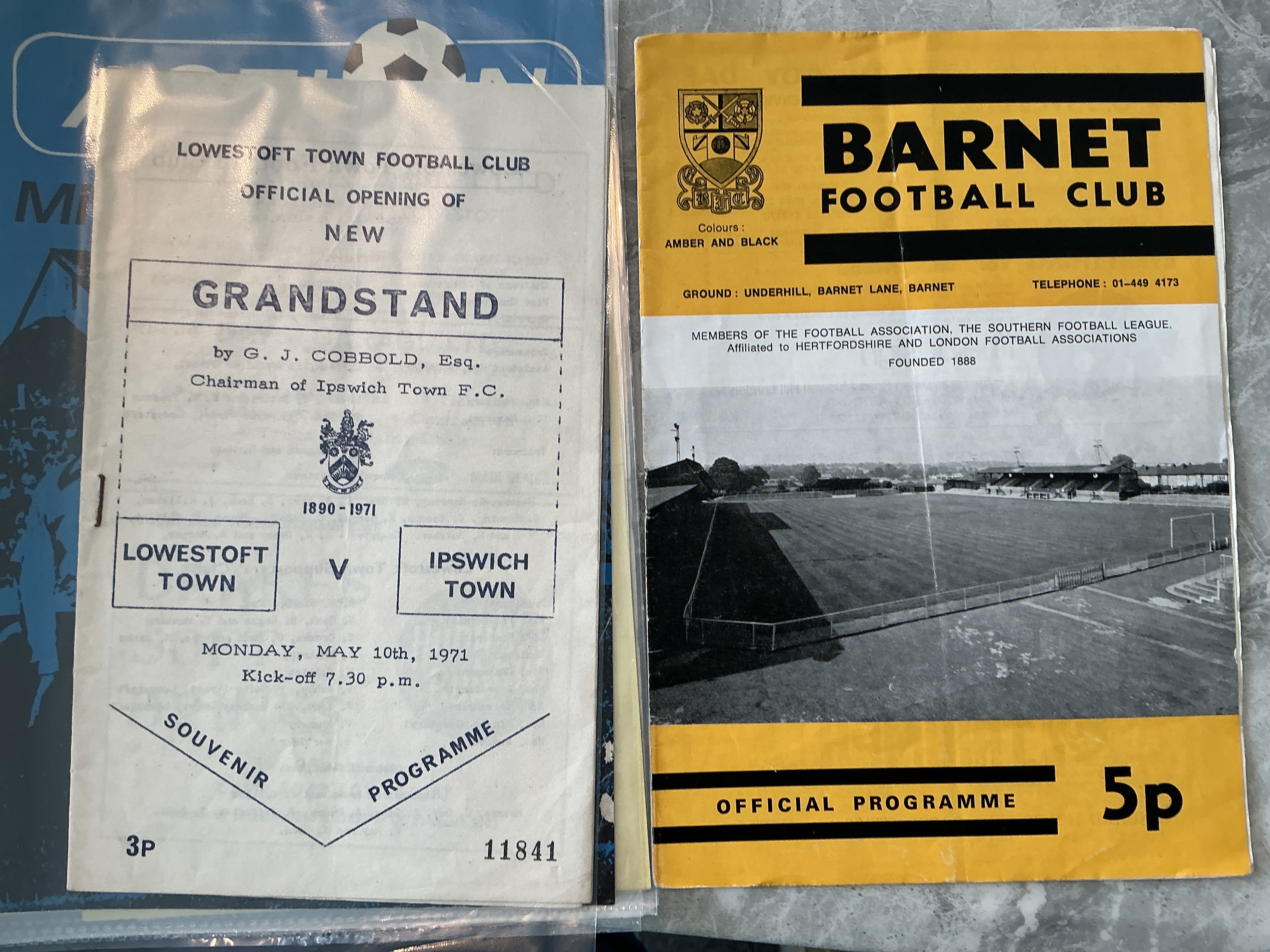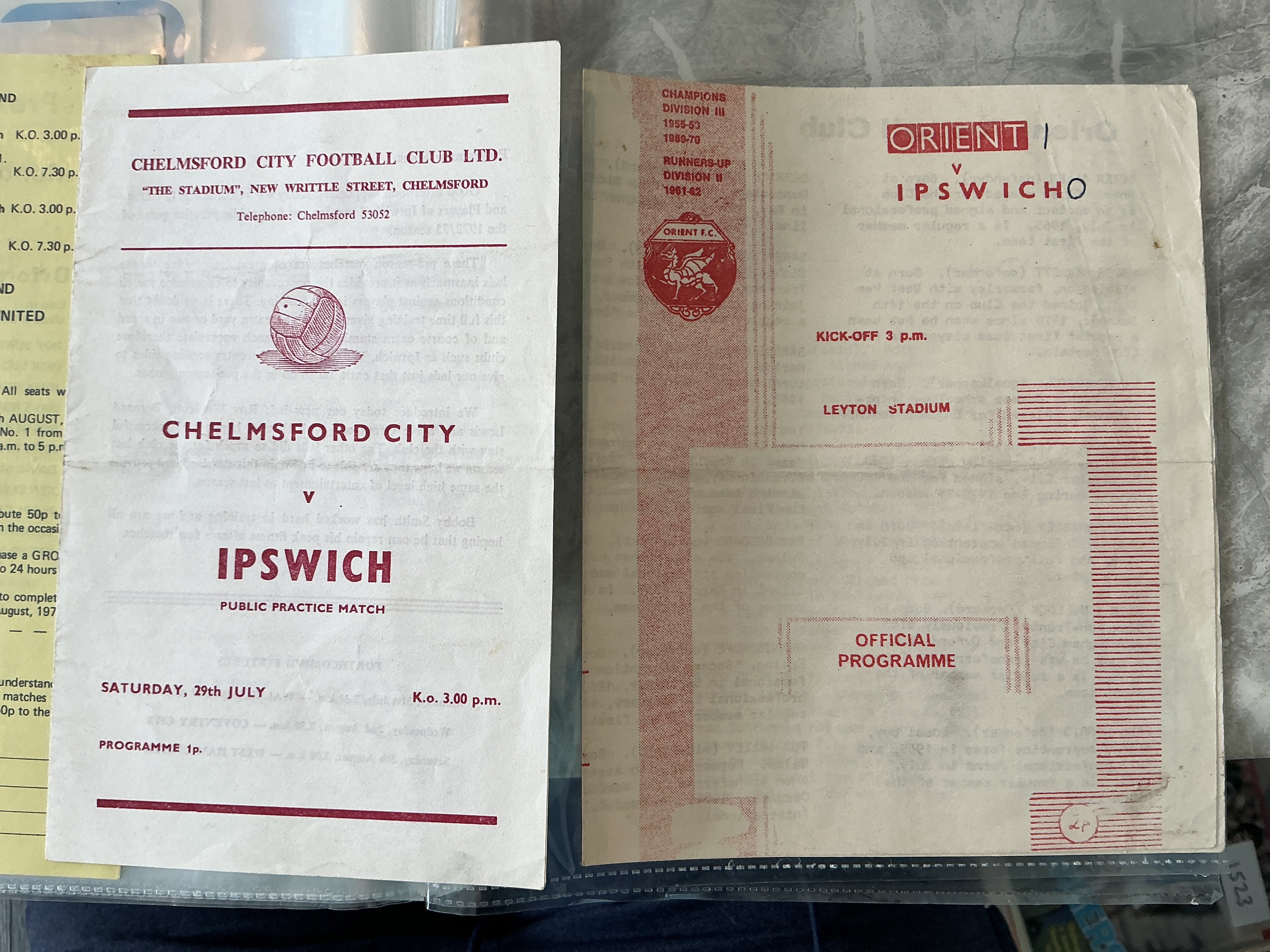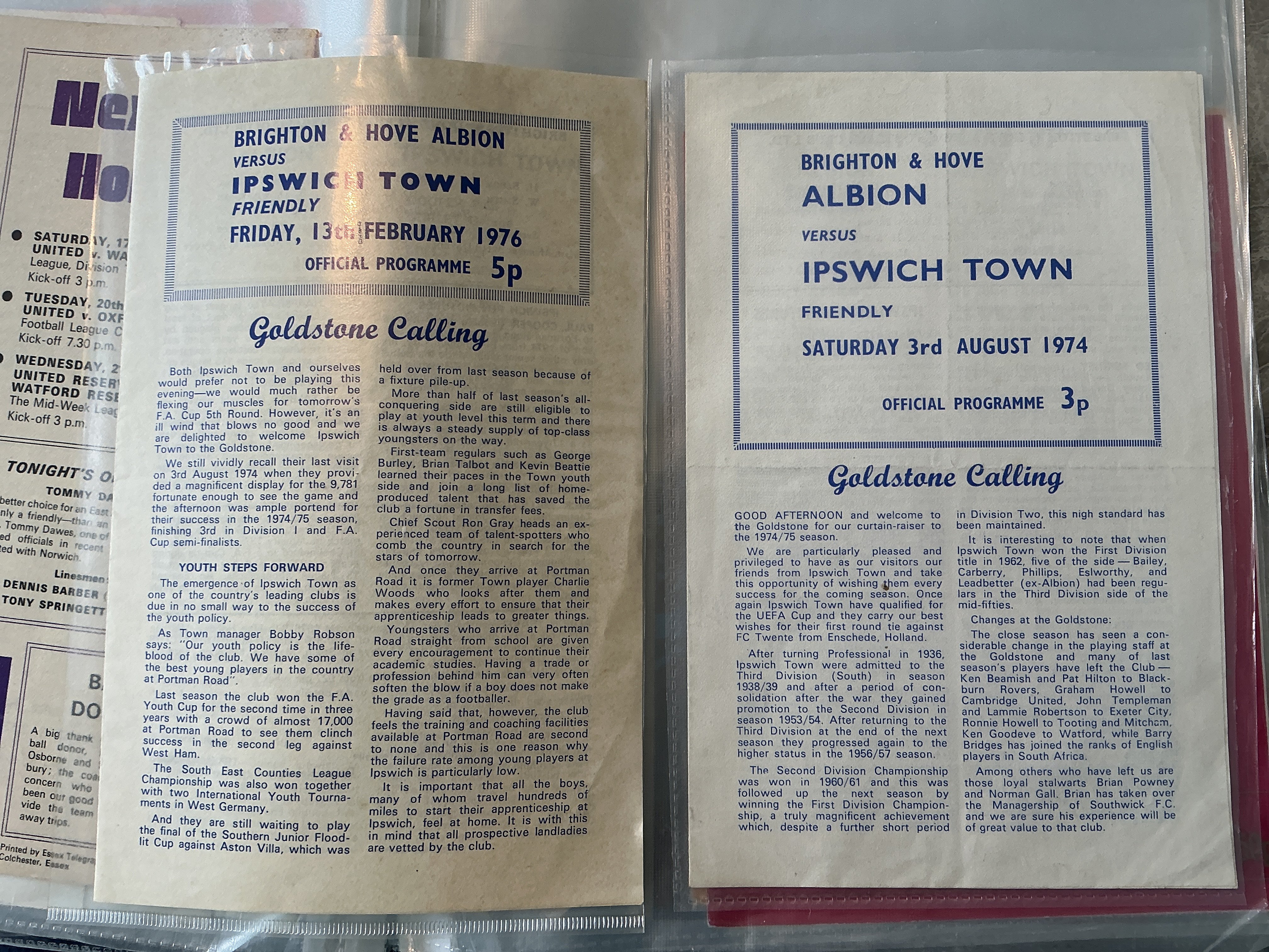 Ipswich 1970s Away Friendly Football Programmes: Includes 78/79 Dorchester, 76/77 Colchester, 74/75 + 75/76 Brighton, 72/73 Orient, 70/71 Lowestoft. Very good. (16)