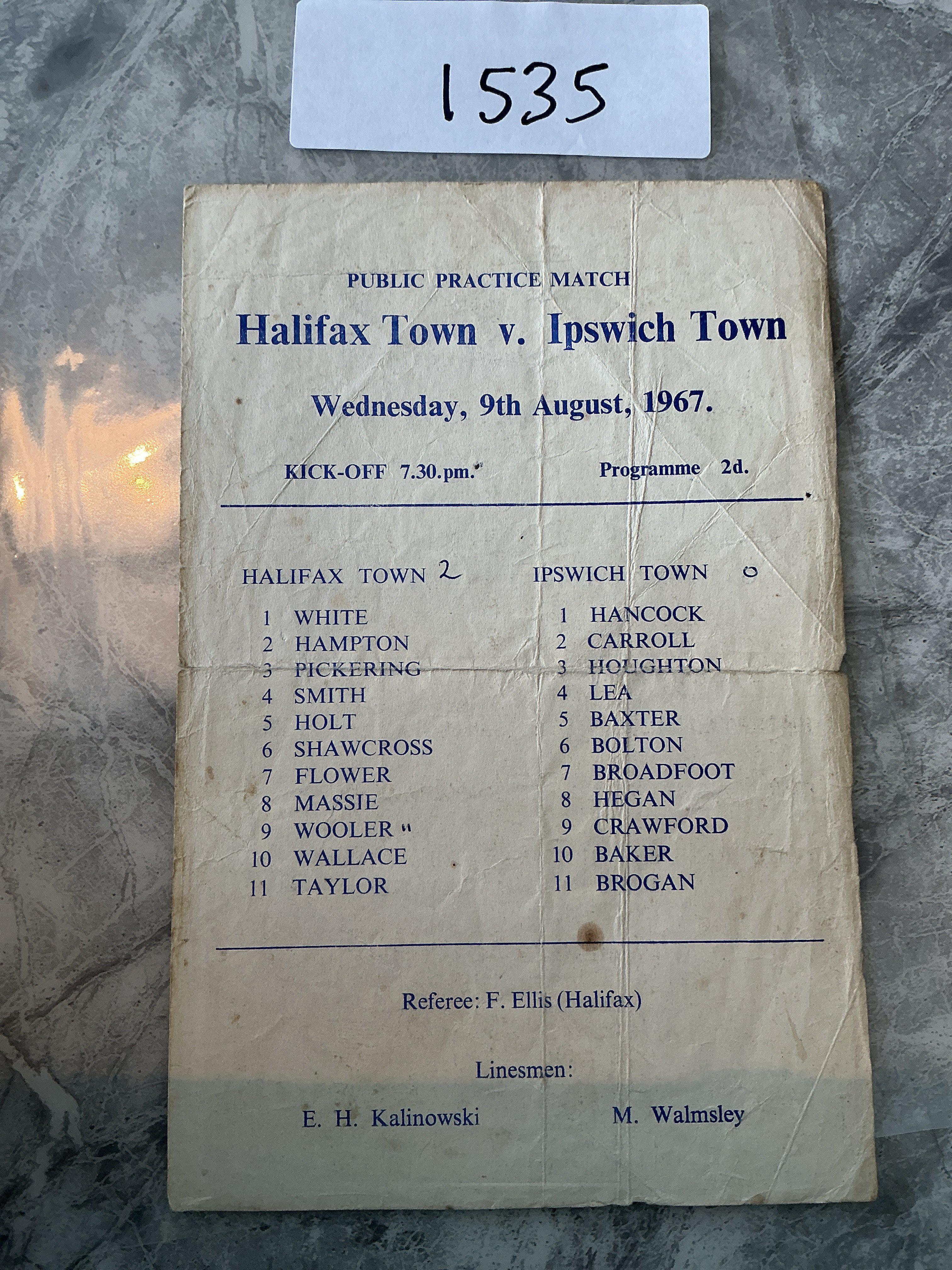 67/68 Halifax Town v Ipswich Football Programme: Single sheet practice match dated 9 8 1967. Vendor paid over 200 pounds for this. No team changes. Creasing and tears to folding. Score written.