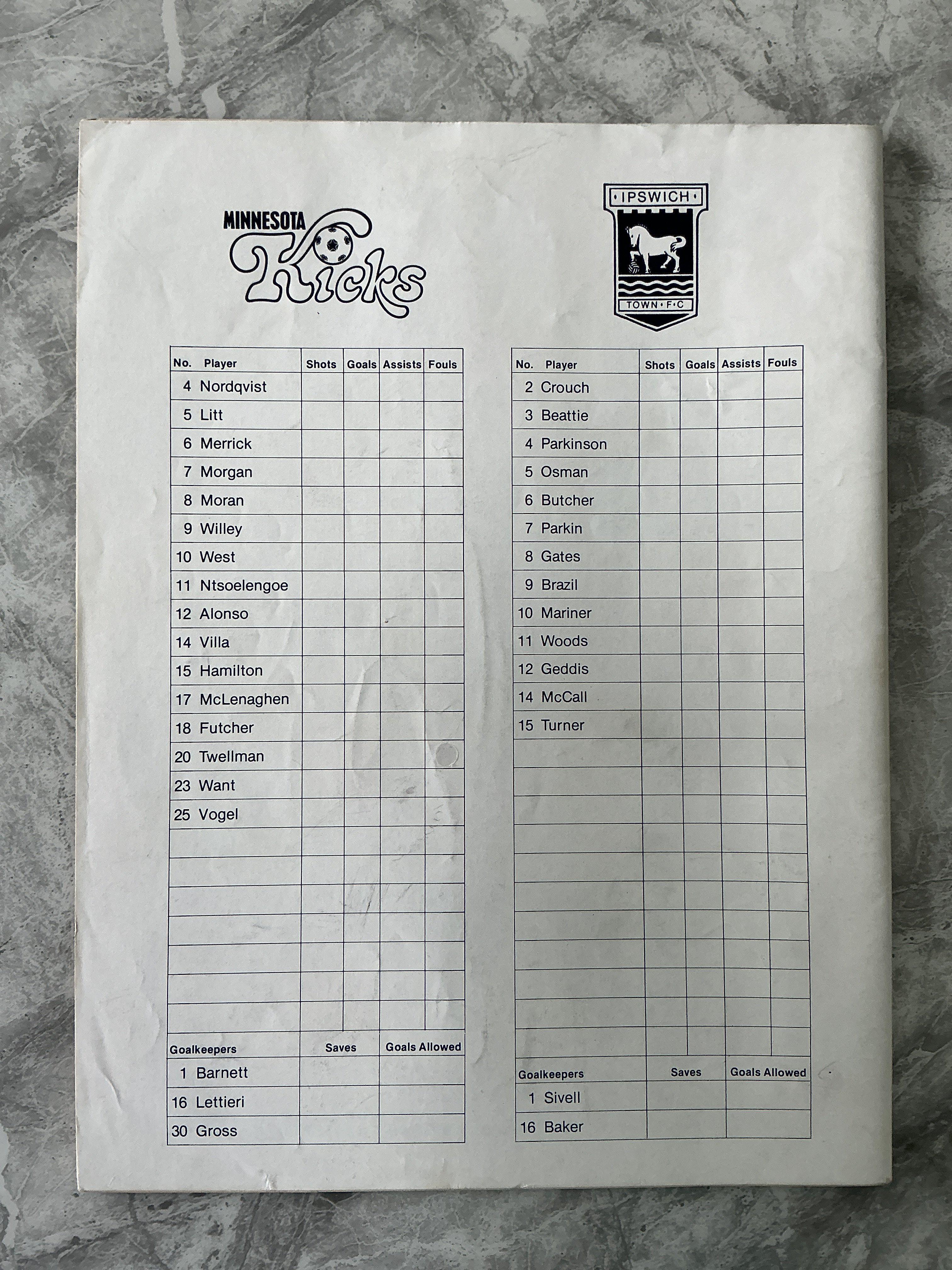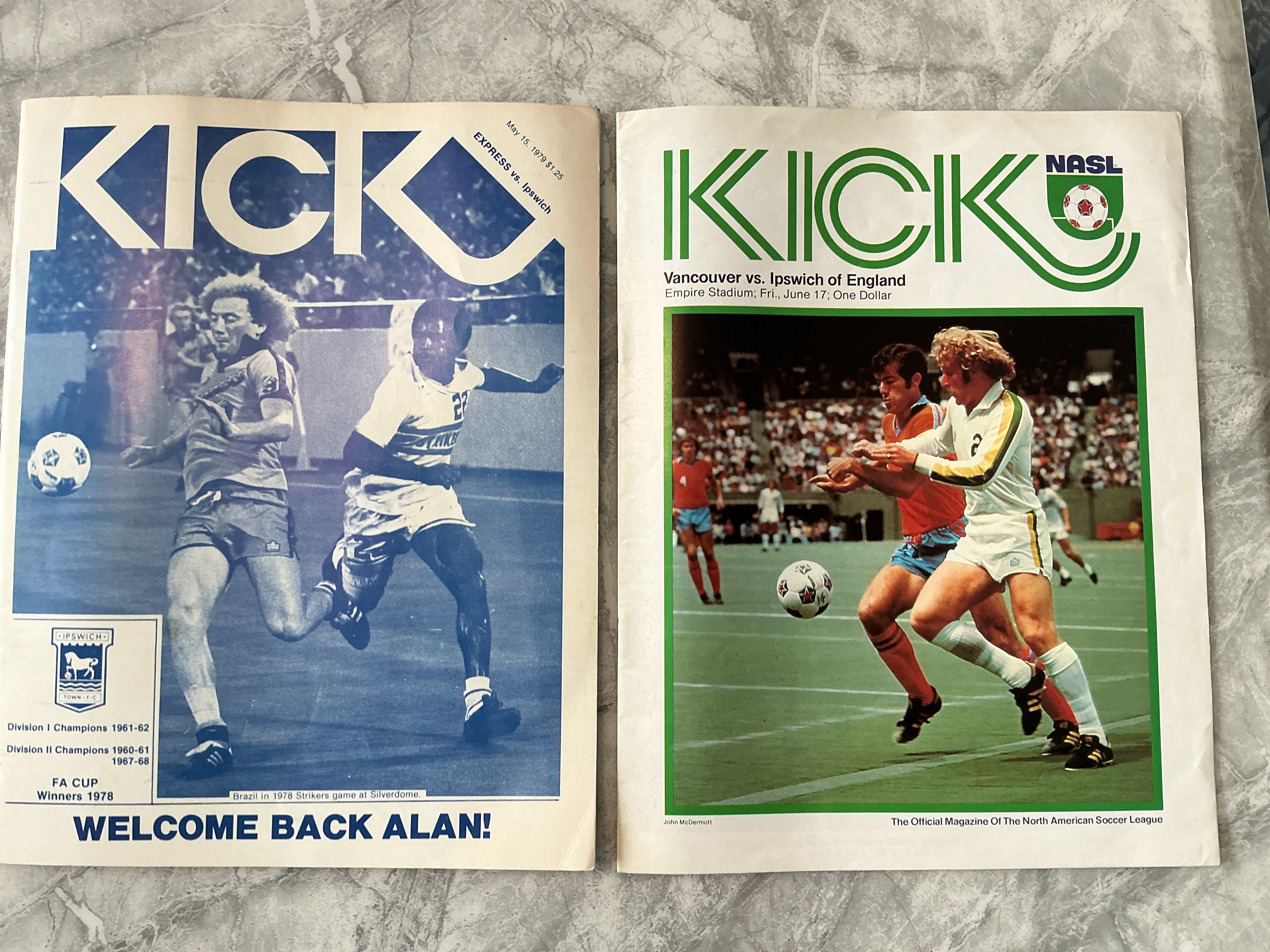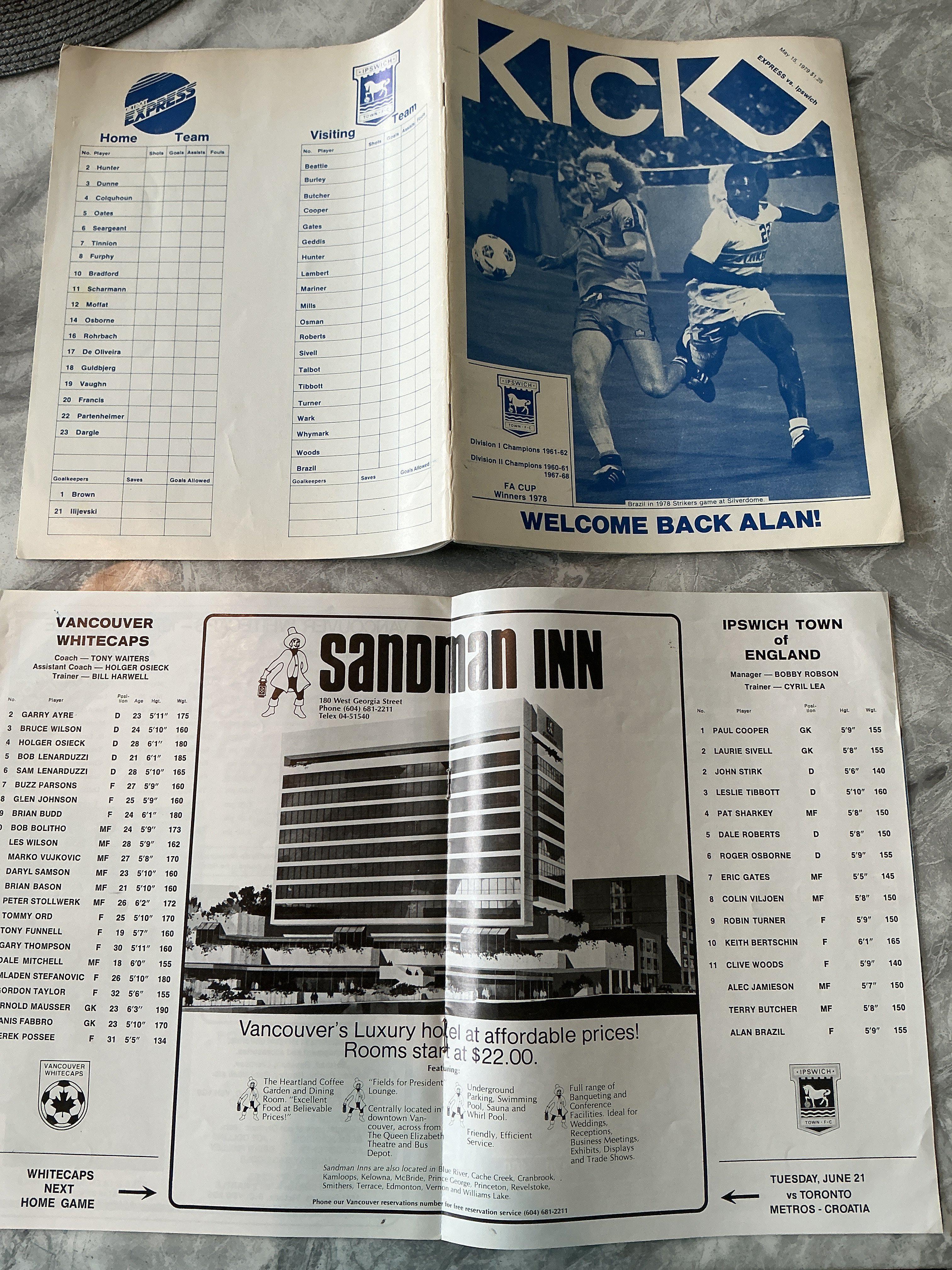 1970s Ipswich USA Tour Football Programmes: 78/79 Detroit Express, Minnesota Kicks signed by Beattie and 77/78 Vancouver Whitecaps. Very good with no team changes. (3)
