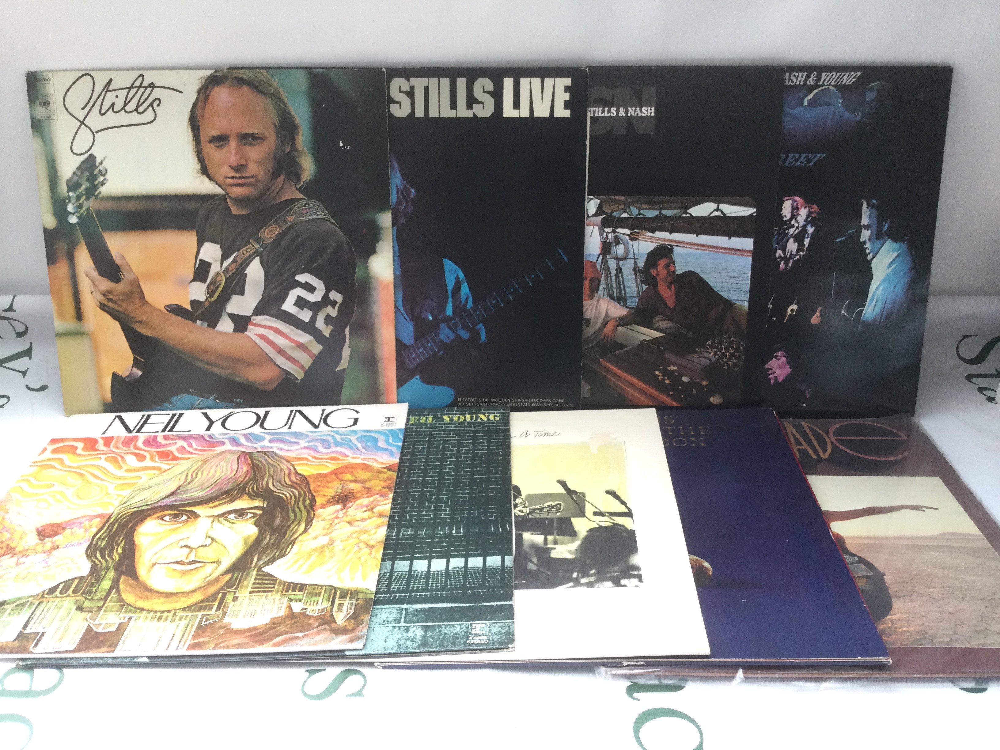 Two bags containing 17 folk rock LPs by various artists including Bob Dylan, CSNY, Neil Young and others.