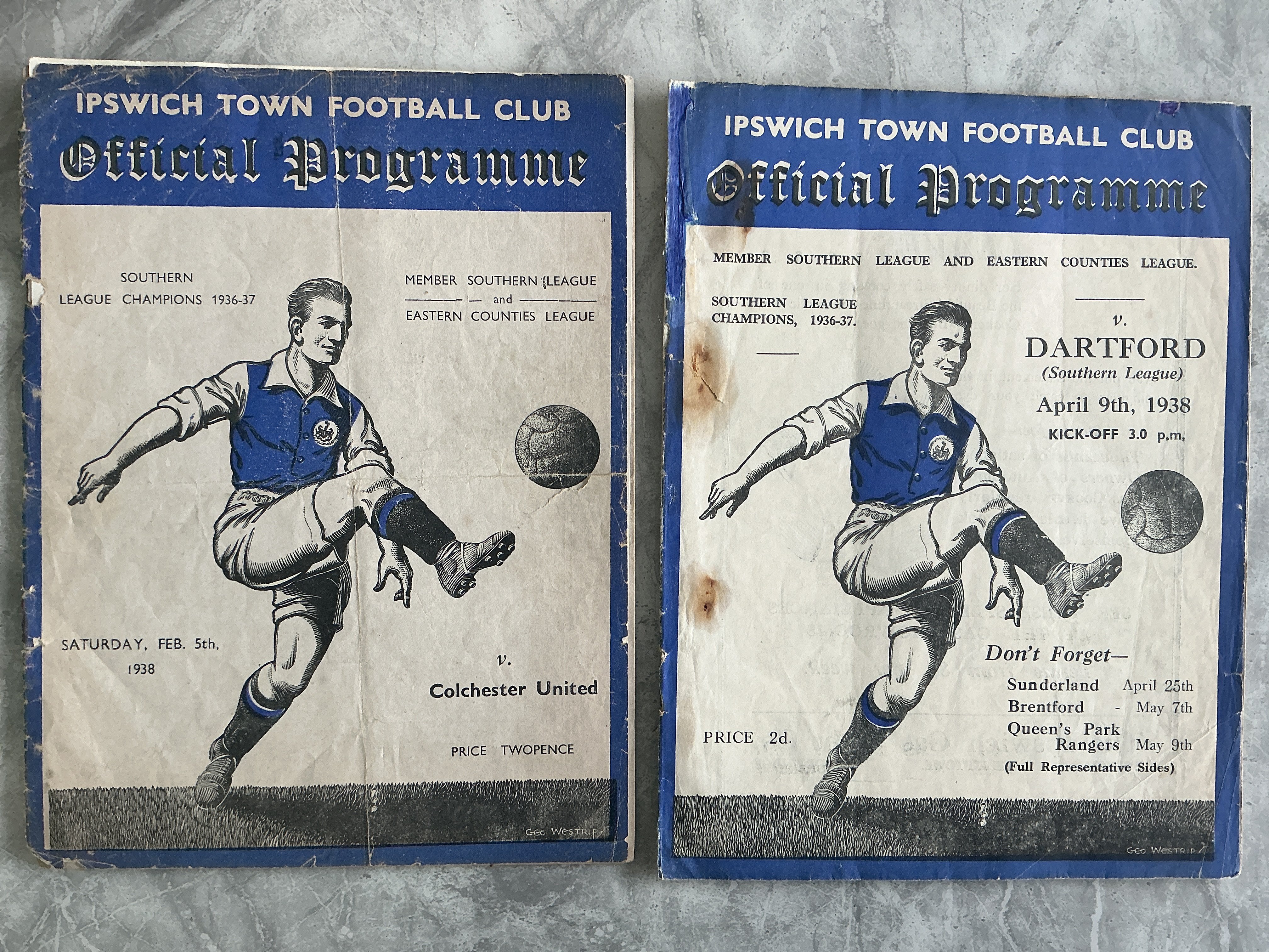 Ipswich Town Home Damaged Pre War Football Programmes: 37/38 Colchester split spine + tear, Dartford rust marks, 38/39 Aston Villa no back cover, Newport reserves pieces missing, Bristol Rovers pieces missing from back page, Newport covers loose and pieces missing,, Cardiff no back cover. Very poor. (7)
