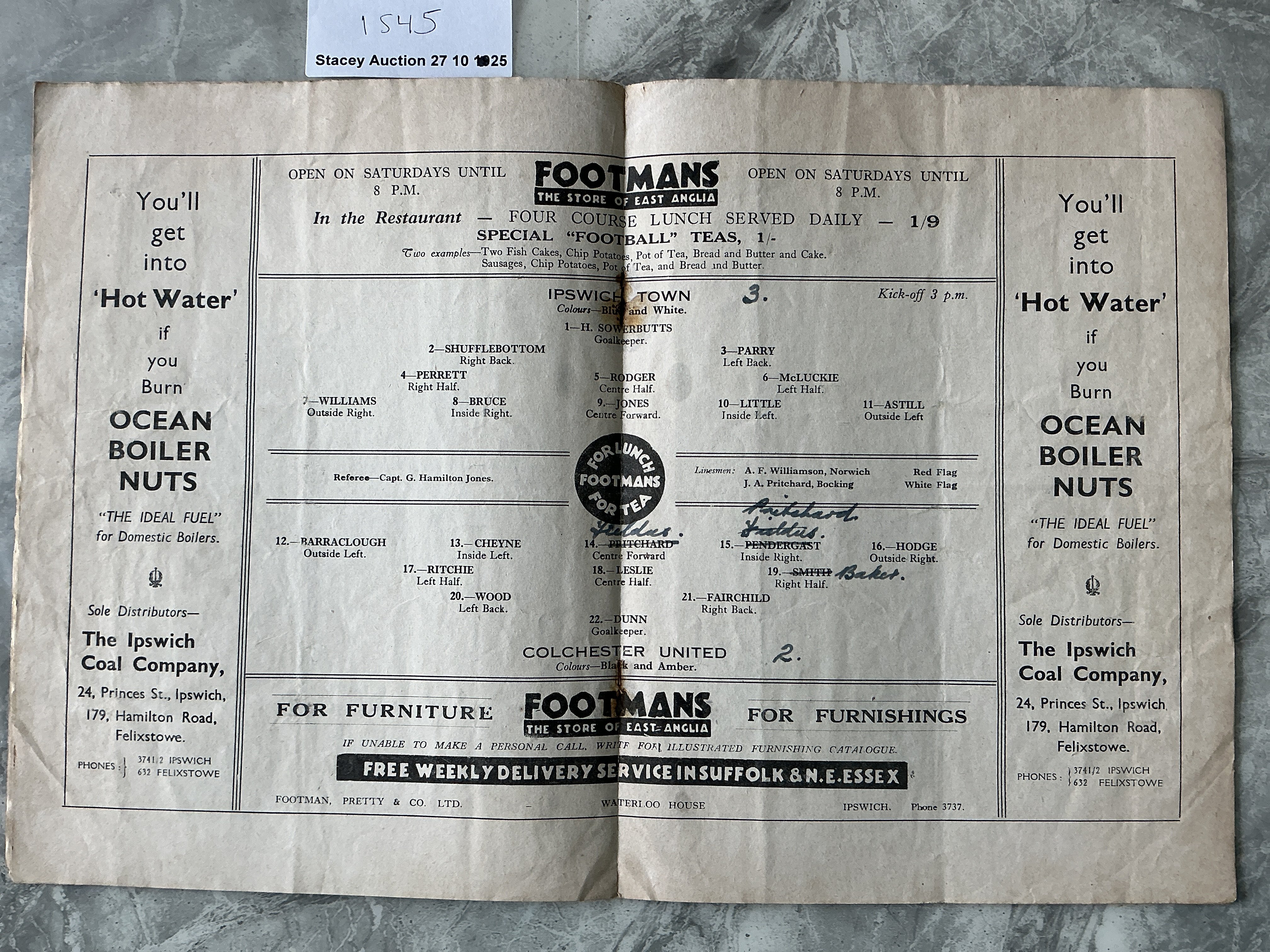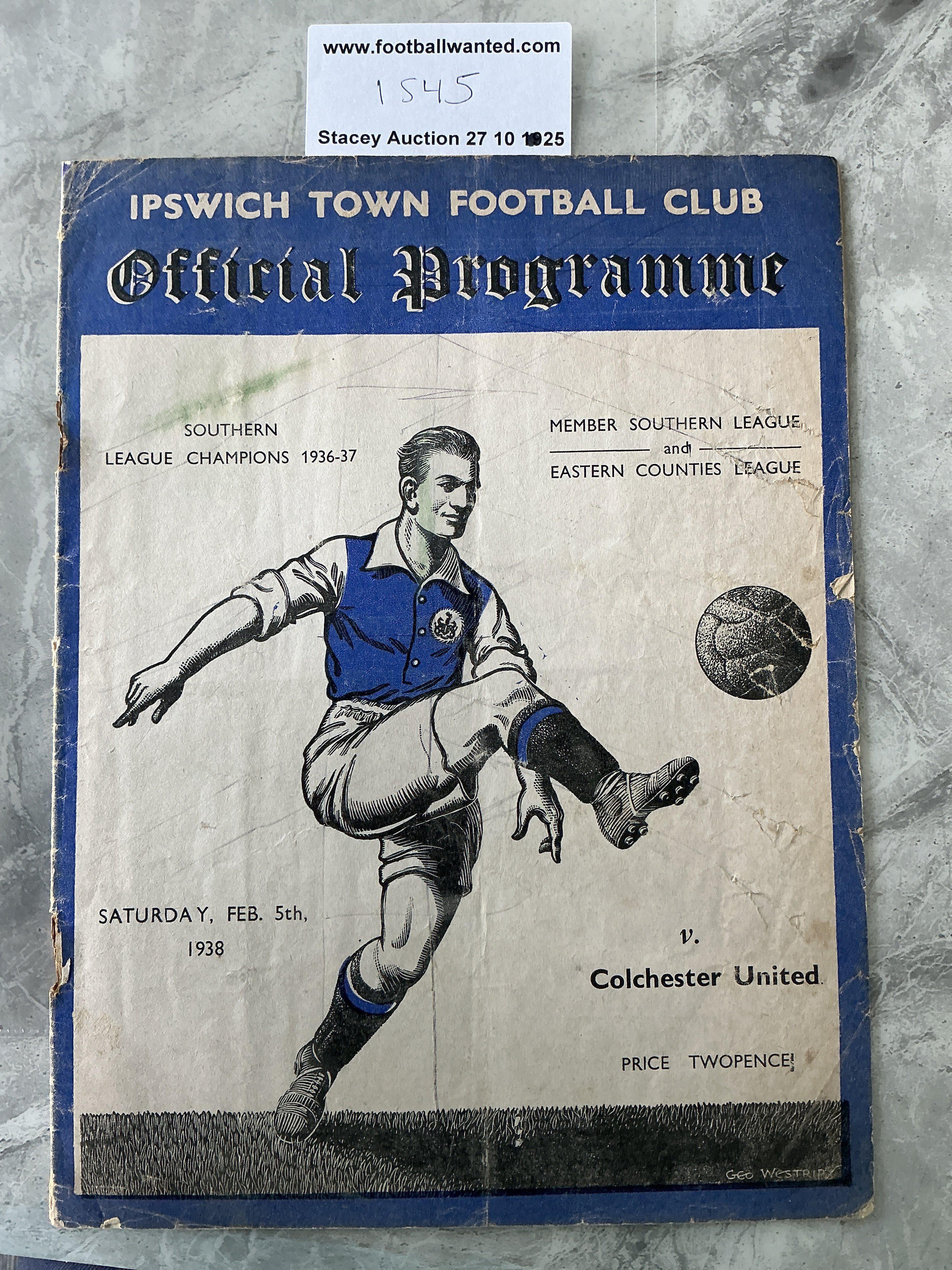 37/38 Ipswich v Colchester United Football Programme: Southern League 16 page programme in fair condition with team changes. Rusty staples holding firm. Few marks and creases.