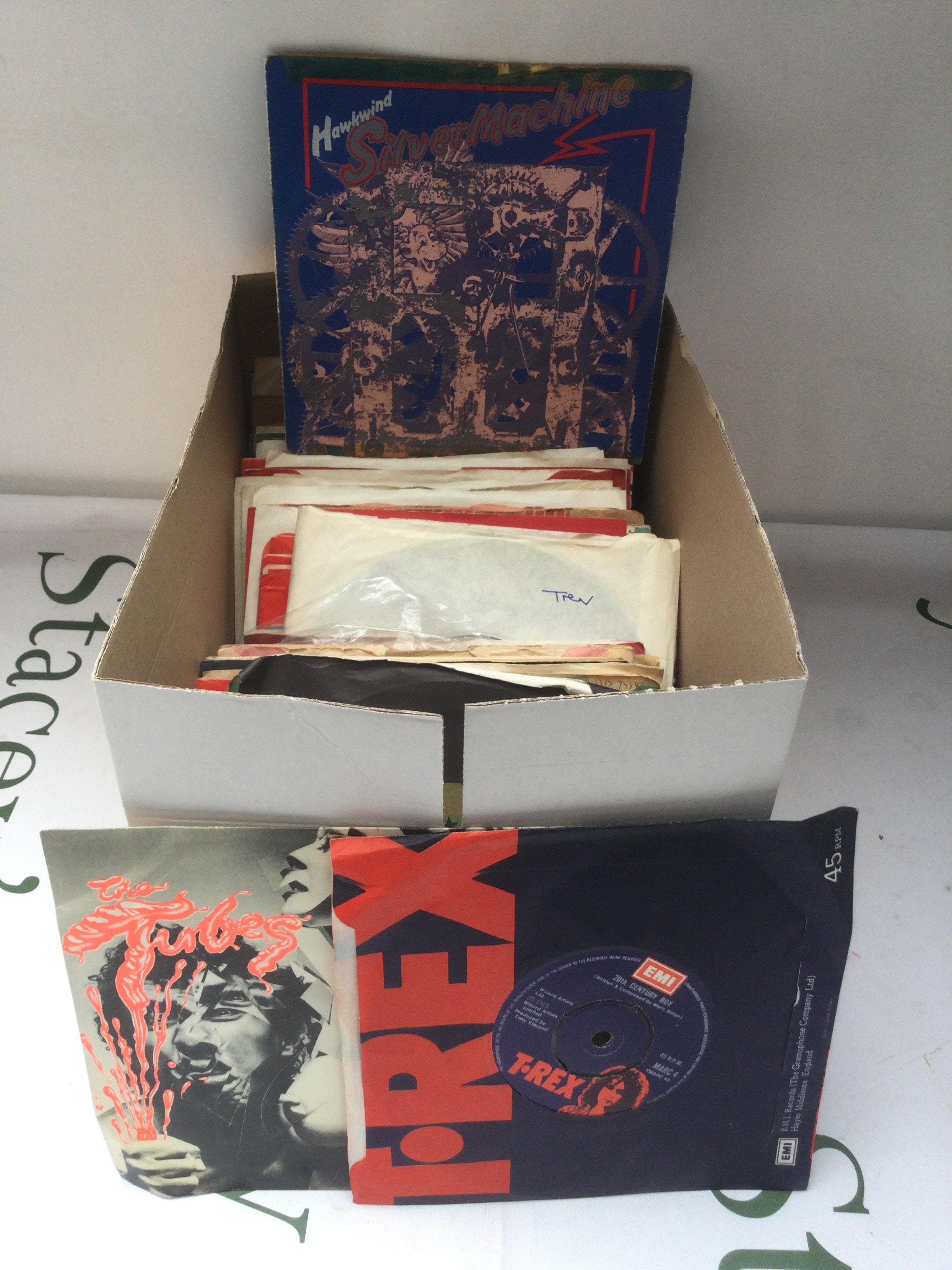 A box and two record cases of 7" singles by various artists including Elvis Presley, T Rex, Aerosmith and others.
