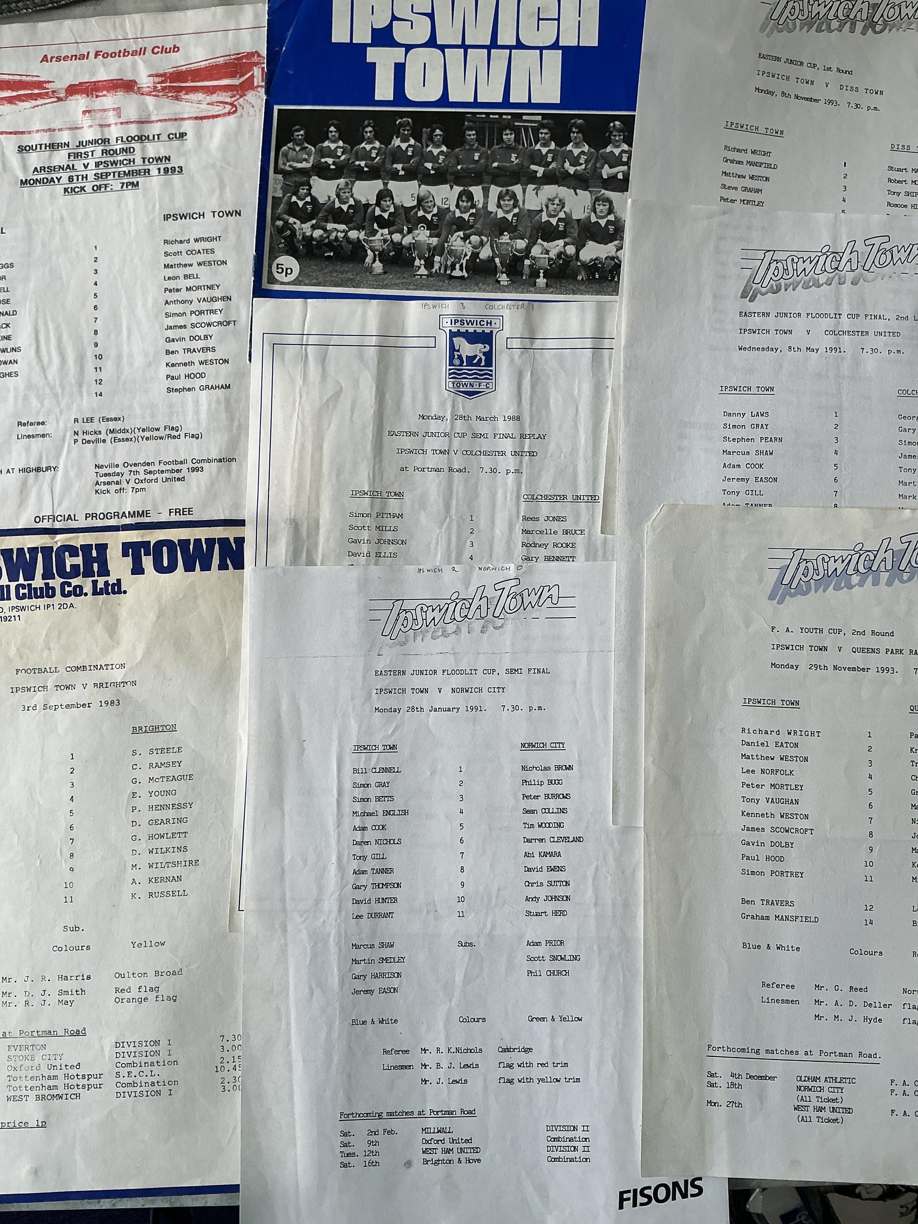 Ipswich Town Reserve Programmes + Team Sheets: Includes around 20 Eastern Junior Cup, Youth Cup, Football Combination, SJFC Aston Villa 75/76. C/W around 40 more modern home team sheets. Instructions to sell. (60+)