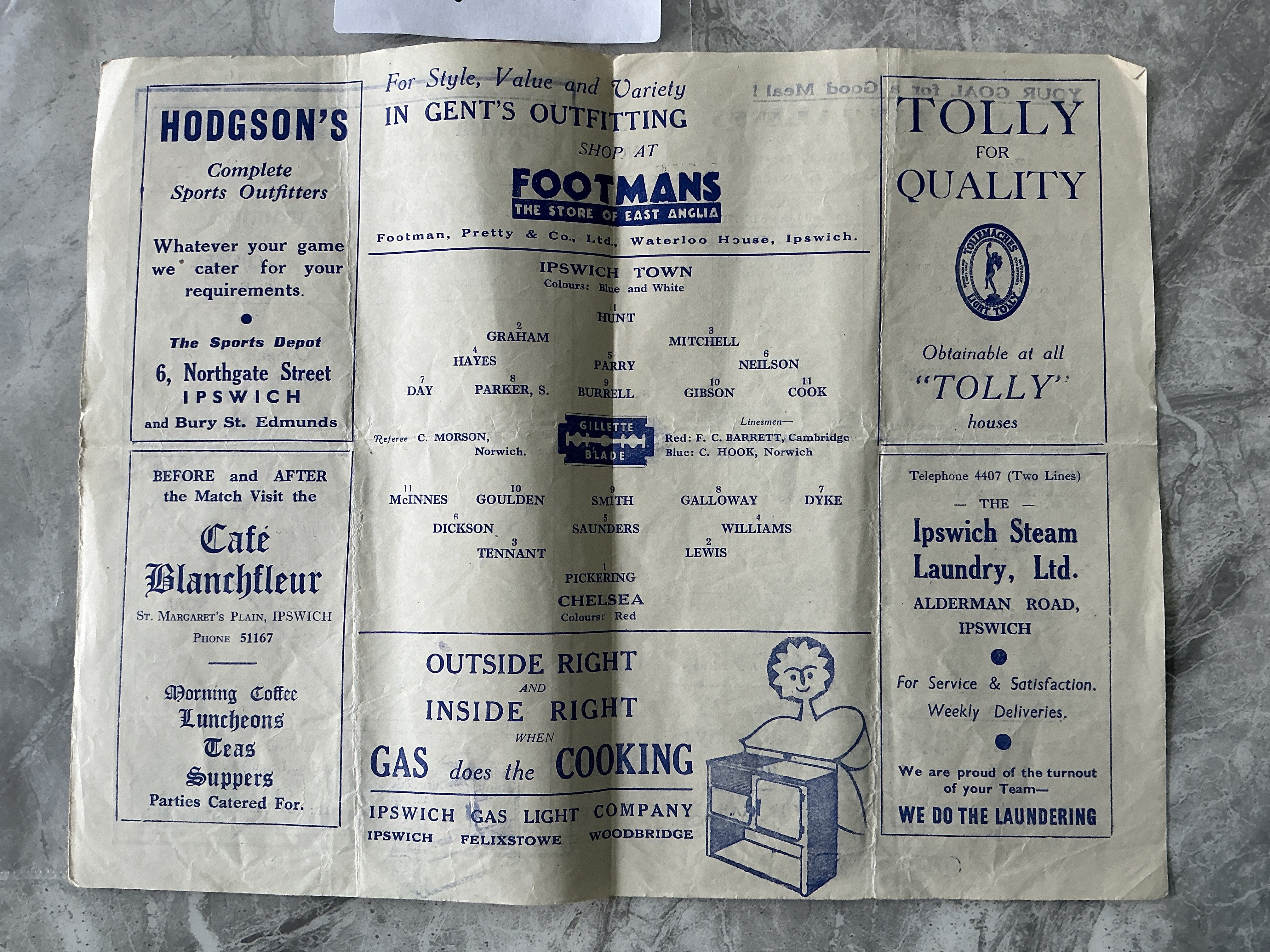 48/49 Ipswich Town Reserve v Chelsea Football Programme: Football Combination dated 21 8 1948. 4 pager is good with no team changes but has number written to cover. Fold.