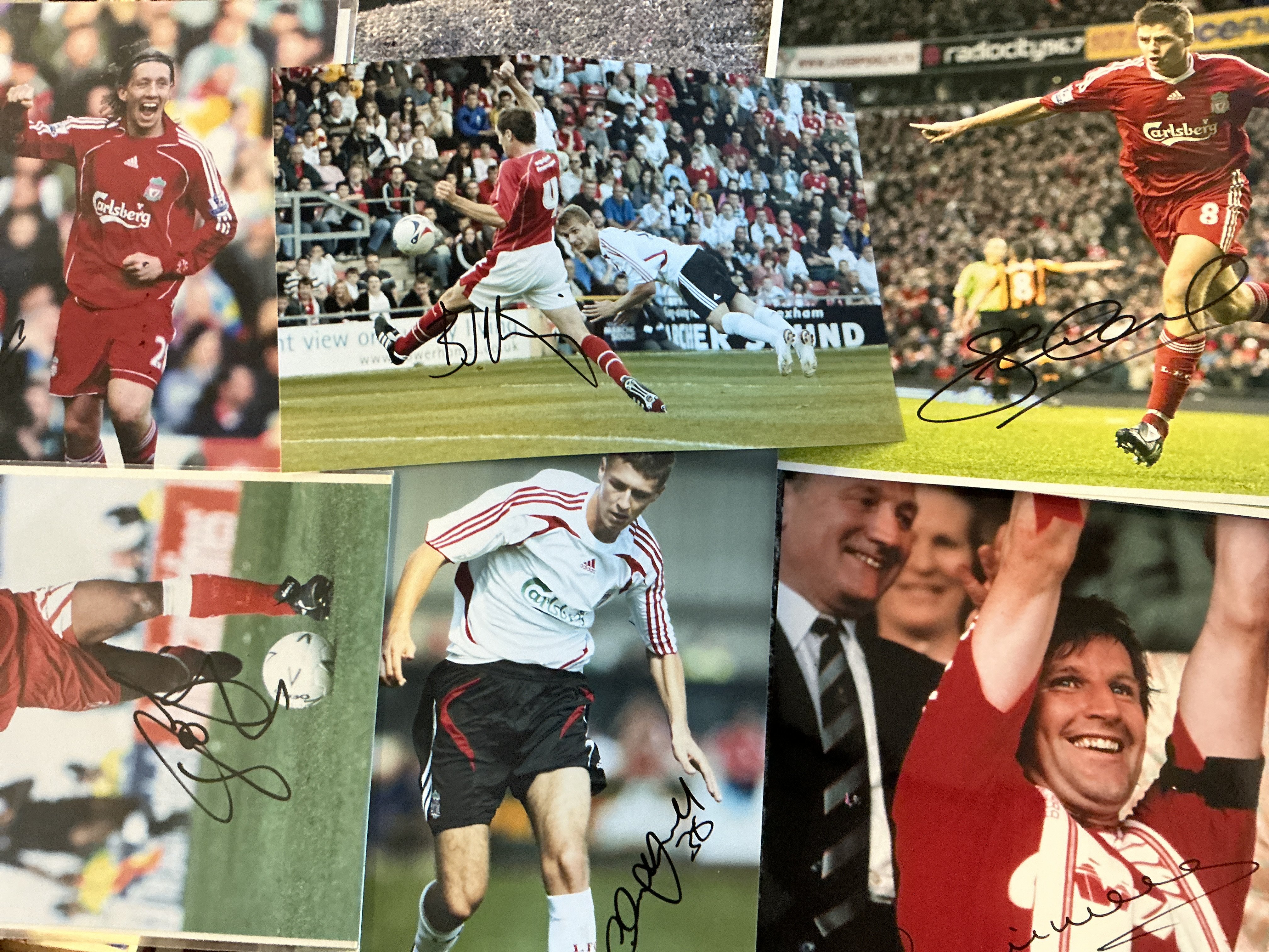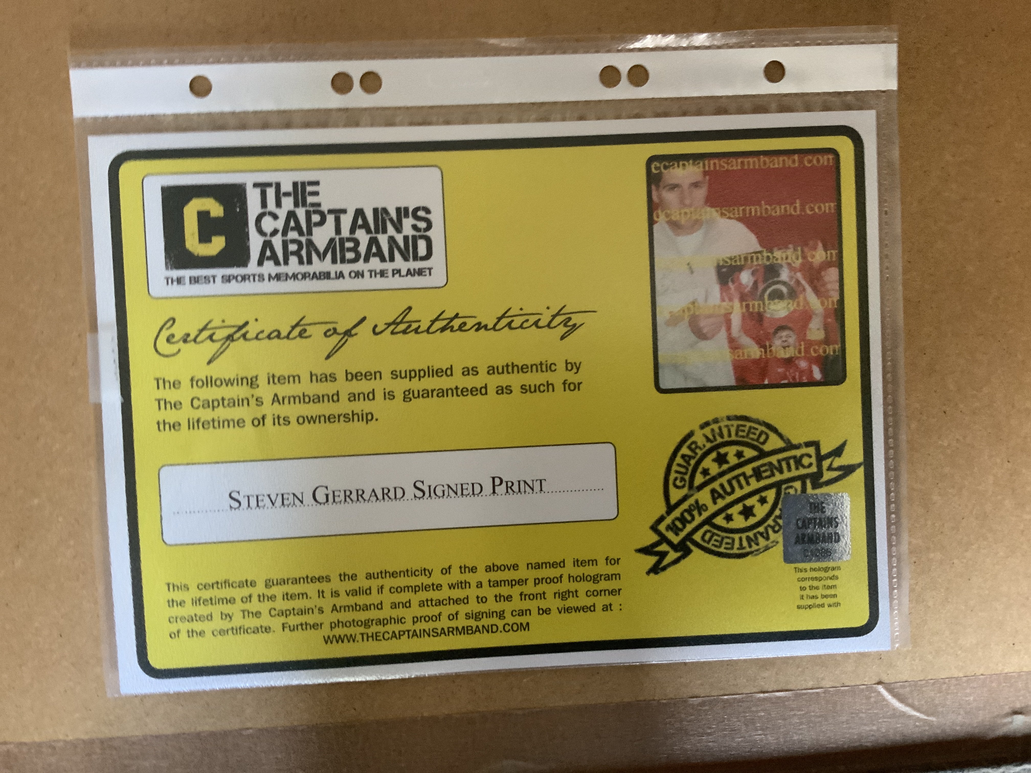 Steve Gerrard Signed Framed Football Photo + More: Depicts Gerrard lifting the 2005 Champions League trophy. Hand signed with COA. Measures 23 x 17 inches. C/W 22 large photos/prints signed by Smith Gerrard Whelan Barnes and more.