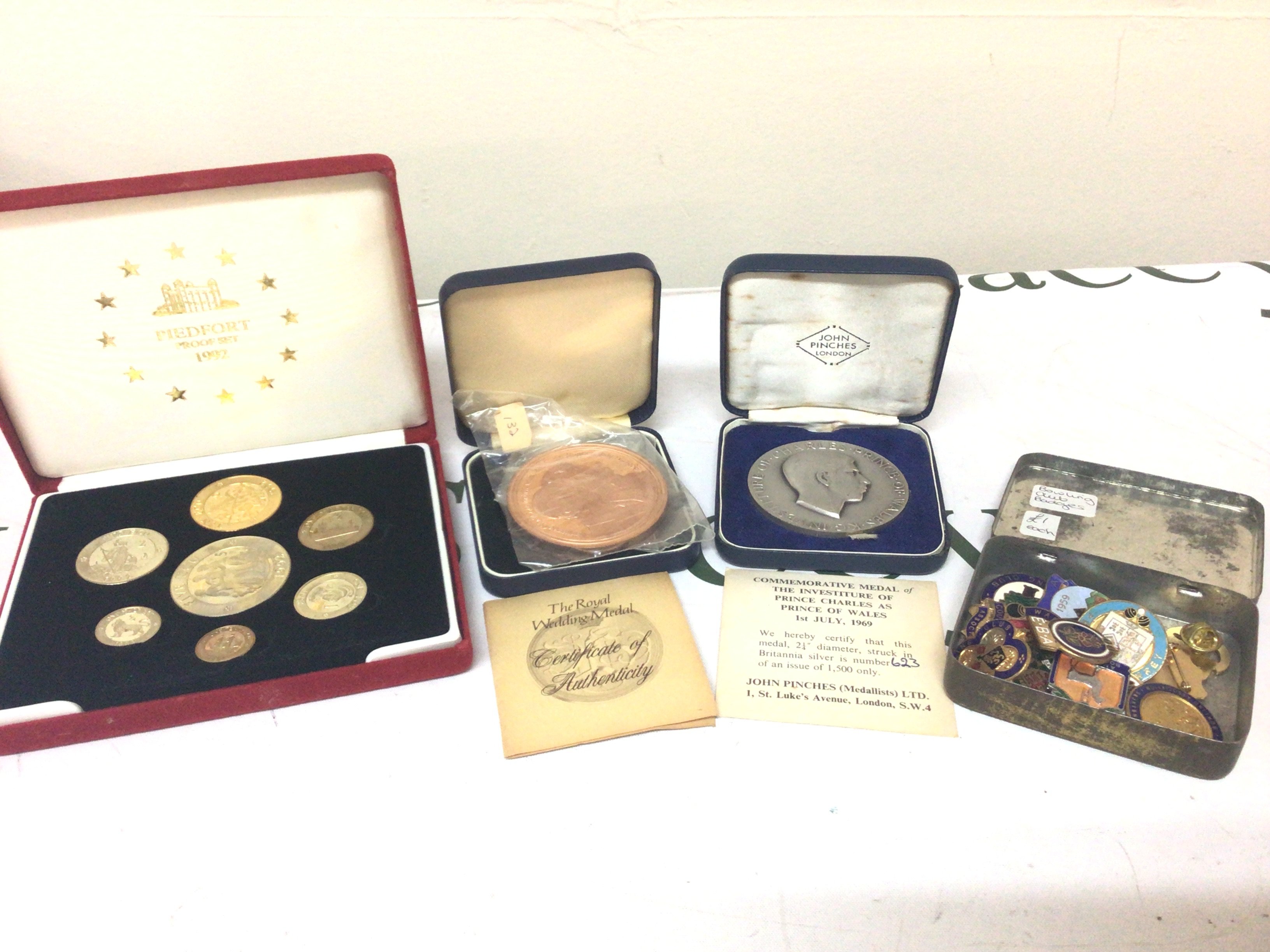A cased set of 1992 Piedfort ECU coins a limited edition Britannia 1969 Investiture Medal 623/1500. and a tin of badges.