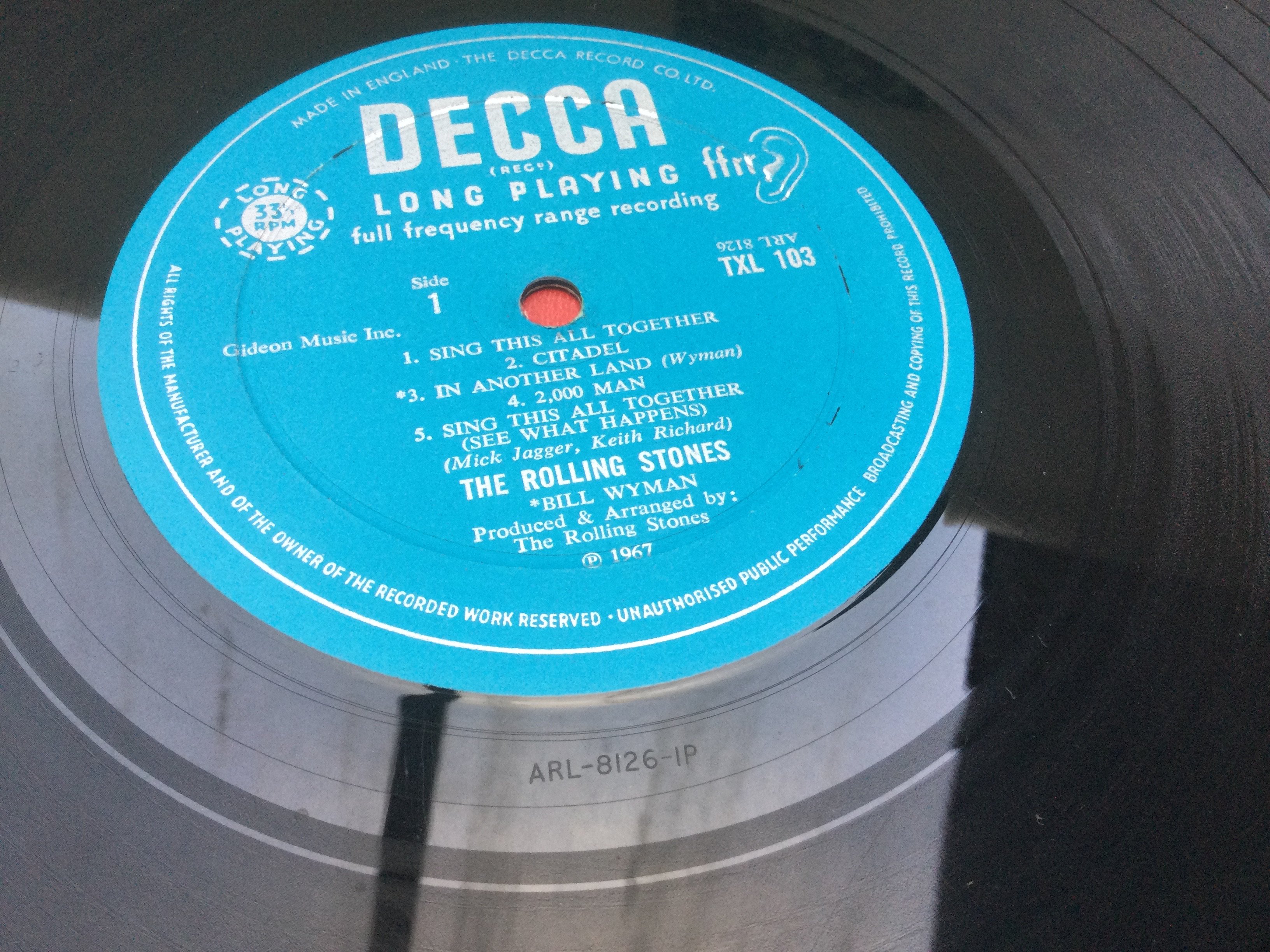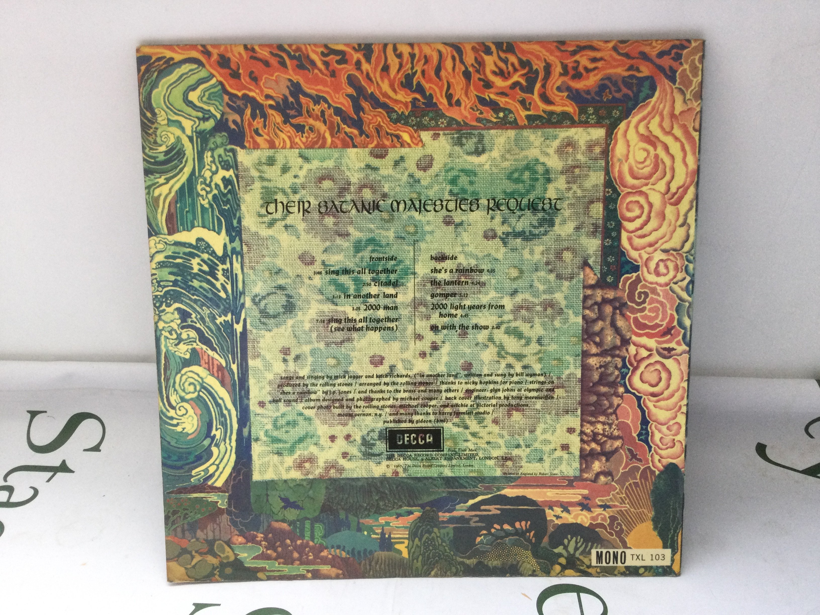 A first UK mono pressing of The Rolling Stones LP Their Satanic Majesties Request, TXL 103 with turquoise deep groove Decca label and 1P/ P1 matrix. Includes original red and white printed inner sleeve. Vinyl and sleeve both EX, inner sleeve VG+.