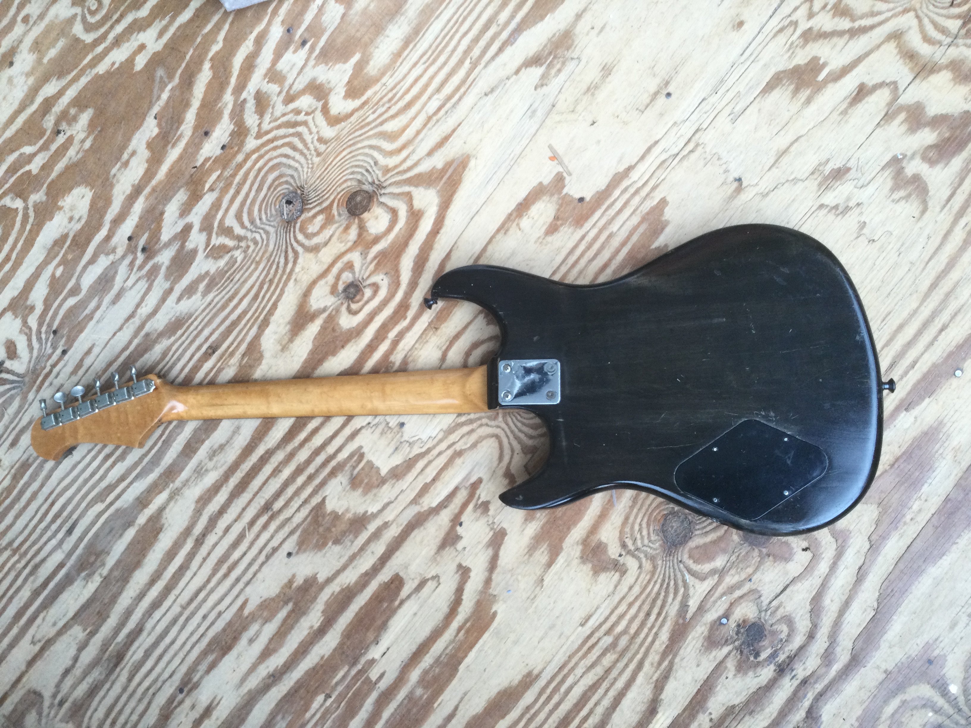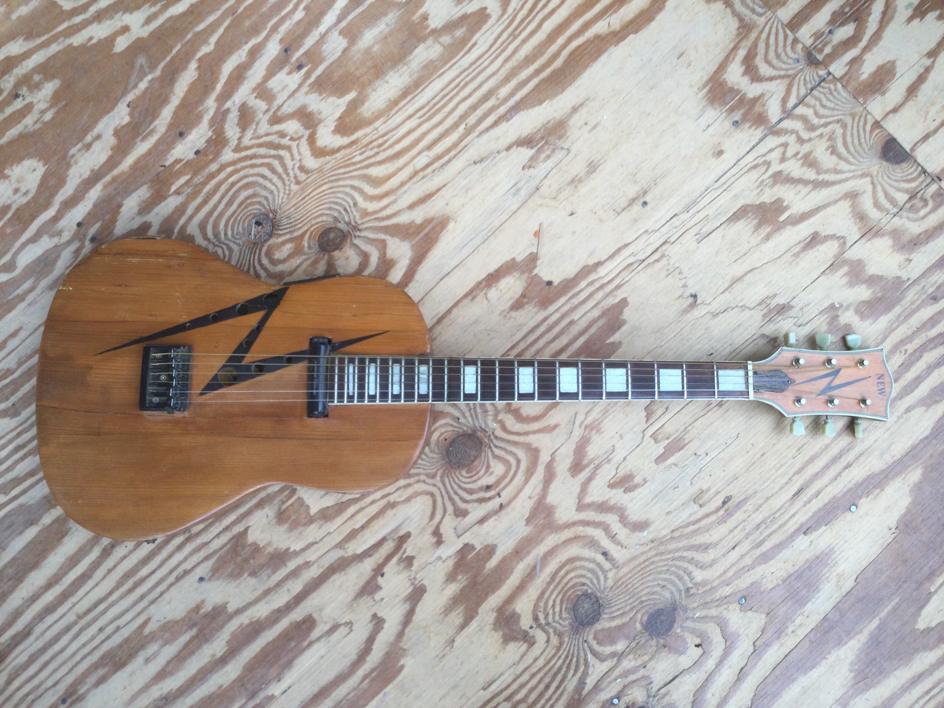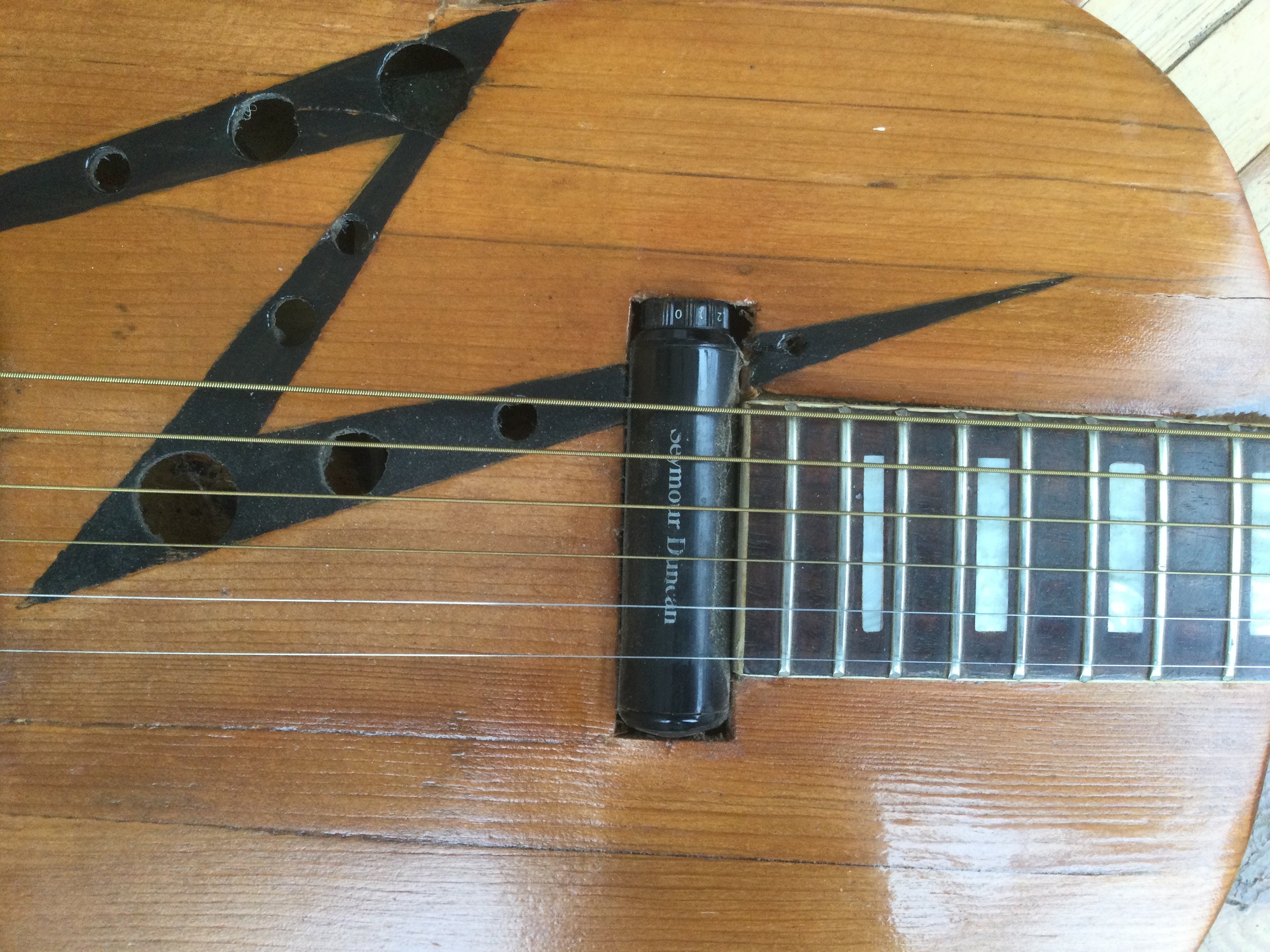 A scratch built electric guitar fitted with two humbuckers, grover tuners and a birds eye maple finish plus one other scratch built electro acoustic guitar fitted with a Seymour Duncan pickup. No cases. (2).