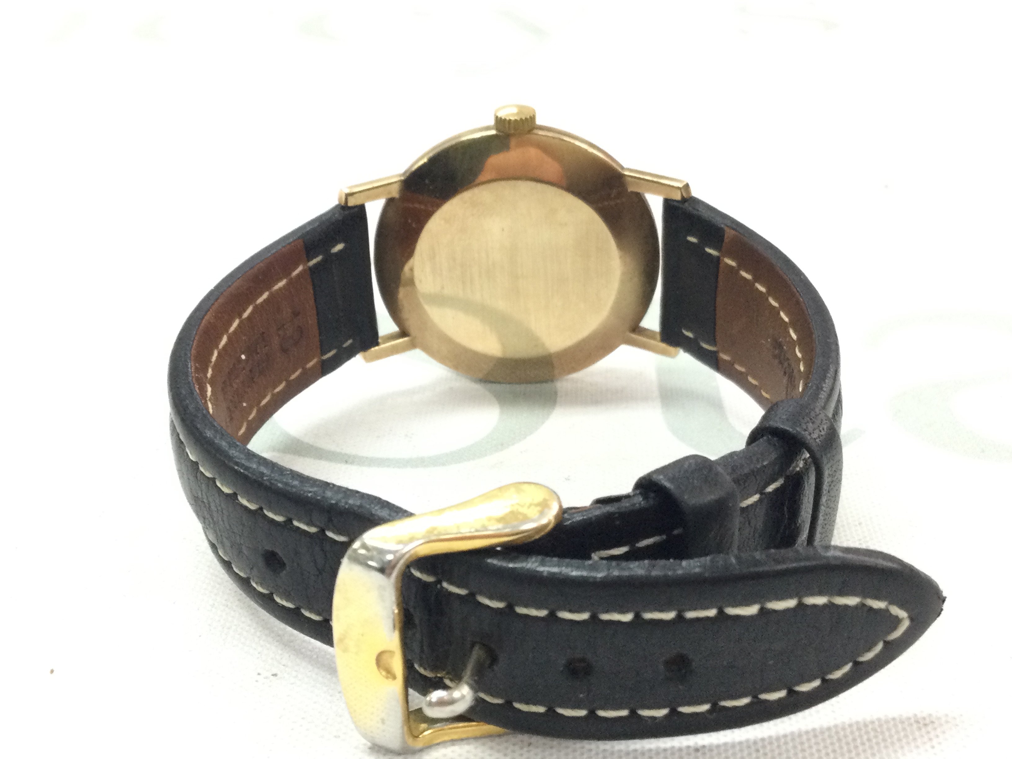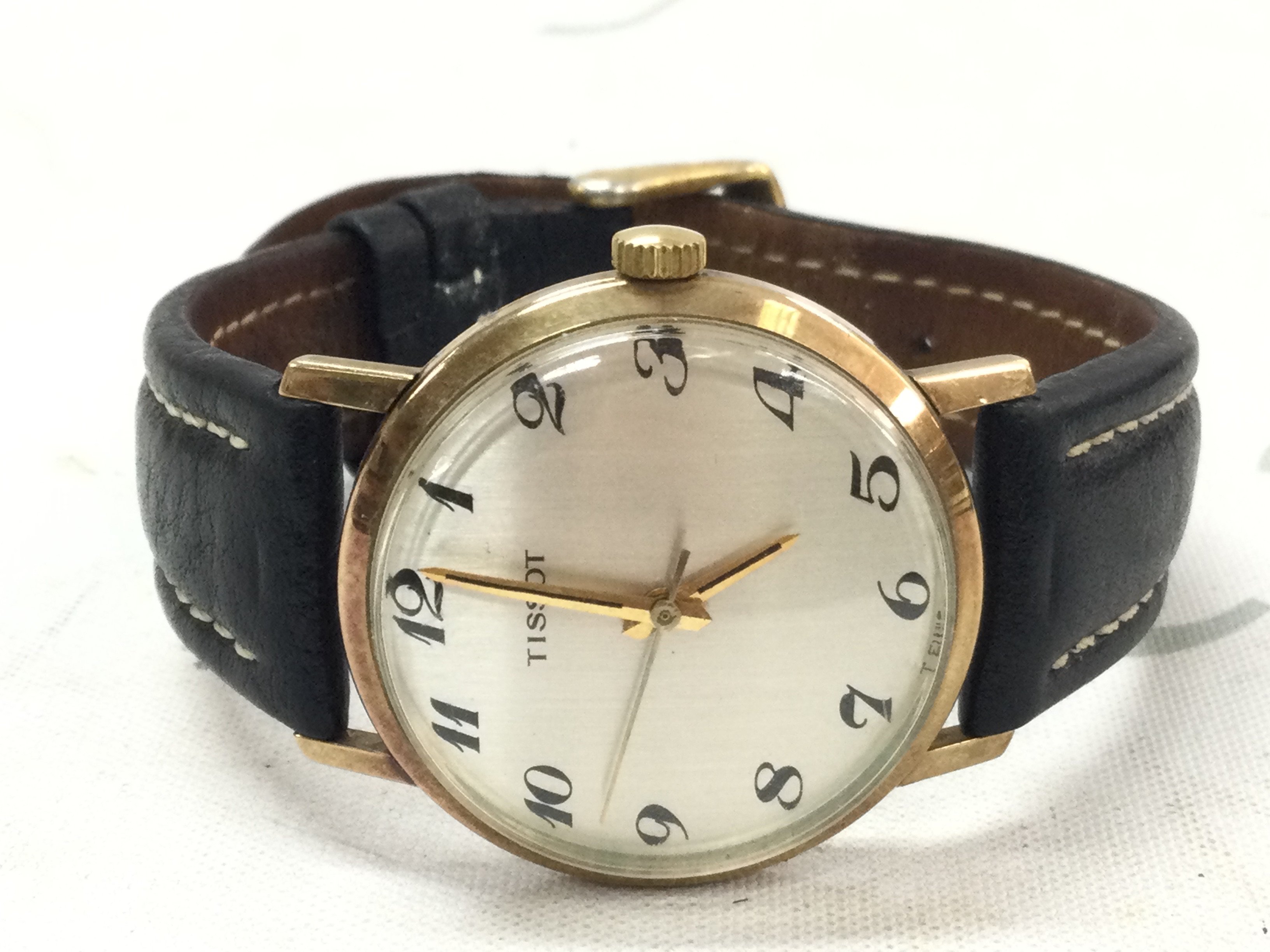 A Tissot 9ct gold vintage gents wristwatch with convex glass and leather strap (working)