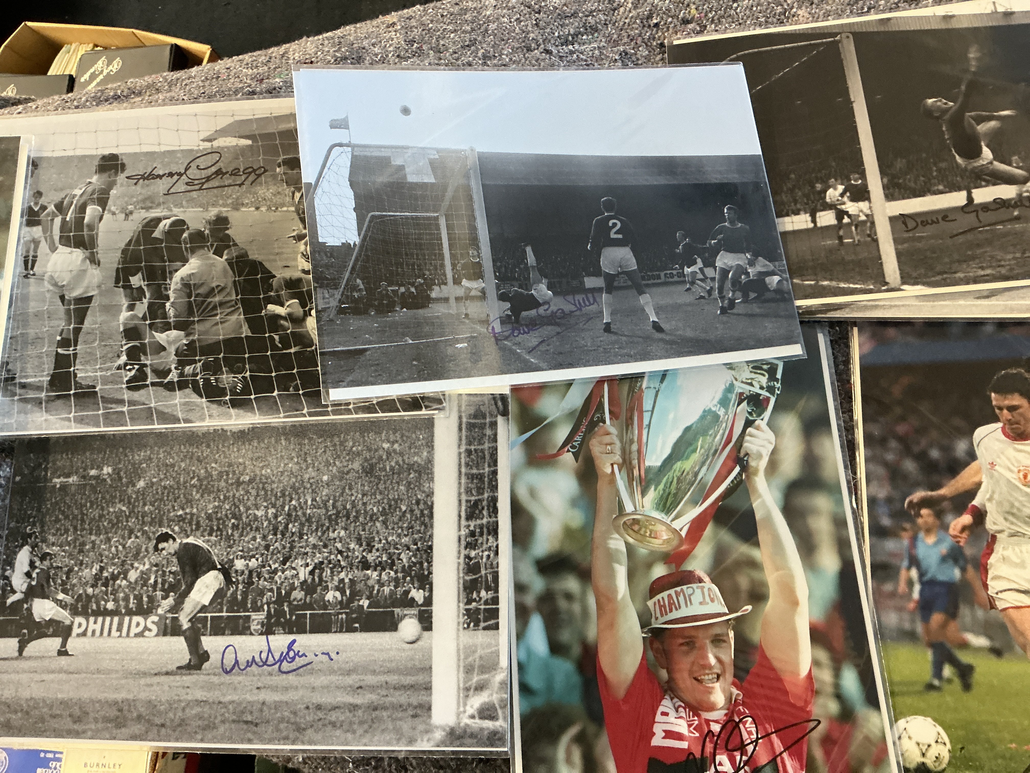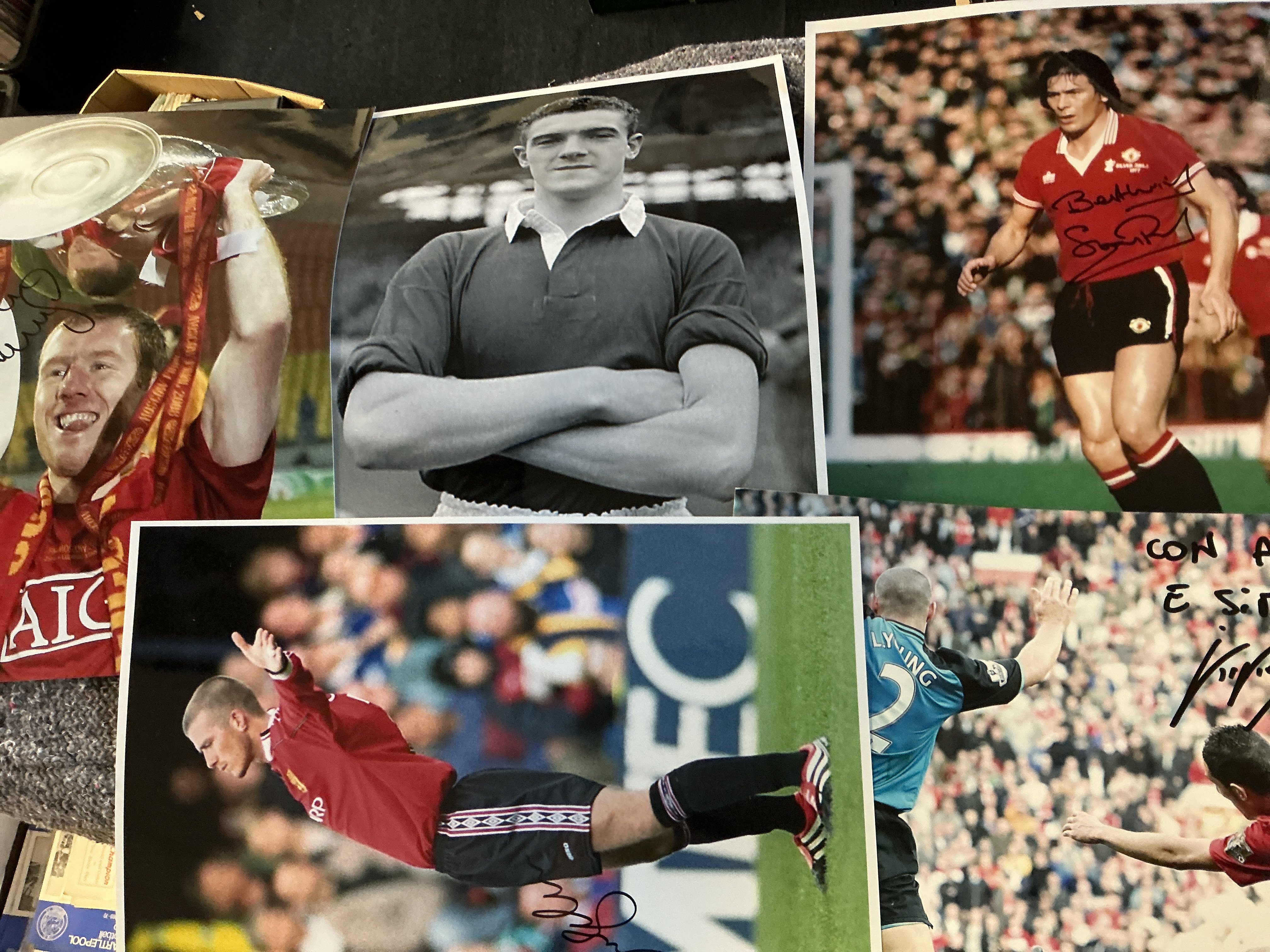 Manchester United Signed Football Photos: Large photos/prints to include many legends. Rooney Ronaldo Scholes Pearson Giggs Ferguson Law Sharpe Stepney Gregg and more. Nice lot. (63)