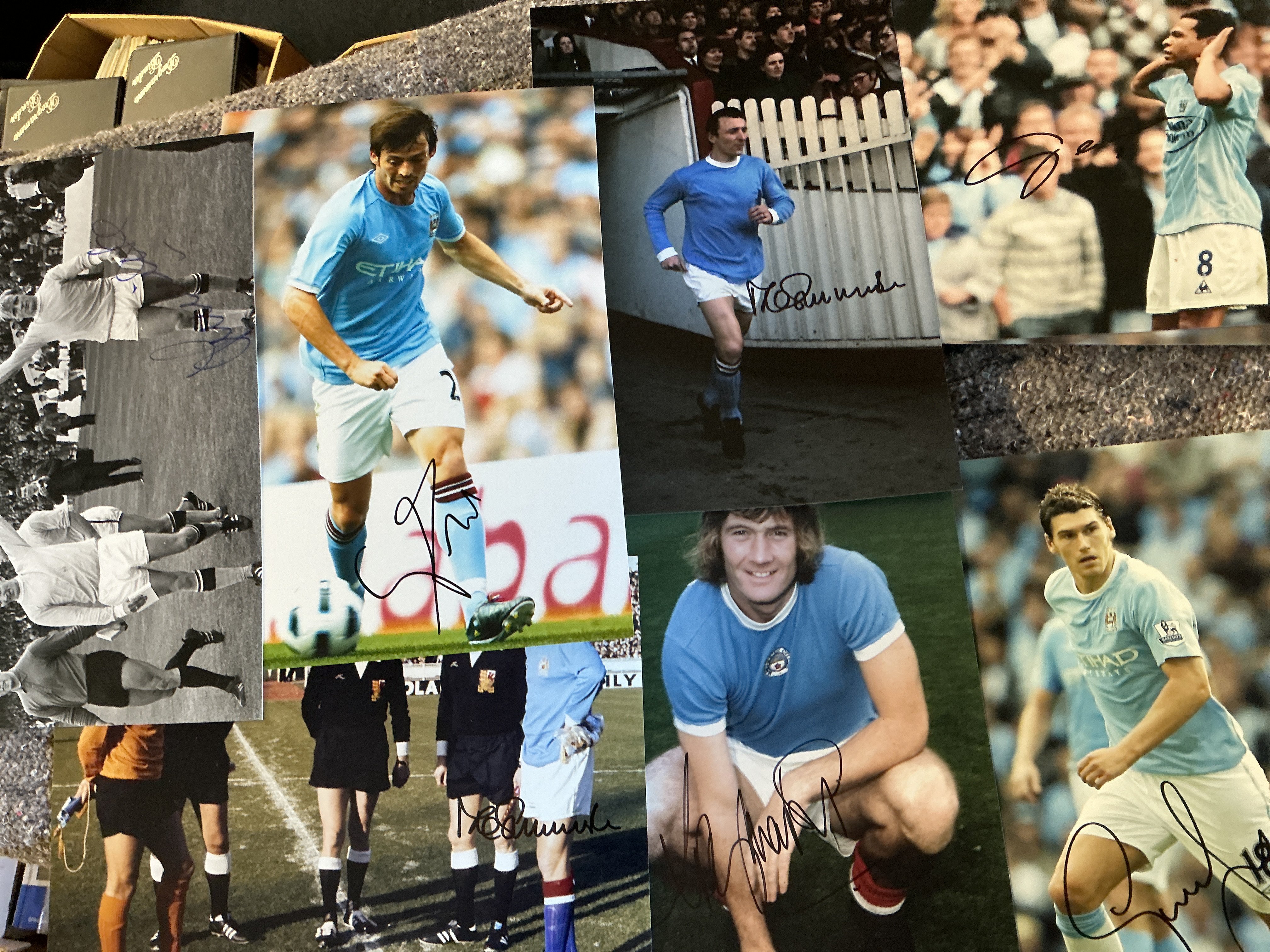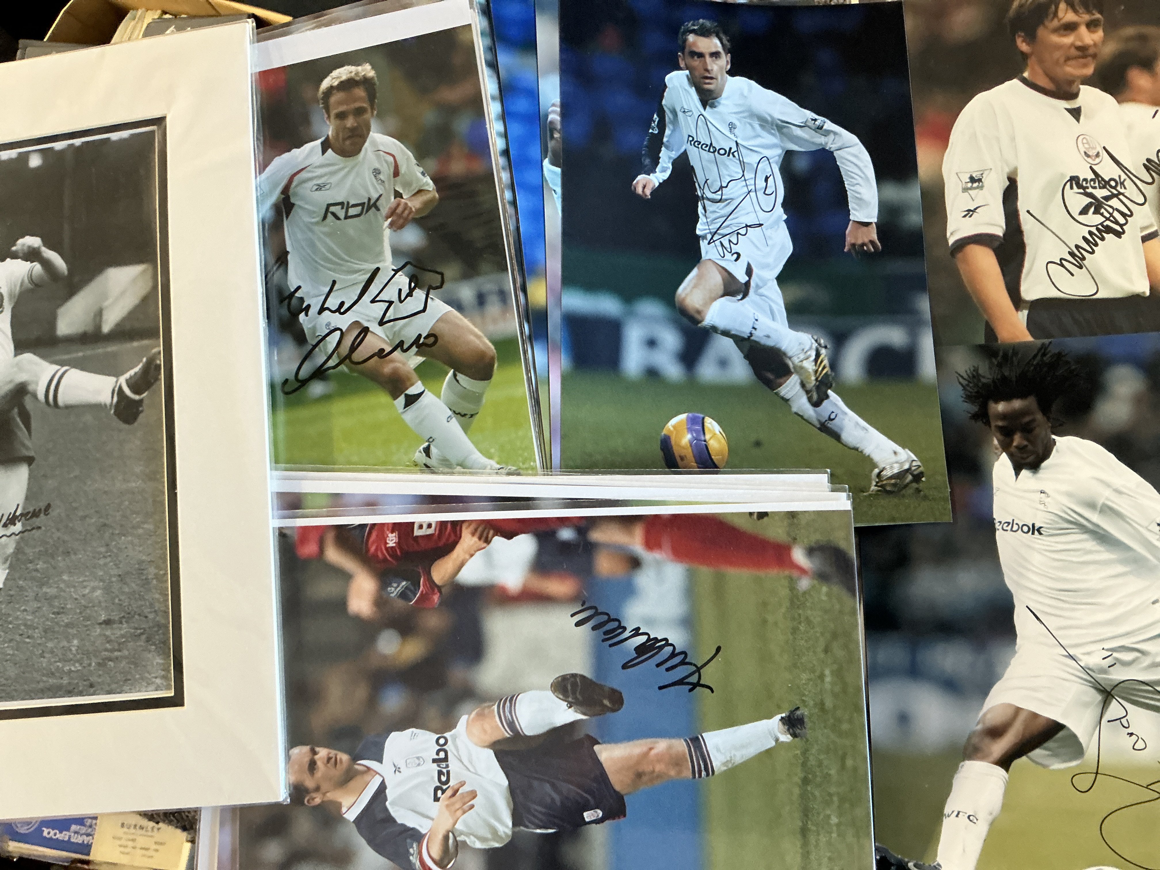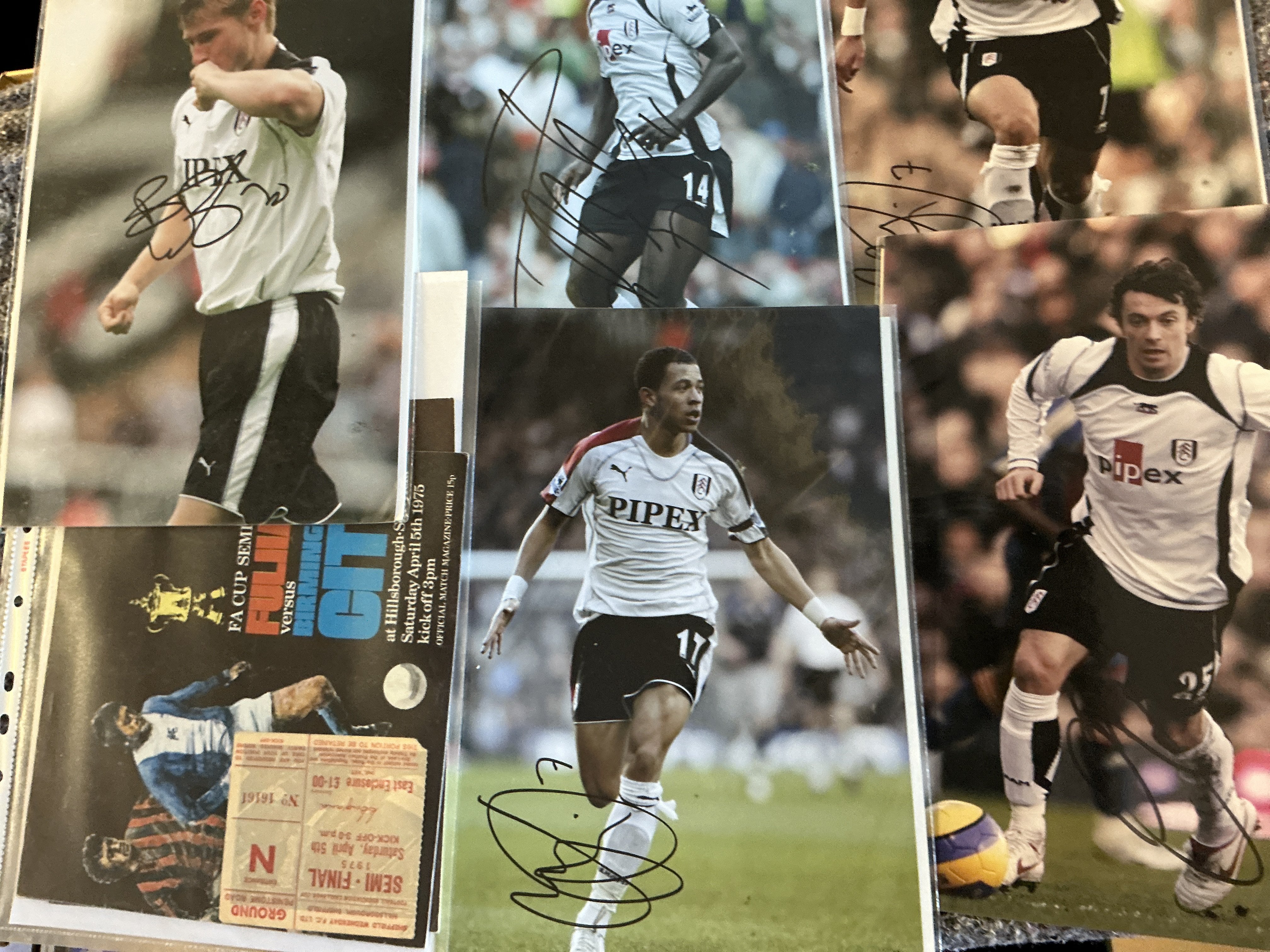 Signed Football Photos + Prints: Worth a look to include 15 Reading players from 2006/07, 8 Chelsea with Bentley Cooke Bridge Greaves, 20 Manchester City with Lee Summerbee Marsh Richards Law, Aston Villa with McPartland, Crowther Ross Barry Harewood, 6 Fulham with McBride Diop + 1975 FA Cup semi final programme and ticket, Wigan 02/03 signed squad, 45 Bolton with Lofthouse Speed Davies Pedersen Gardner Walker Reid Nolan plus 8 Leeds with McQueen Milner Beckford and Matteo. (130+)