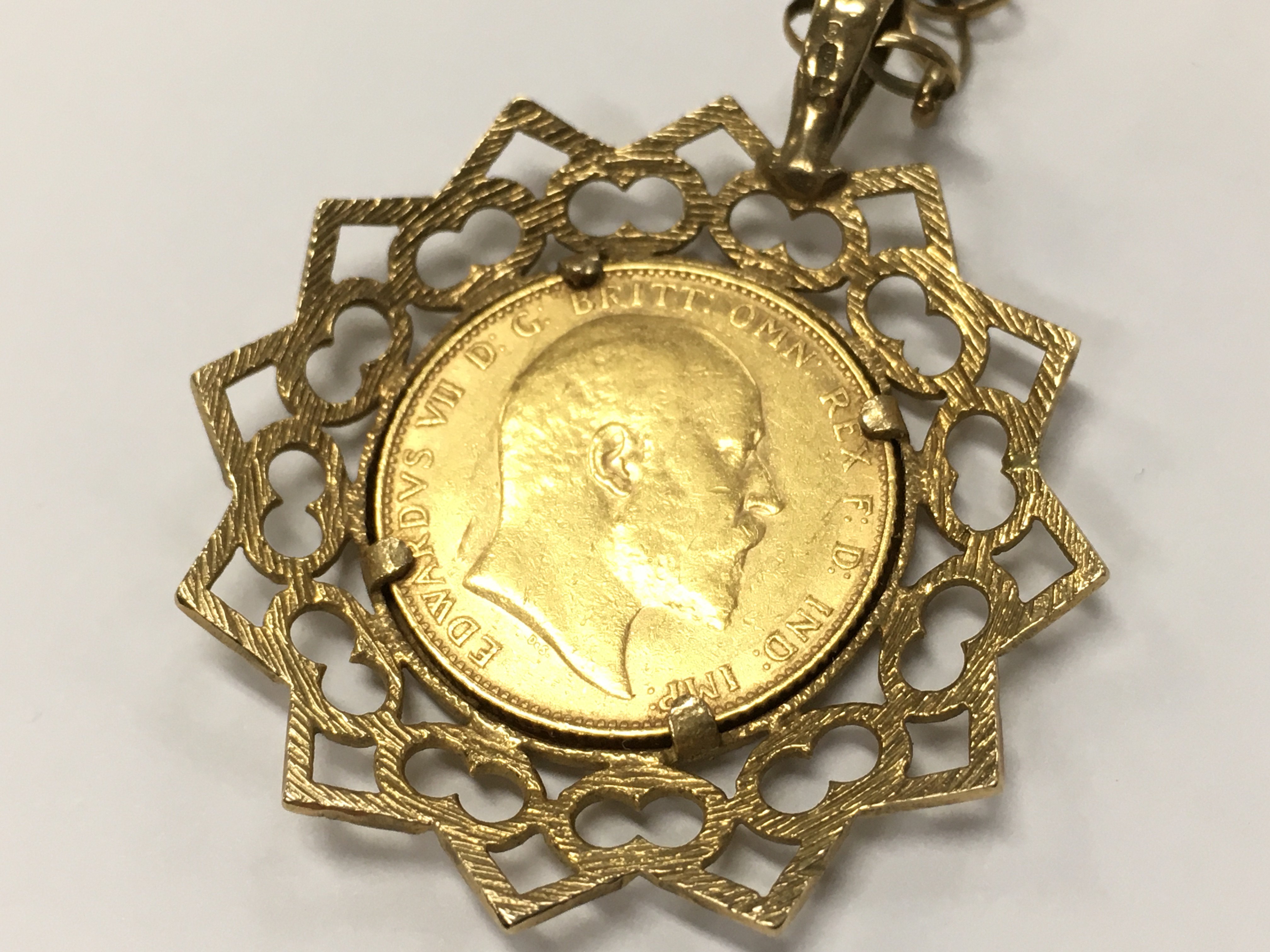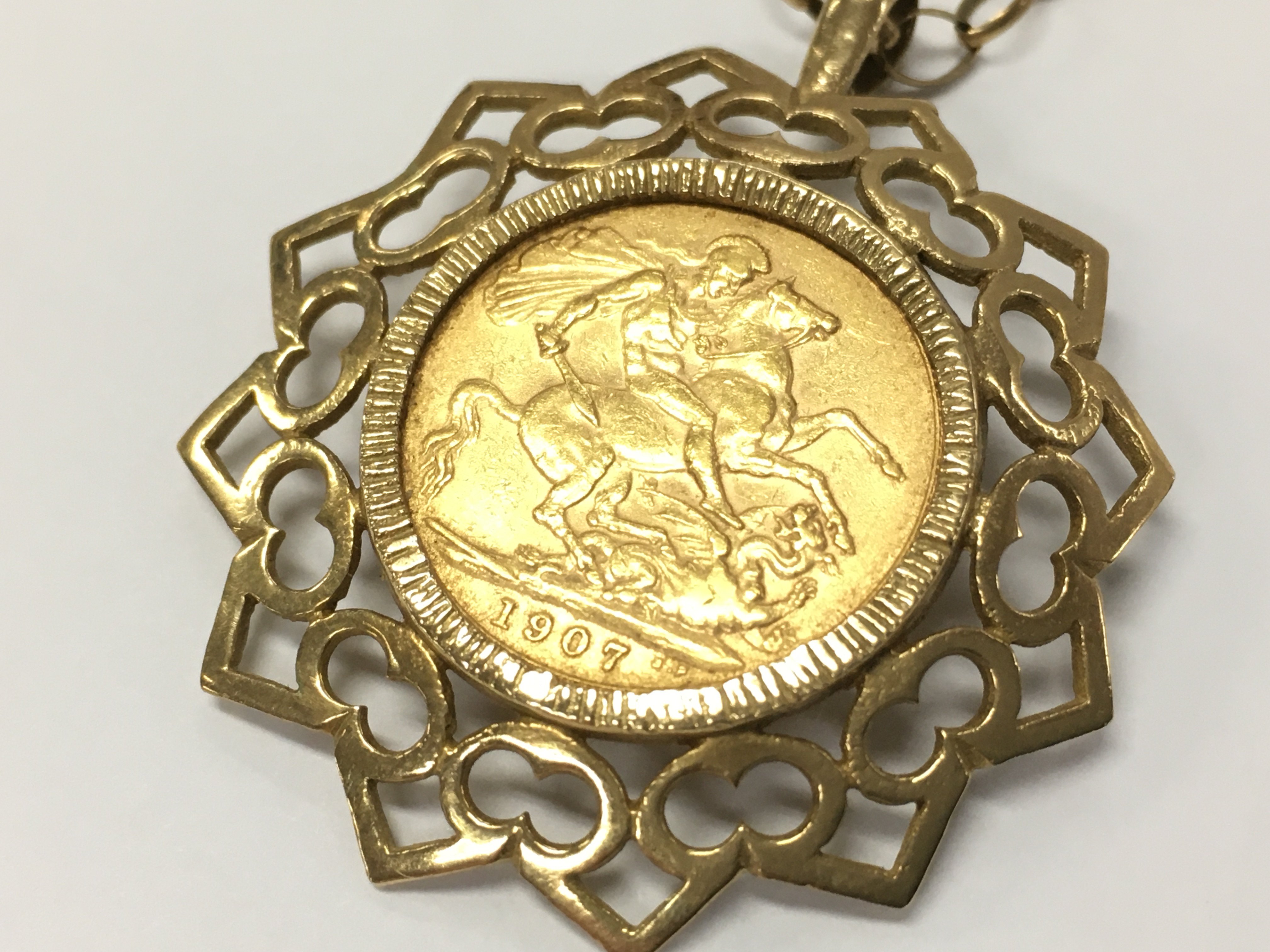 A 1907 full sovereign with mount and chain , 16.2g total weight. Postage category A