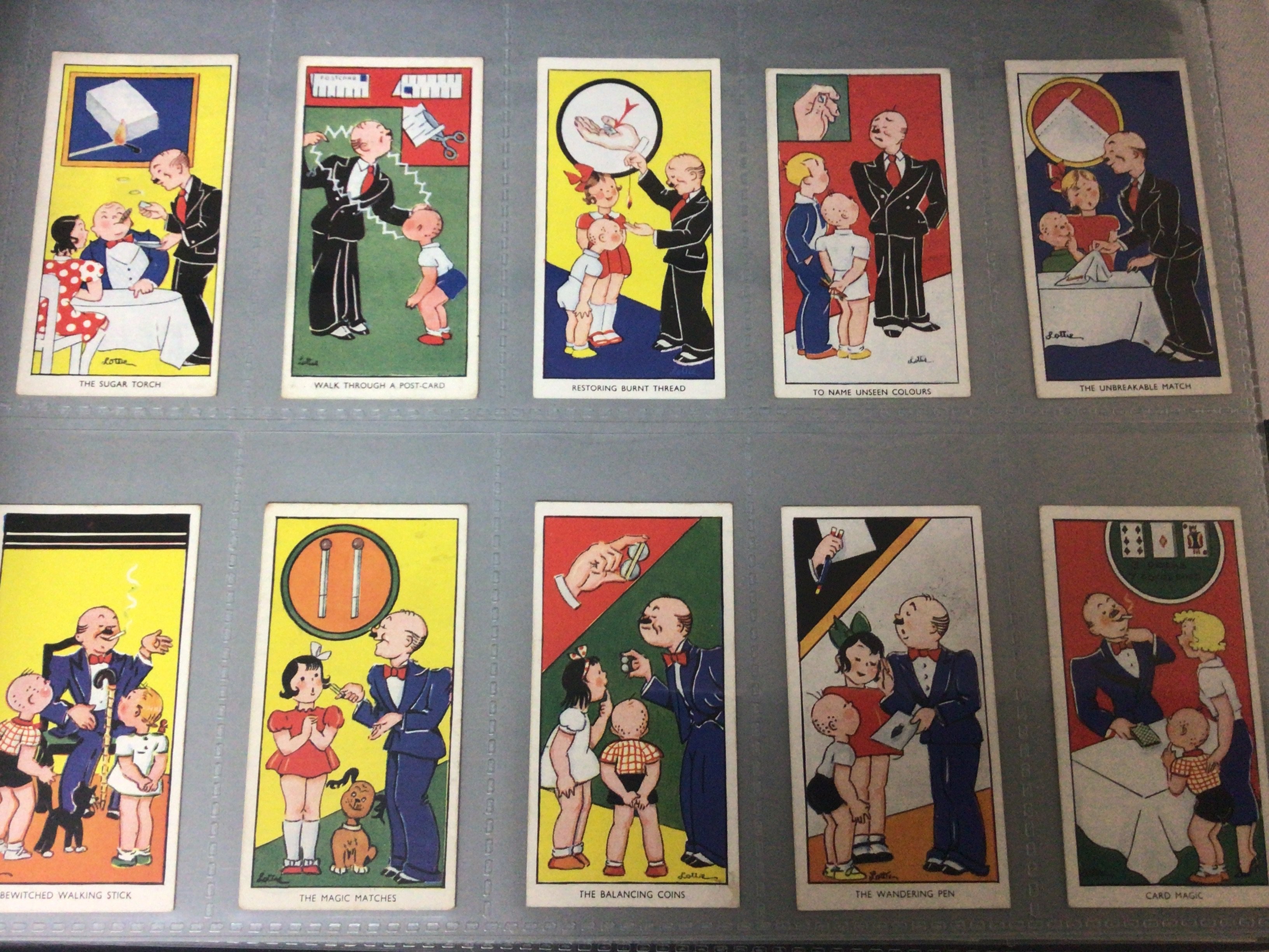 A collection of five well presented albums of Vintage cigarette cards and other cards including more recent cards Tom Thumb motor racing.Birds and their eggs Amusing Tricks and numerous other sets.