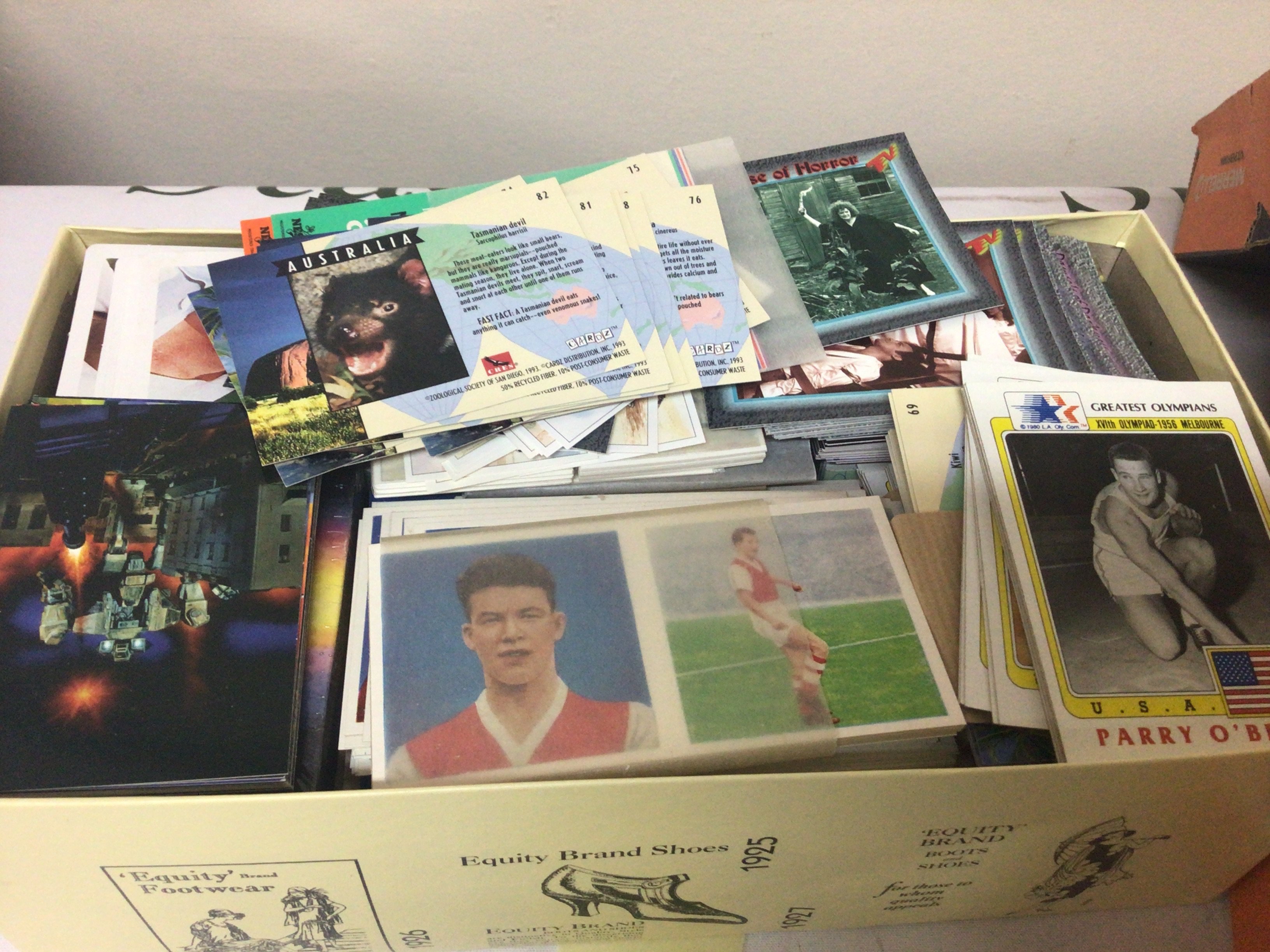 A box containing mixed Vintage postcards Tuck Post Cards C W Faulkerner cards and many others and a box containing modern mixed collectors cards including American cards Greatest Olympians and many others. Including football cards. (2)