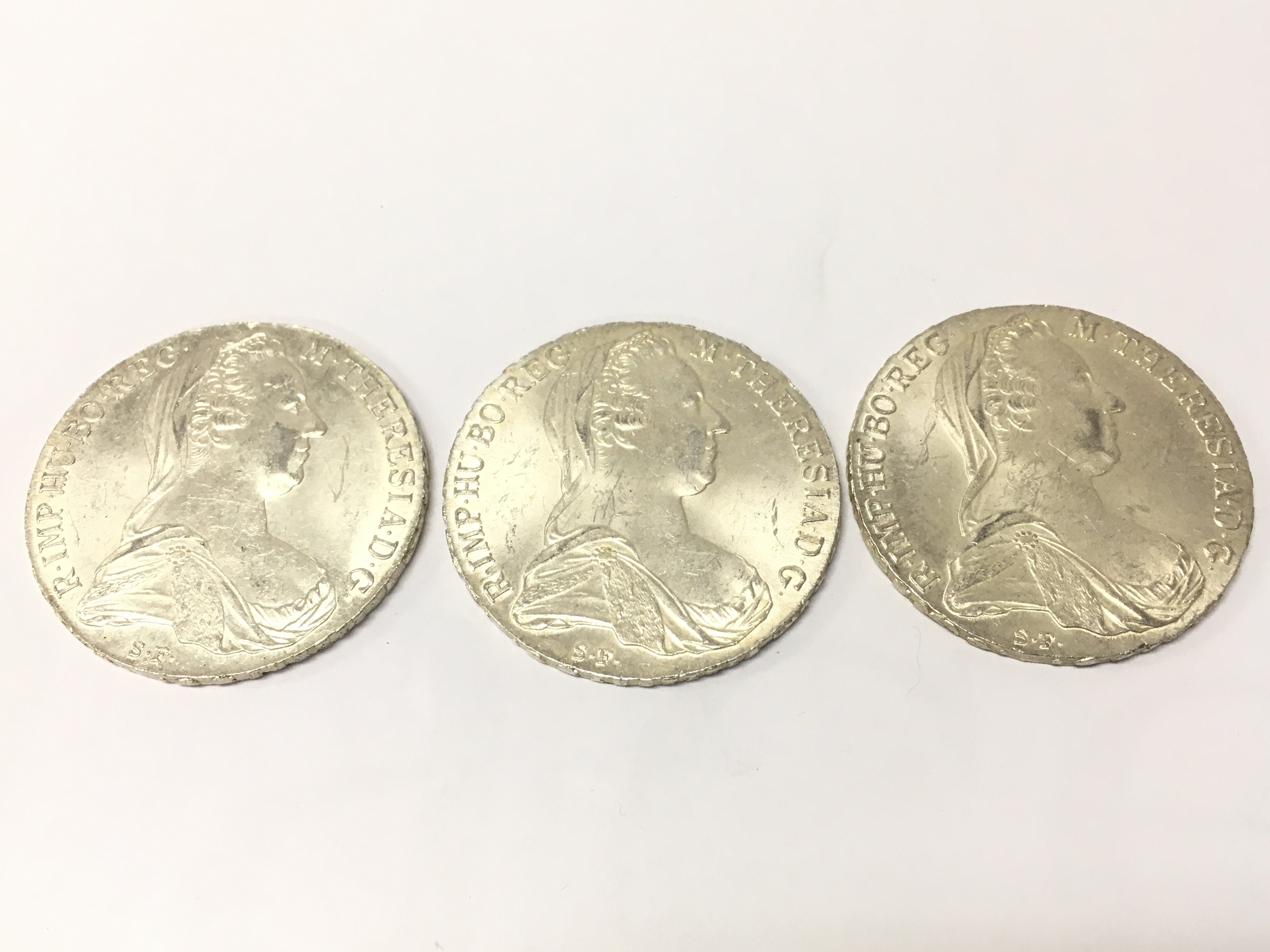 Three Austrian Maria Theresa Thaler silver coins , 84.4g total weight . Postage category A