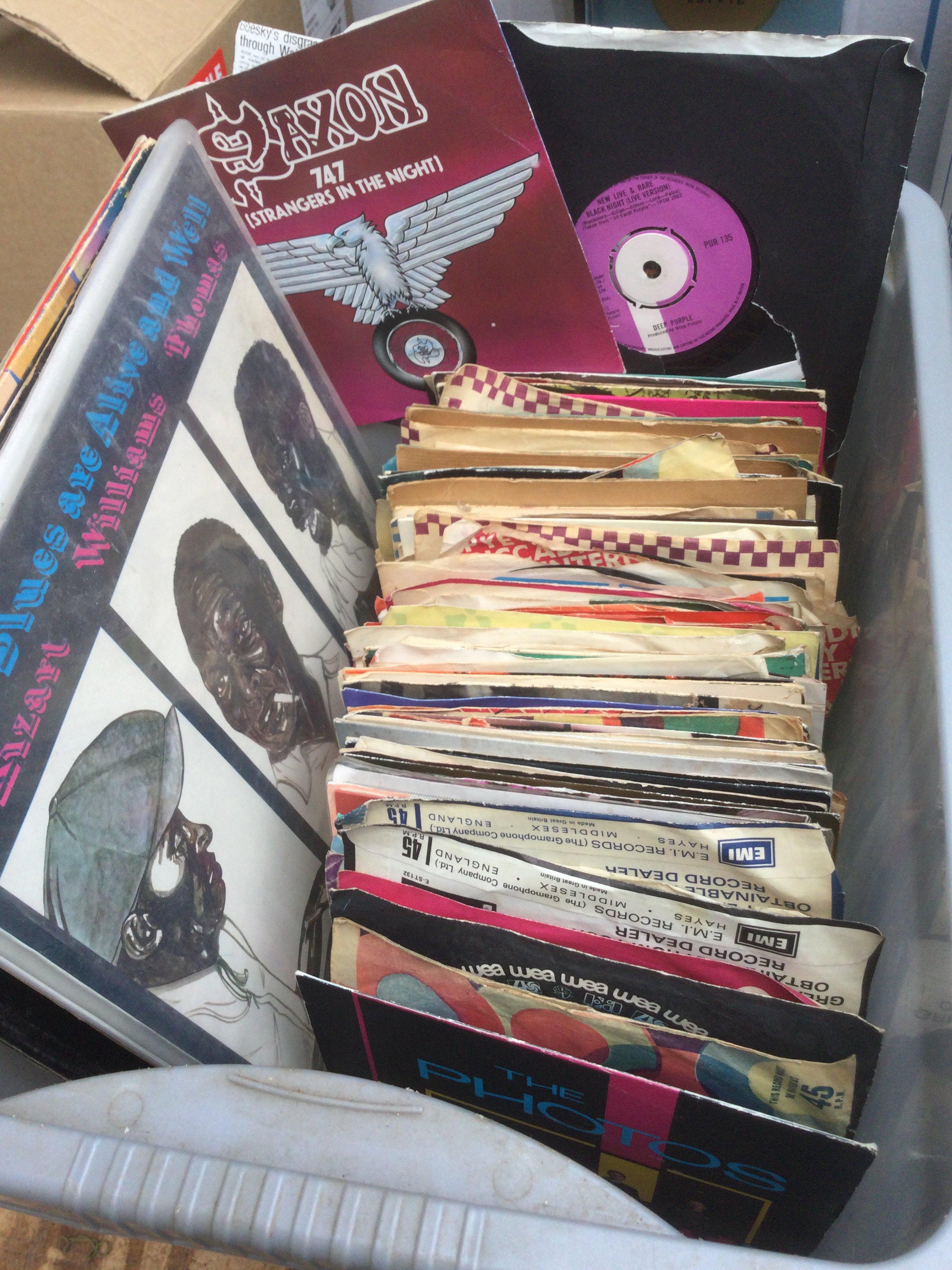 A collection of 7" singles and LPs by various artists including a clear vinyl 1975 LP, Iron Maiden, The Beatles and others.