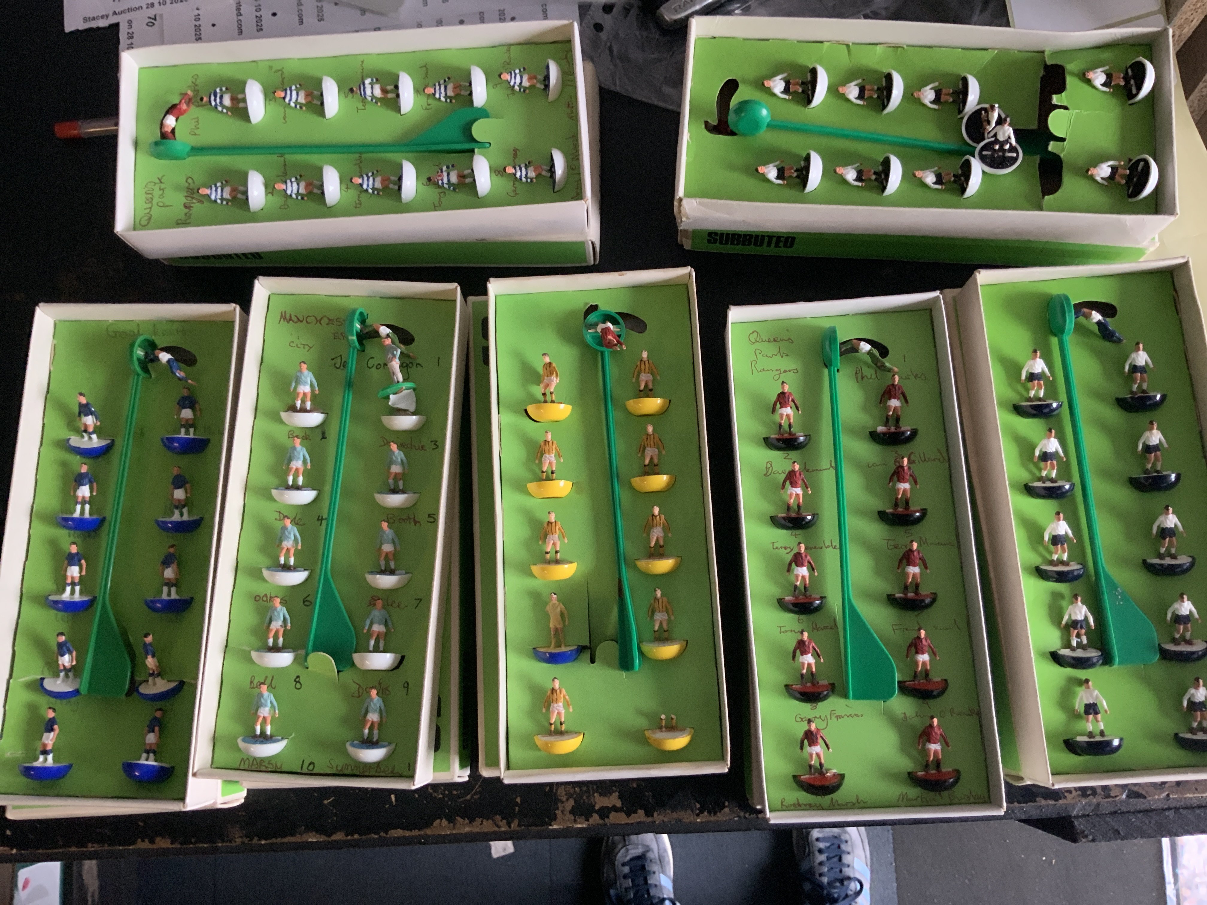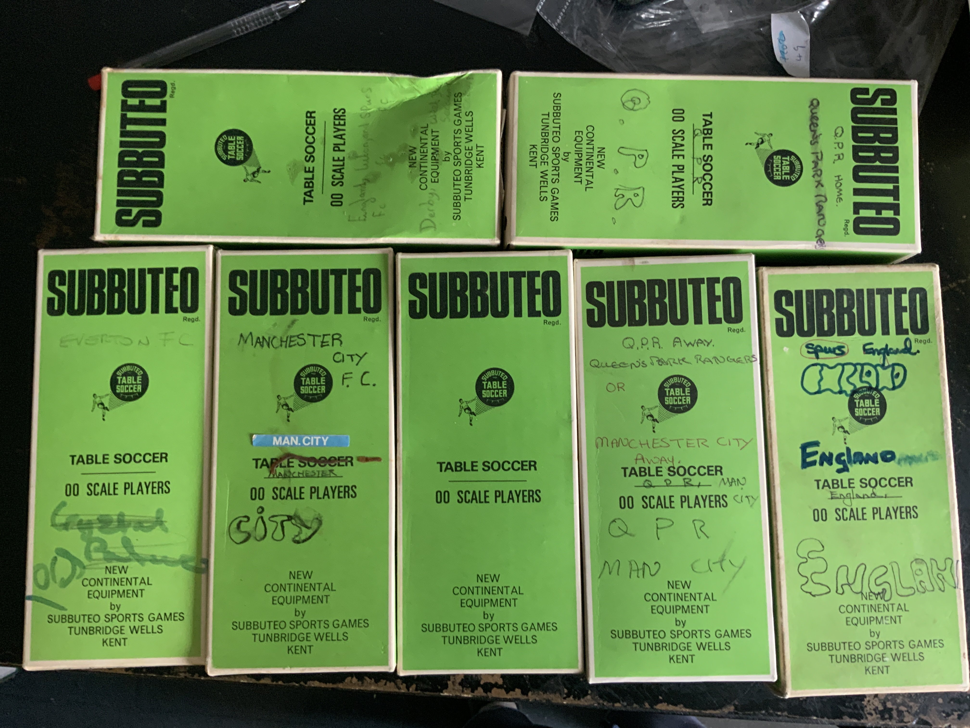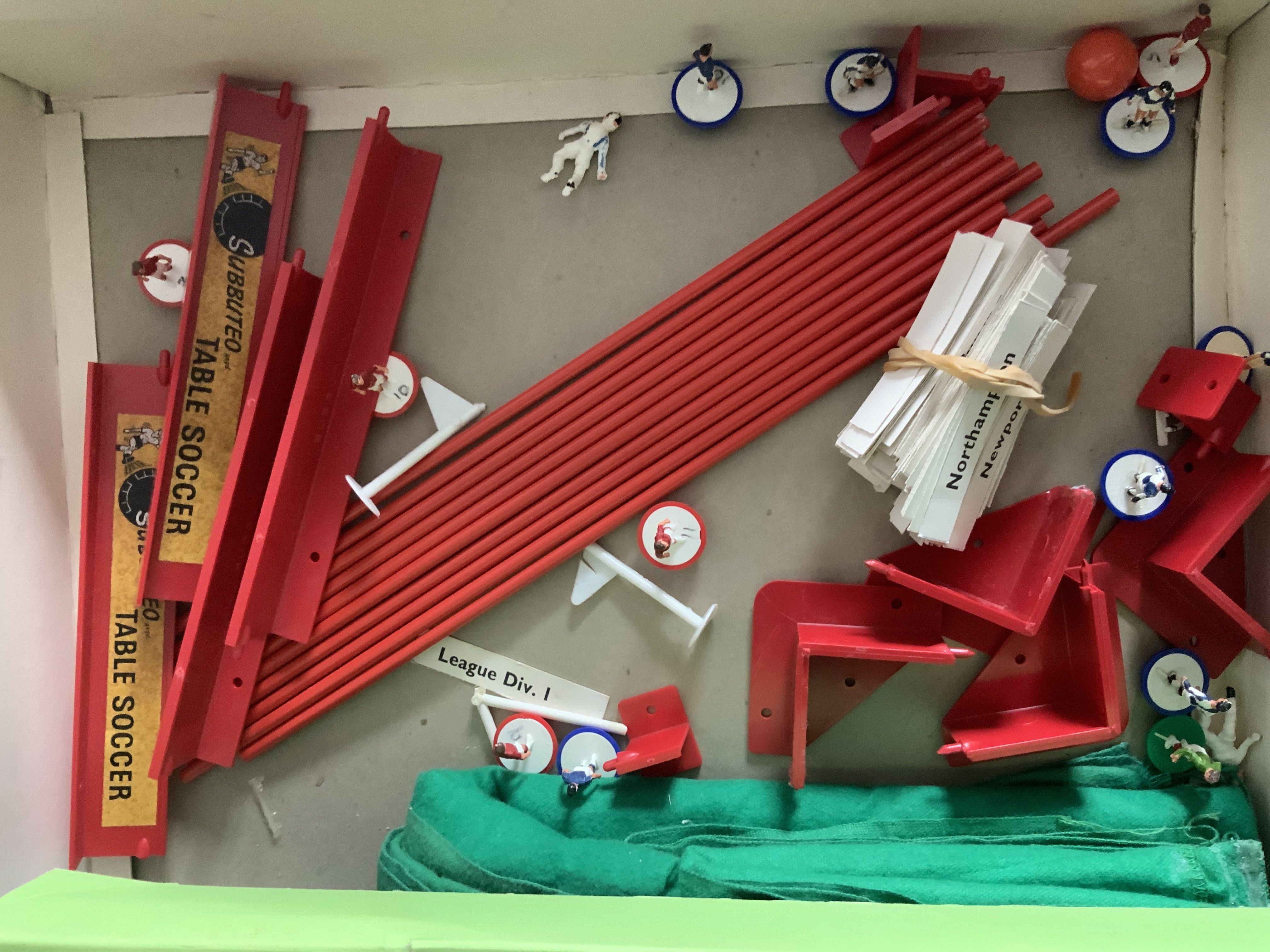 Subbuteto Football Game + Teams: Table soccer game Continental Edition which has paperwork scoreboard goals team names pitches players etc. No full teams so not complete. C/W 6 complete teams. Boxes have writing.