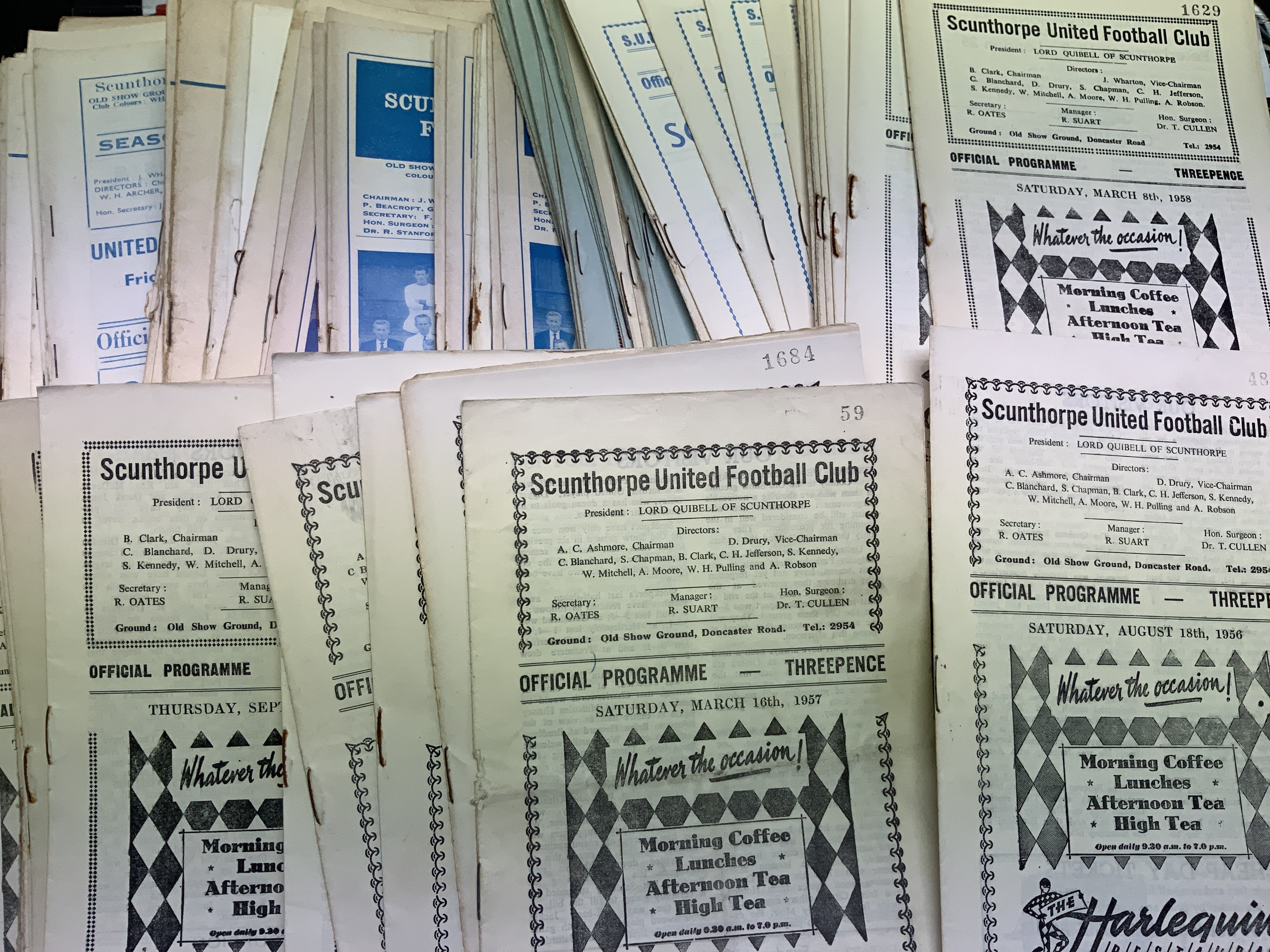 Scunthorpe United Home Football Programmes: 54/55 + 55/56 x 3, 56/57 x 2, 57/58 x 16, 58/59 x 24, 59/60 x 6. Over 60 from the 60s in very good with duplication. (est 110)