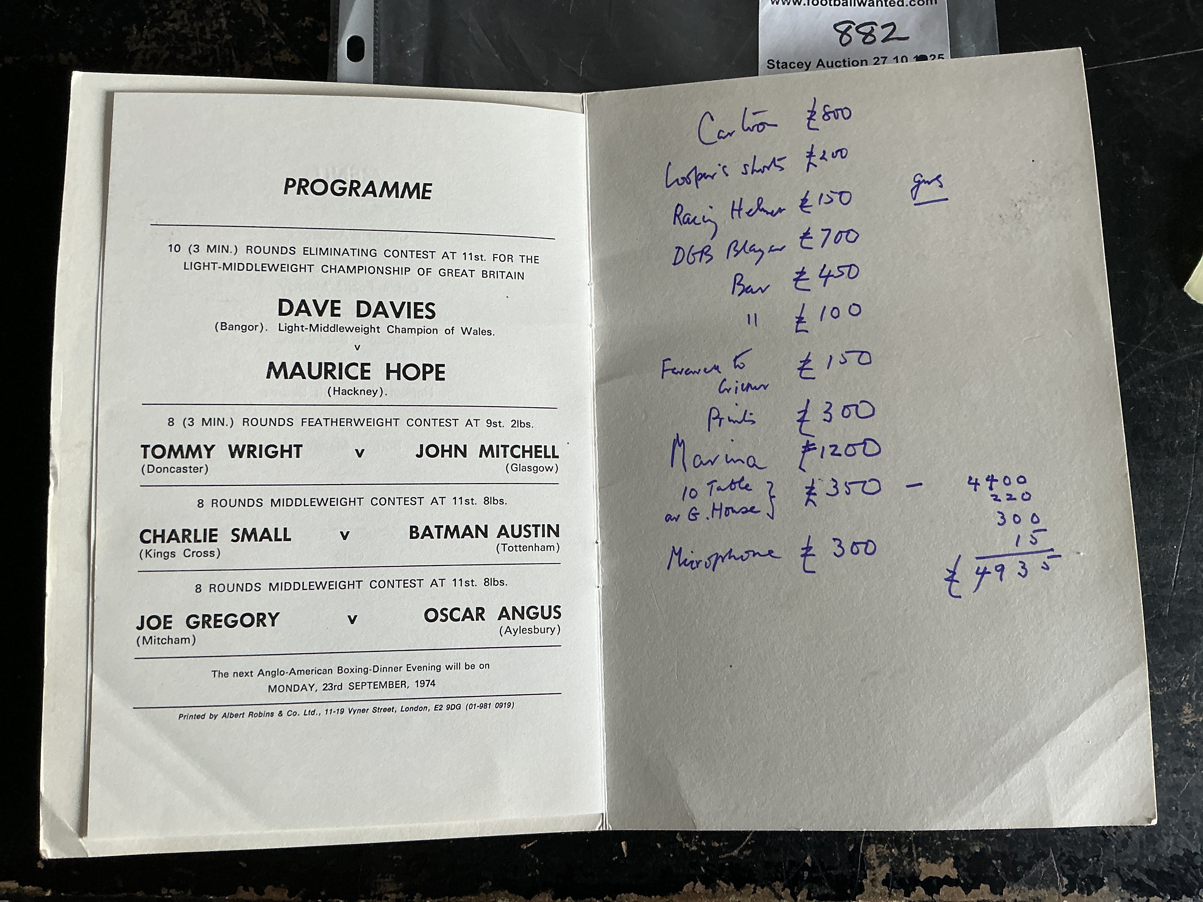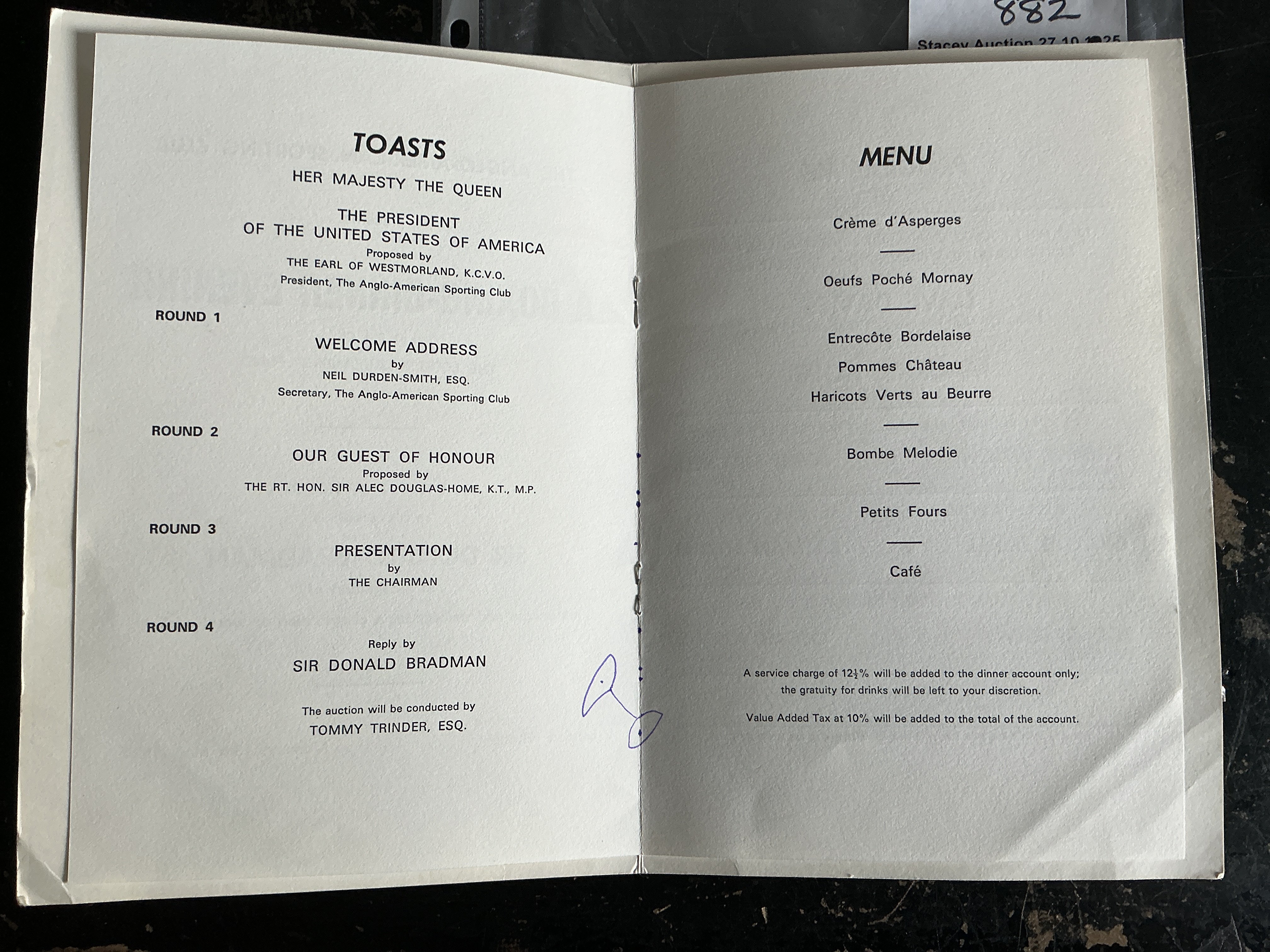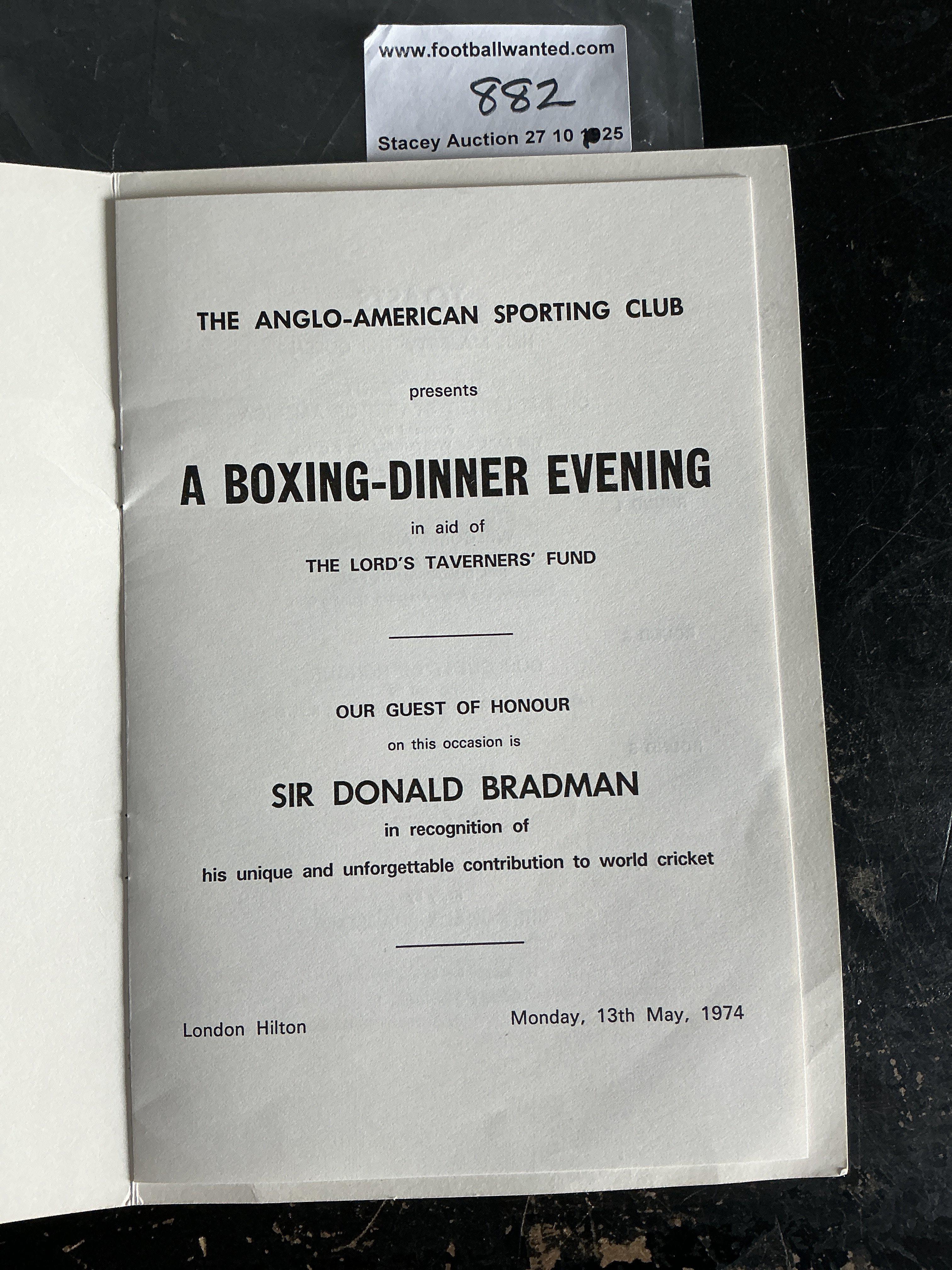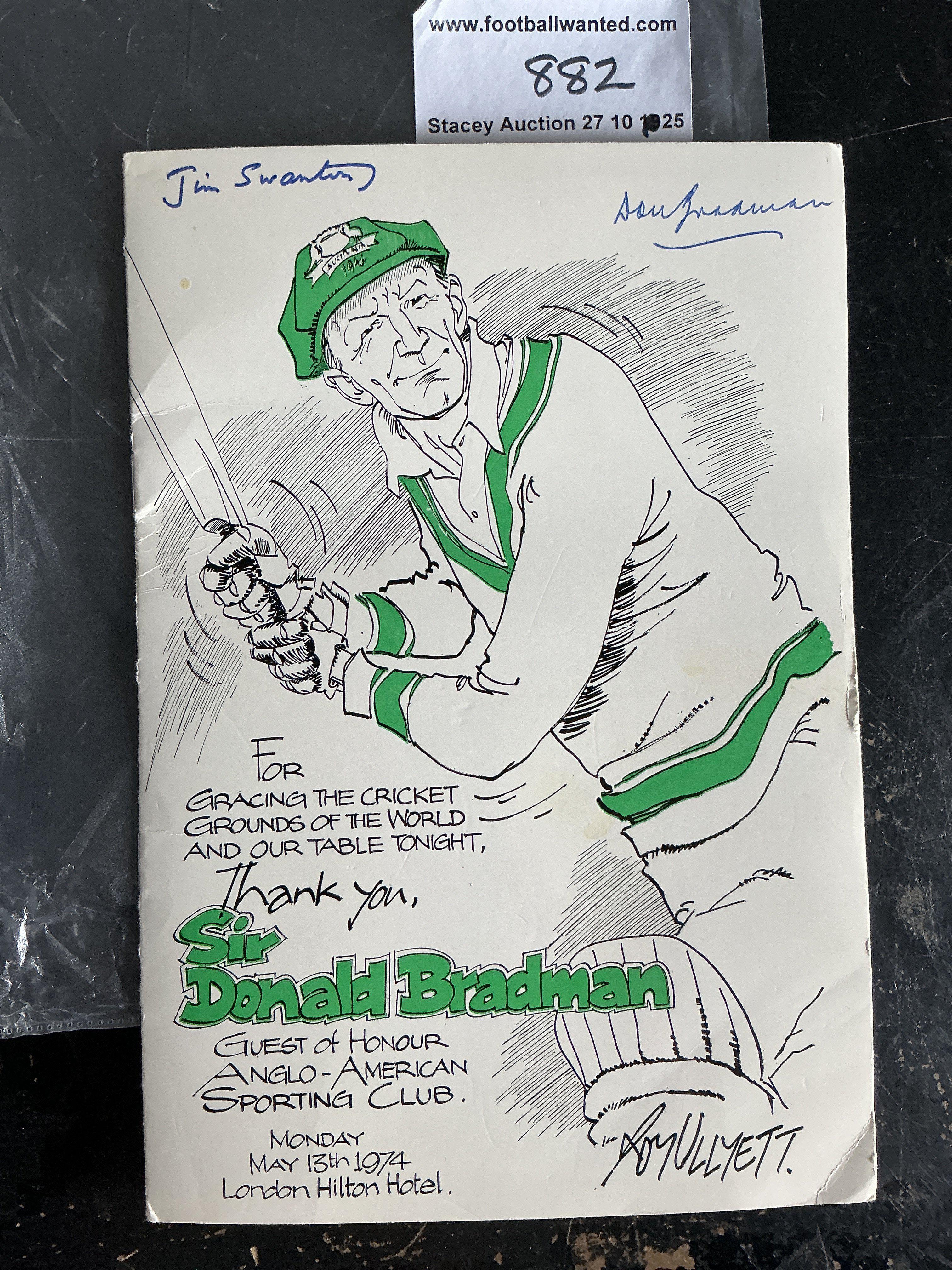 Don Bradman Signed Cricket Menu: 1974 Anglo American Boxing Dinner event from the Hilton London. Bradman is featured on the cover on cartoon by Roy Ullyett. Bradman has signed neatly in pen without dedication. Cricket journalist Jim Swanton has also signed. Writing inside. Nice item.