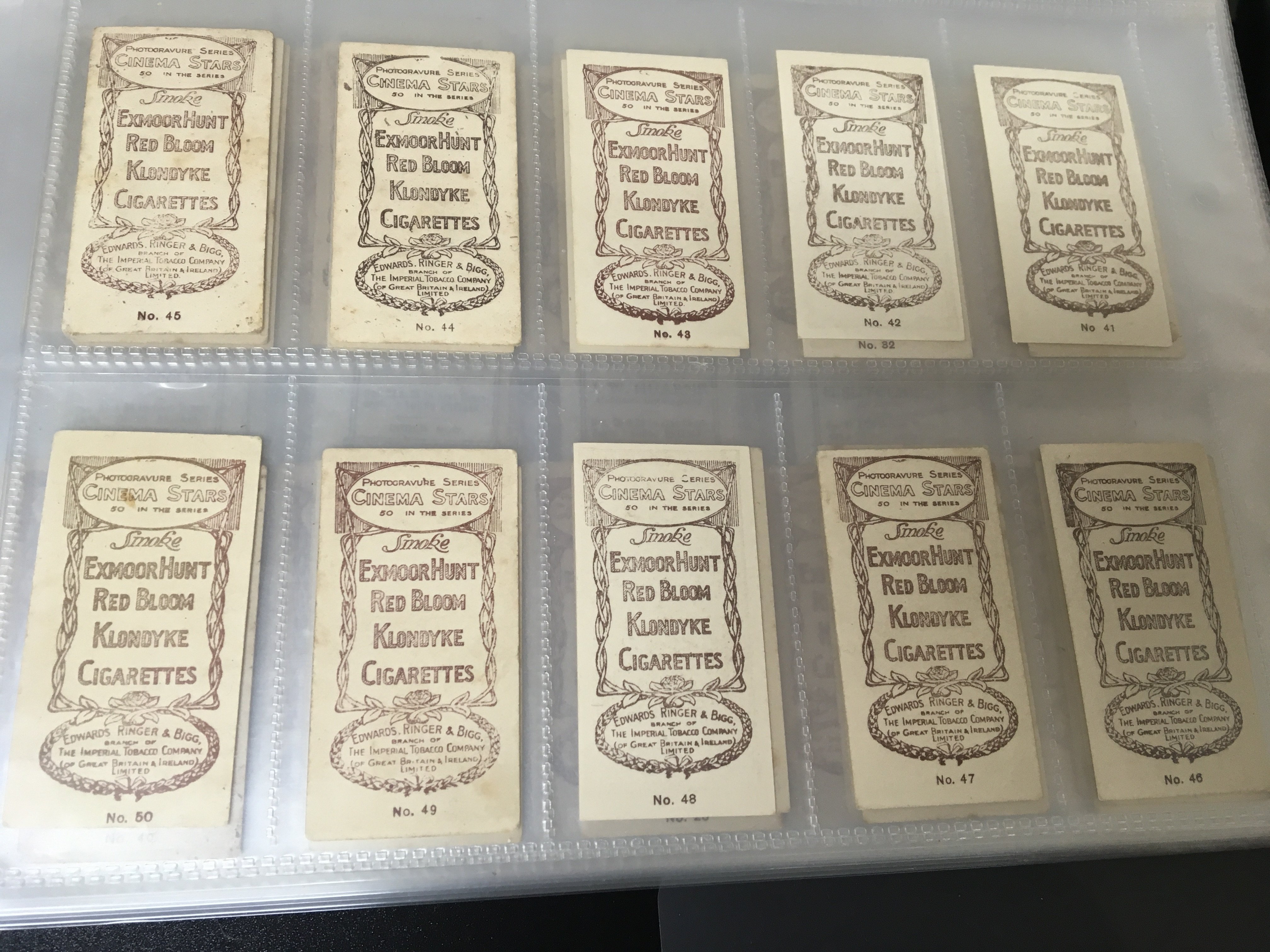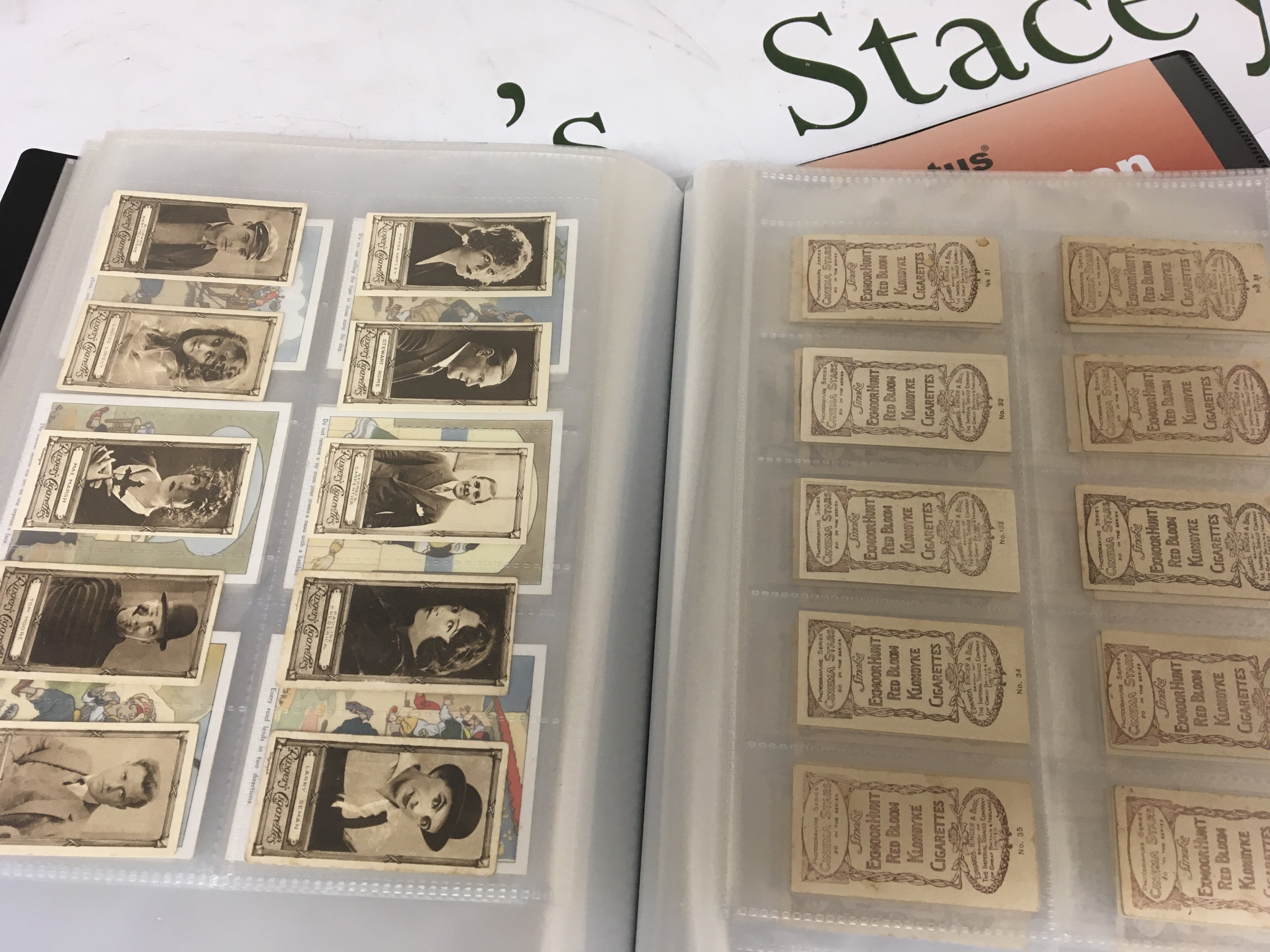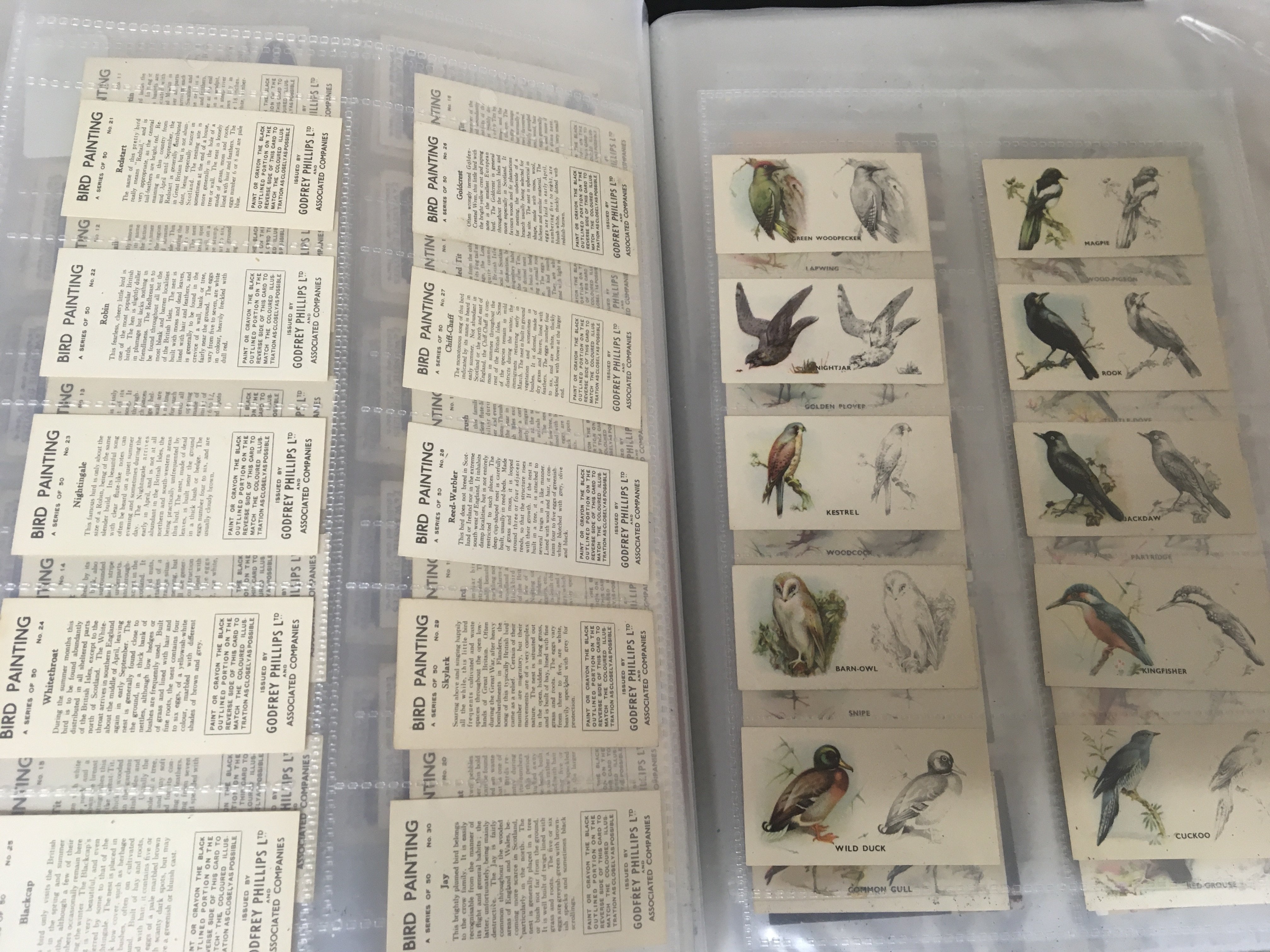Three well presented albums containing numerous vintage cigarette cards and other collectors cards including B.D.V Godfrey Phillips Test Cricket 1932/33 Screen Stars Bird Painting Adrath Tobacco Trooping the Colour Edwards Ringer & Bigg Cinema Stars and many other vintage sets. (3)