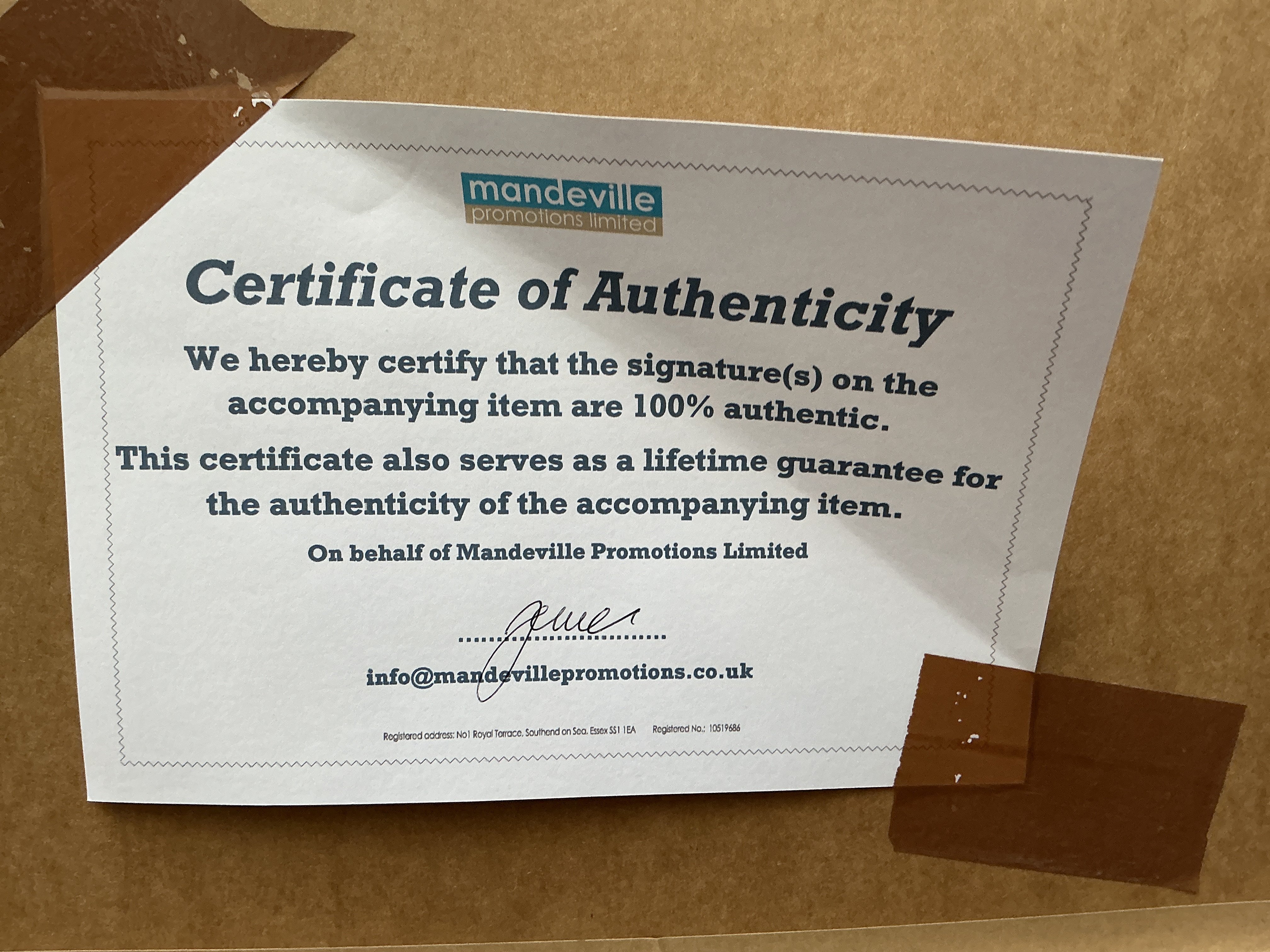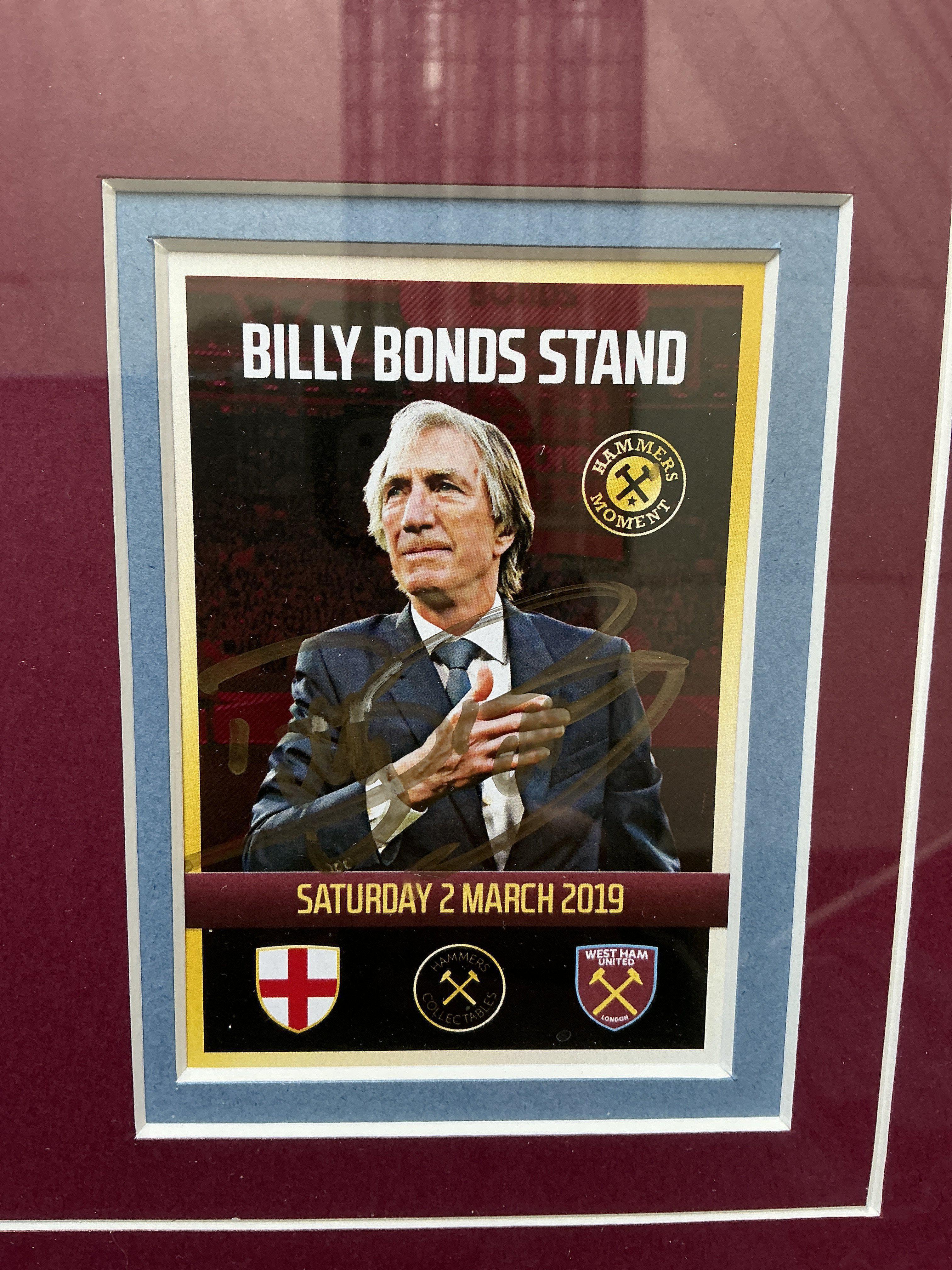 Billy Bonds Ground Opening West Ham Signed Framed Montage: Stunning 29 x 24 inch framed display of Billy Bonds featuring moments before the match when Bonds and his family came onto the pitch in 2019 when the Billy Bonds stand opened at the new stadium. A card headed Billy Bonds stand is signed by Bonds and comes with COA. Expensively framed with some heart warming photos of the great man.